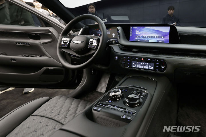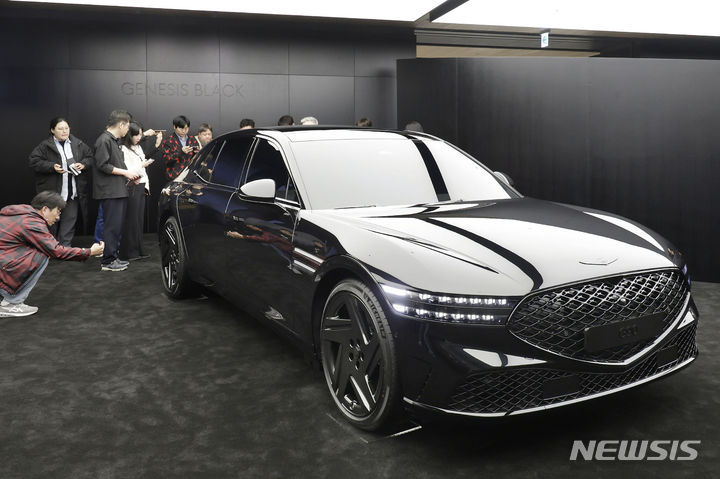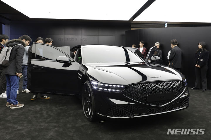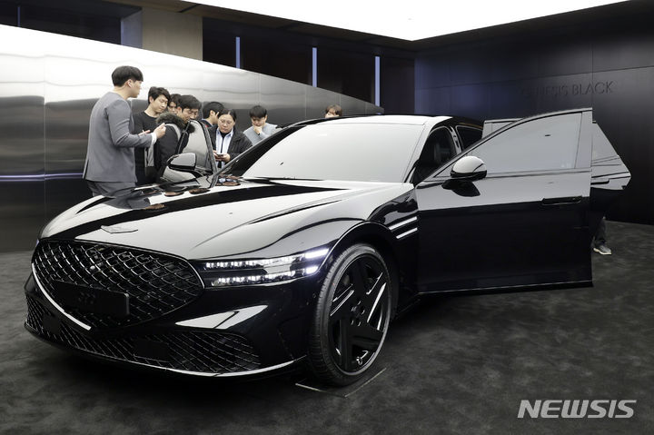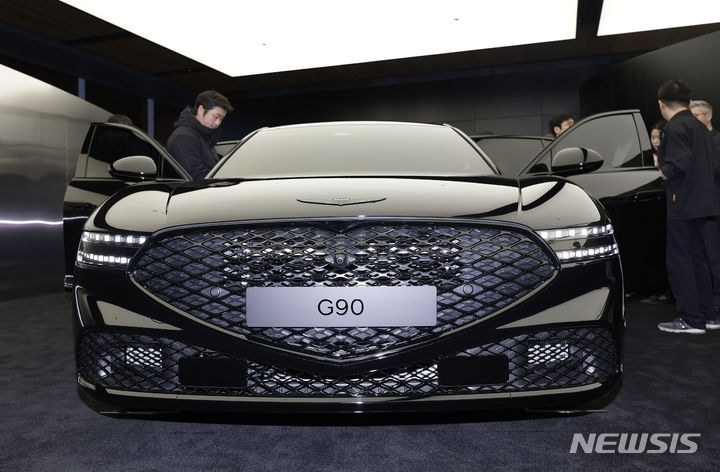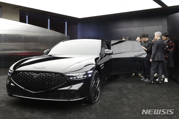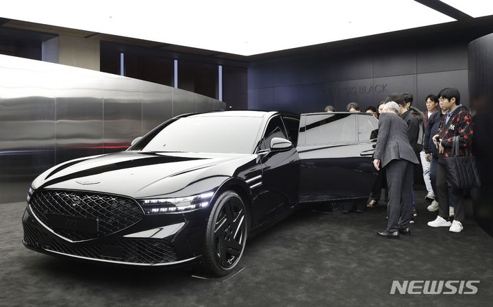 【NEWSIS】現代自動車では14日、京畿道竜仁市のジェネシス水枝展示館で、高級セダン「ジェネシスG90ブラック」のメディア・プレビューを開催した。写真は公開されたジェネシスG90ブラック。