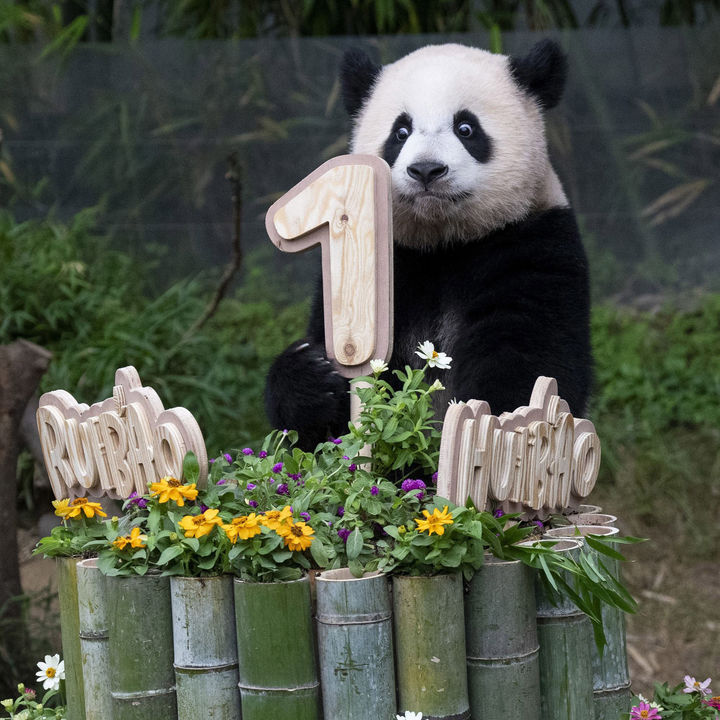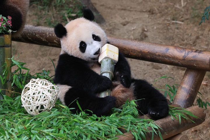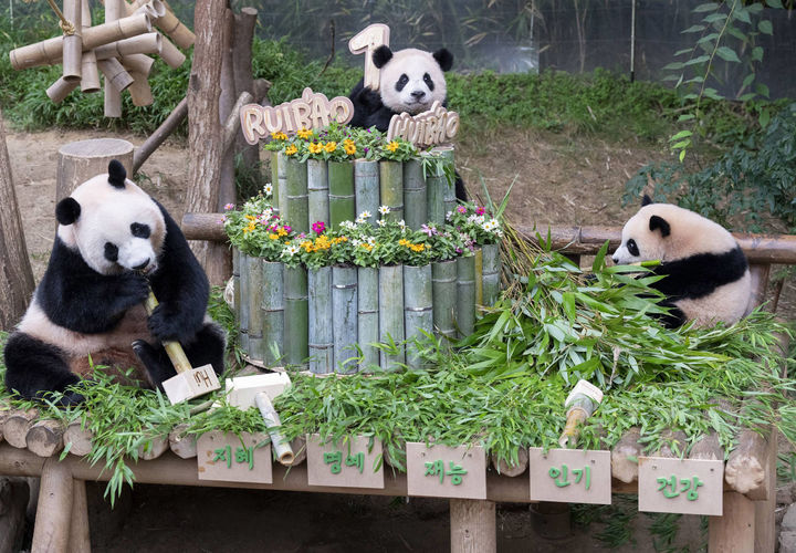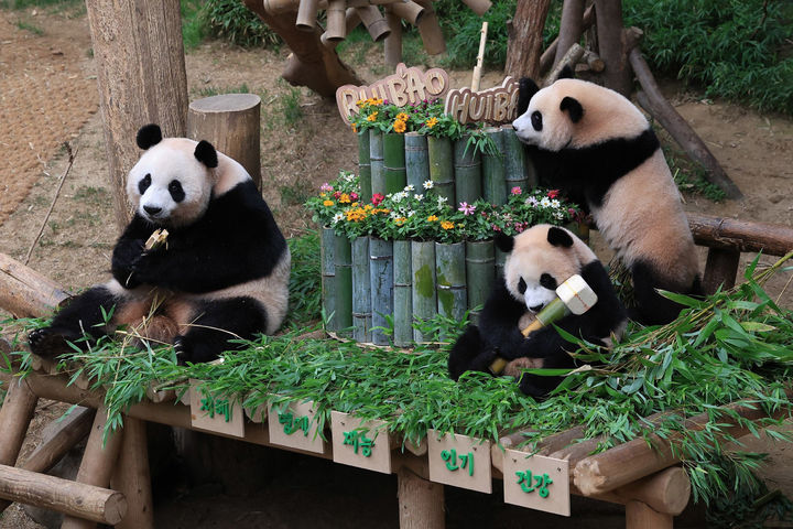 【NEWSIS】テーマパーク「エバーランド」では7日、双子のパンダ「睿宝(ルイバオ)」と「輝宝(フイバオ)」の満1歳の誕生日祝いを同園内の「パンダ・ワールド」で開いた。初めて手に取る物で将来を占う儀式で、睿宝は健康を意味する竹製の「ダンベル」を、輝宝は人気を意味する竹製の「マイク」を手に取ったとのことだ。