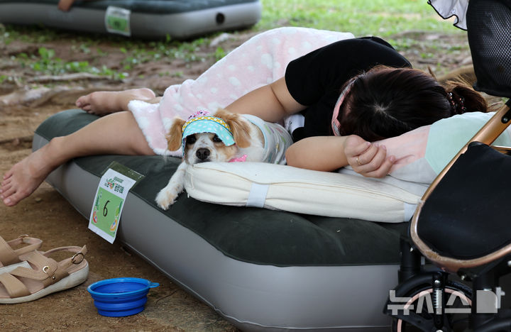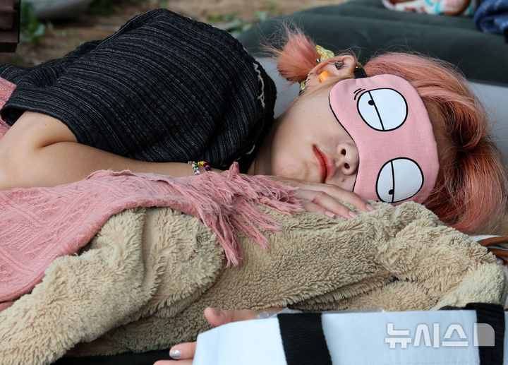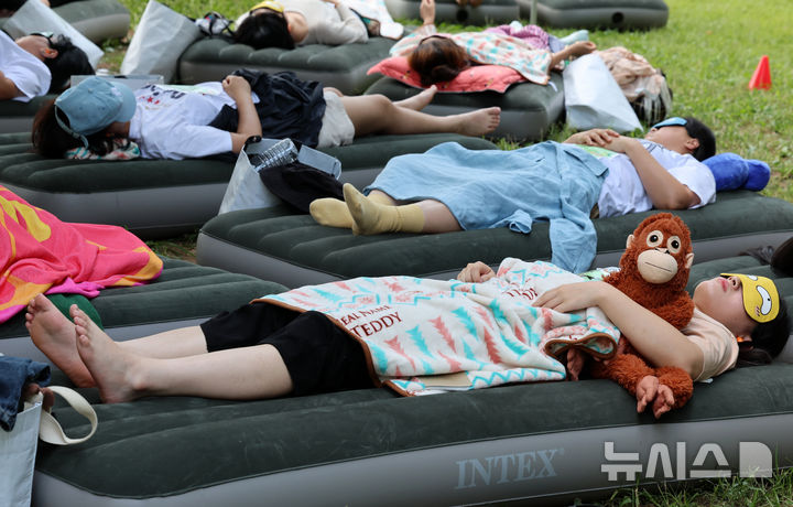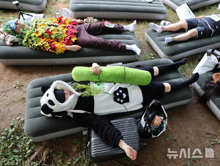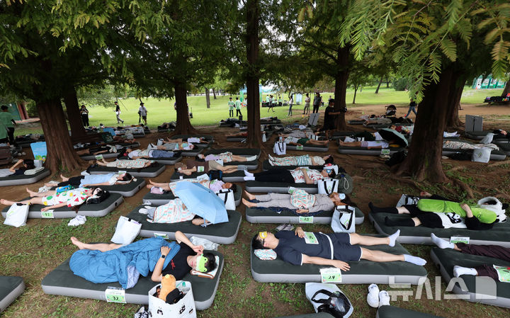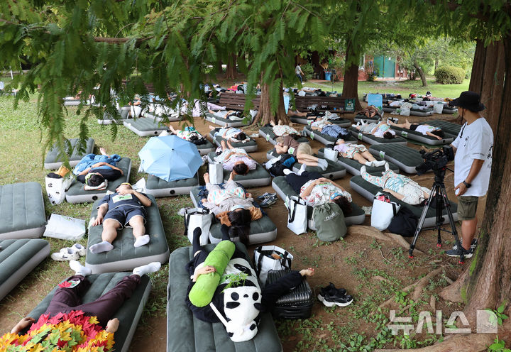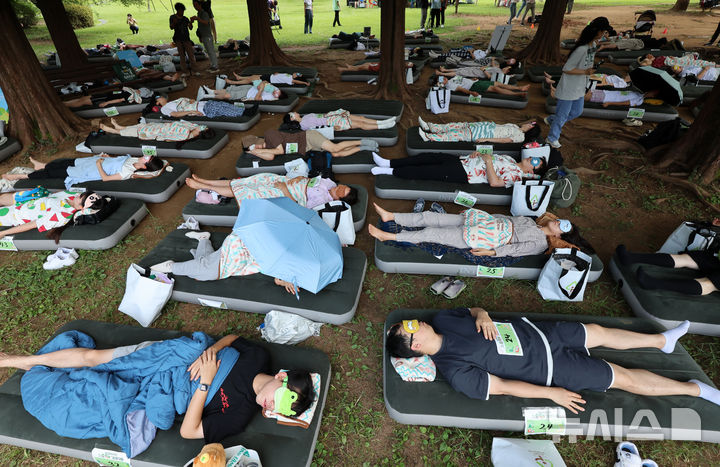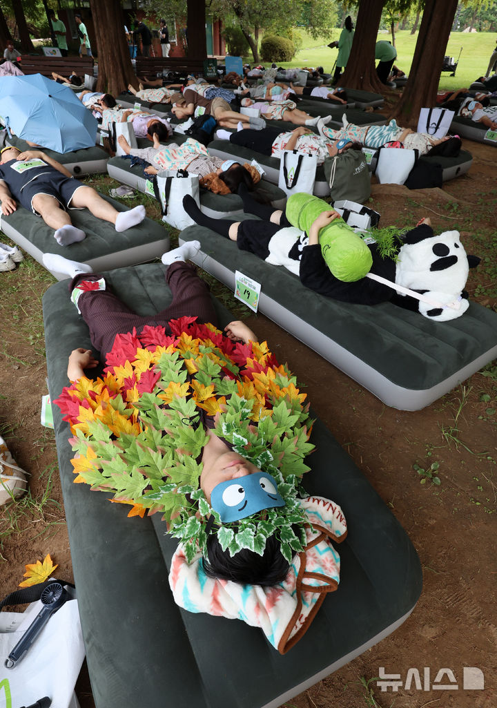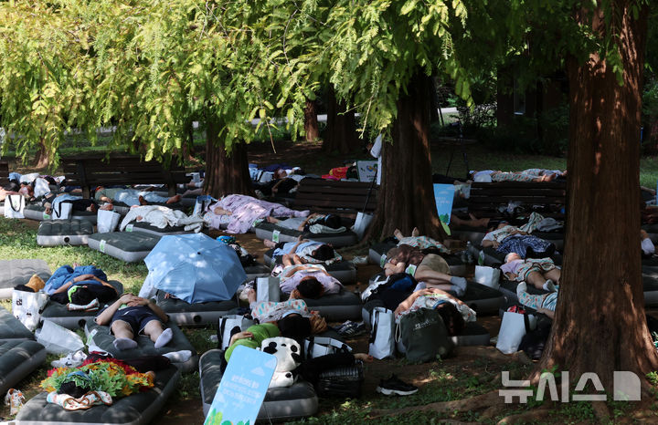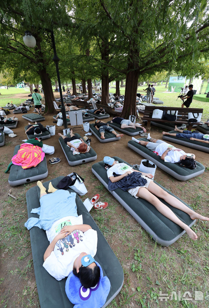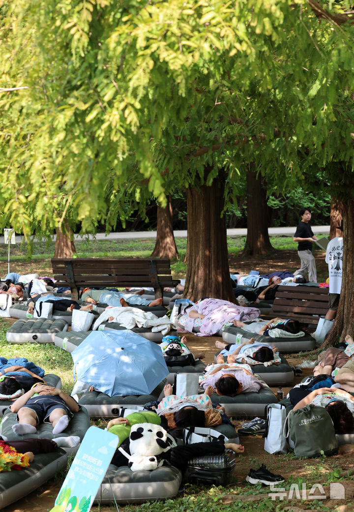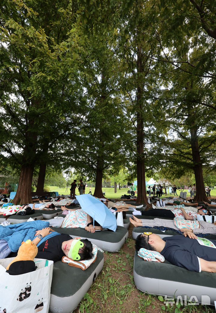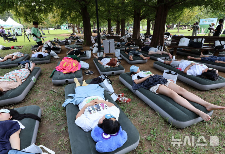 【NEWSIS】8日午後、ソウル市松坡区のソウルオリンピック公園ピクニック場で、韓国の大手日用品メーカー「柳韓キンバリー」が主催した「2024韓国の山と川を青く 森の中でぐっすり大会」が開催された。写真は昼寝をする参加者たち。