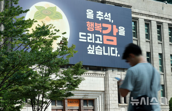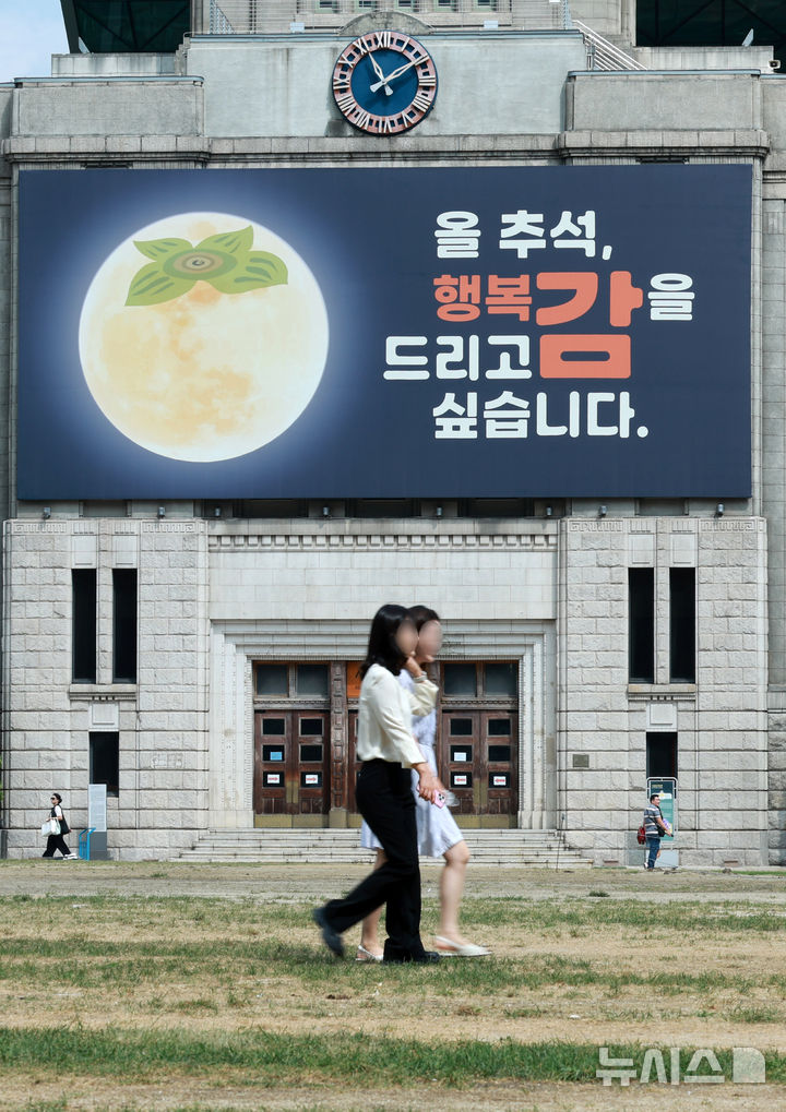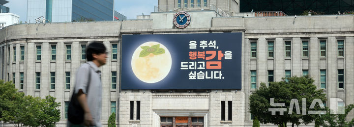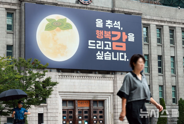 【NEWSIS】ソウル図書館(ソウル市中区)外壁の「夢を刻むパネル」が9日、満月を柿に見立てた「今年の秋夕、幸福カム(感。柿と同じ発音)を差し上げたいと思います」というものに掛け替えられた。