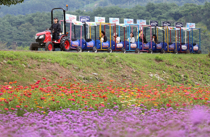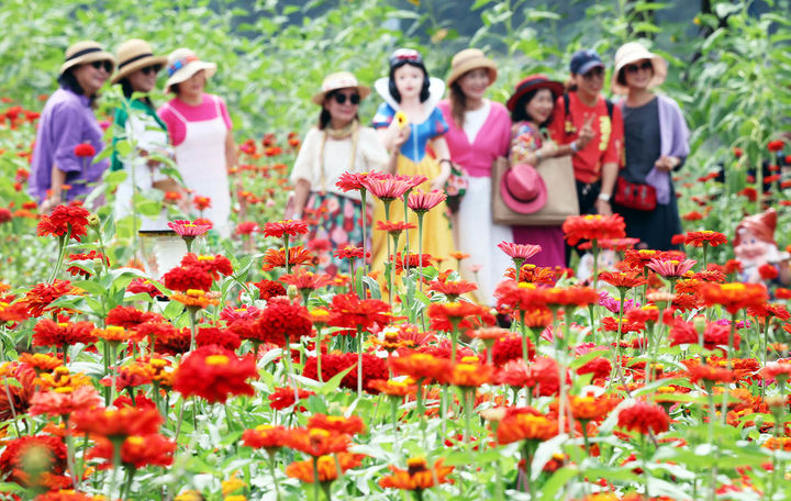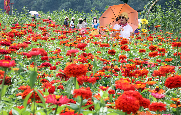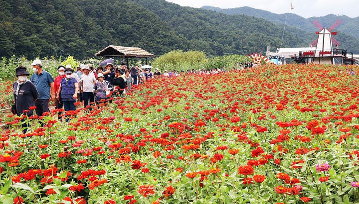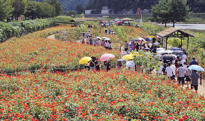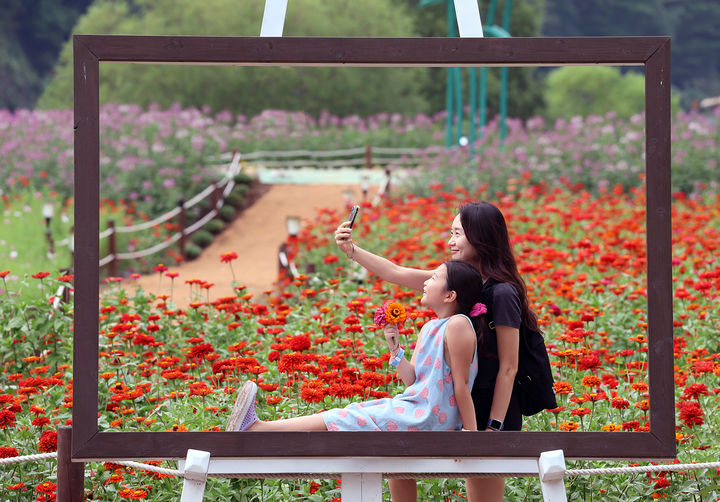 16日午後、秋夕(中秋節。今年は9月17日)の連休を迎えて大勢の人が江原道平昌郡平昌邑の平昌川沿いで開かれた「2024平昌百日紅祭り」の会場を訪れ、サルスベリが開花した花畑の様子を楽しんだ。今年の百日紅祭りは「韓国が始まる場所、平昌千万輪の百日紅と共に歩く秋の散策」をテーマに、今月22日まで行われる。