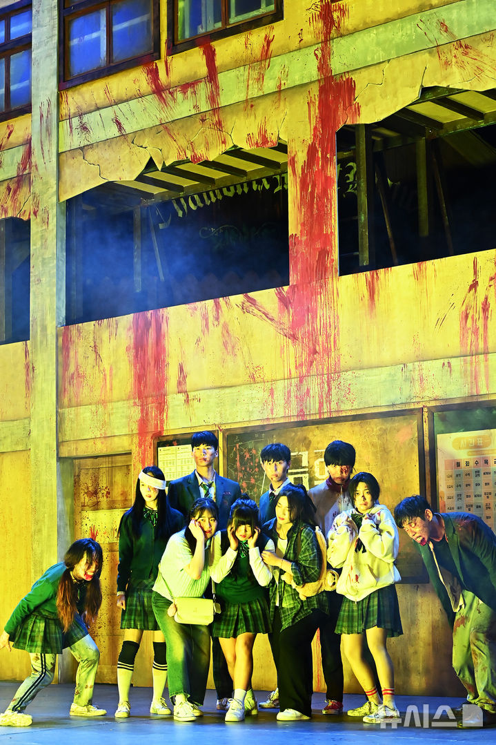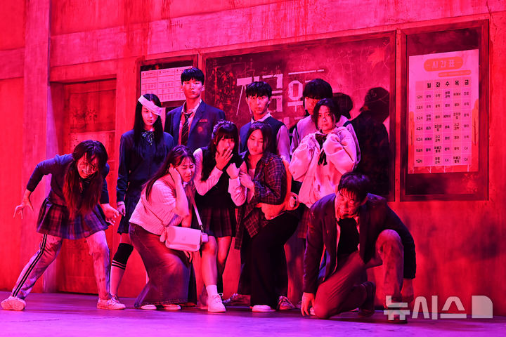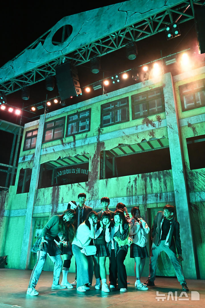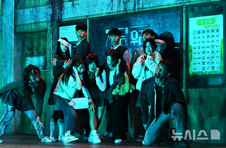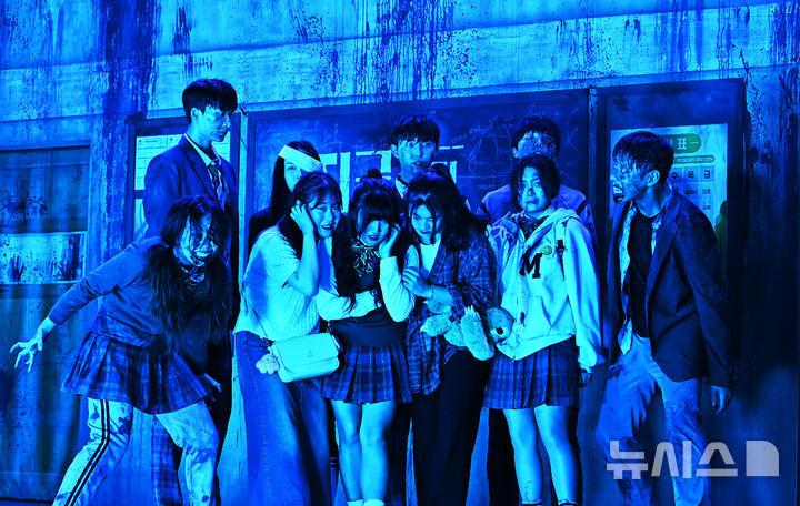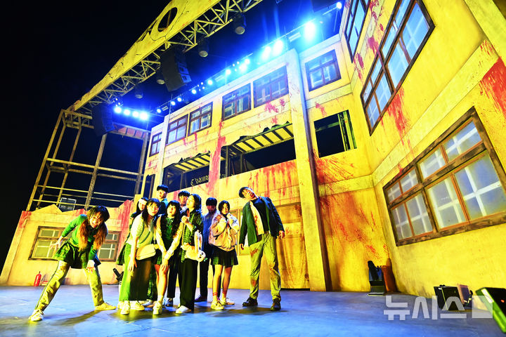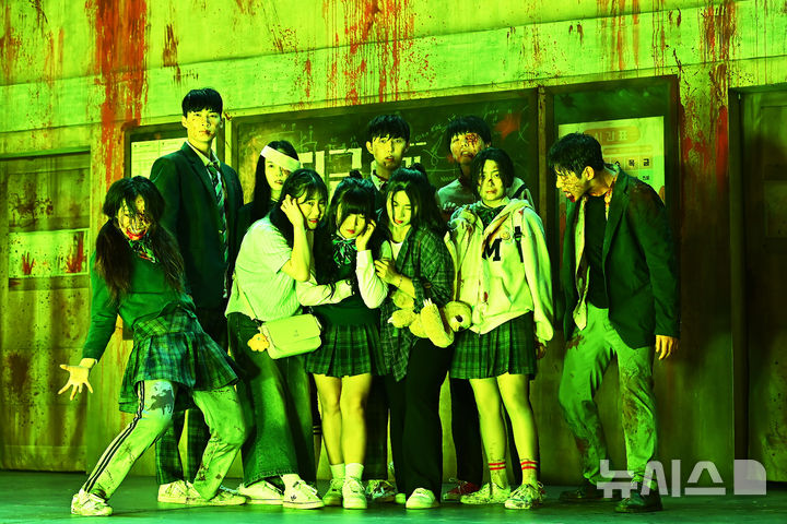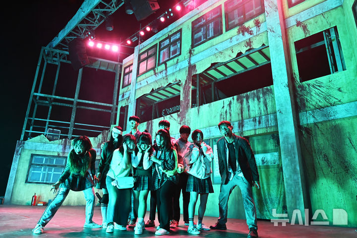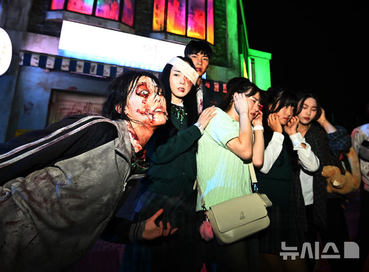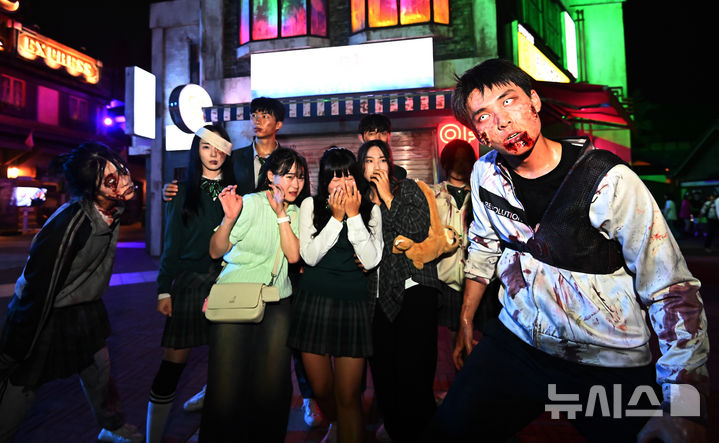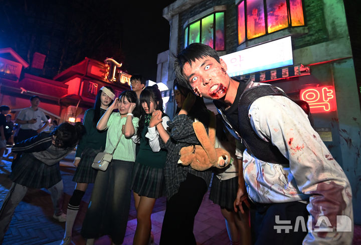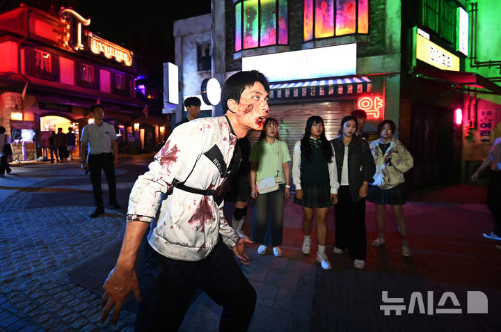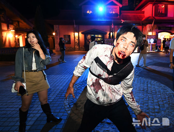 【NEWSIS】京畿道竜仁市内のテーマパーク「エバーランド」に恐怖テーマゾーン「ブラッドシティ」がオープンした。写真は19日夜、ゾンビに扮(ふん)した人々によるパフォーマンスの様子。