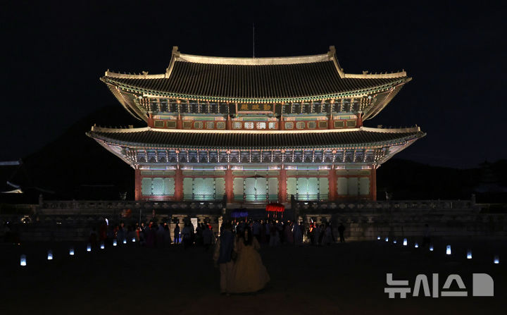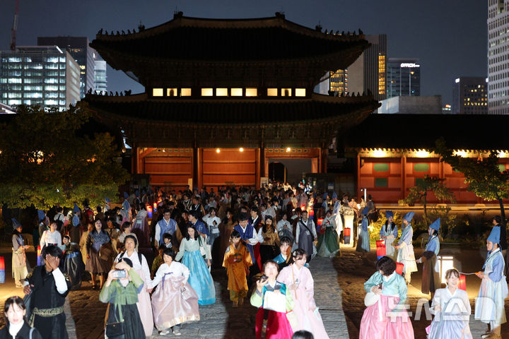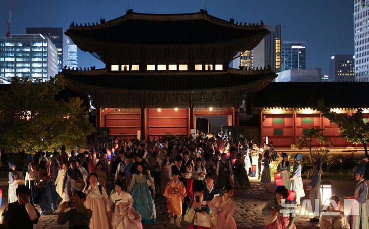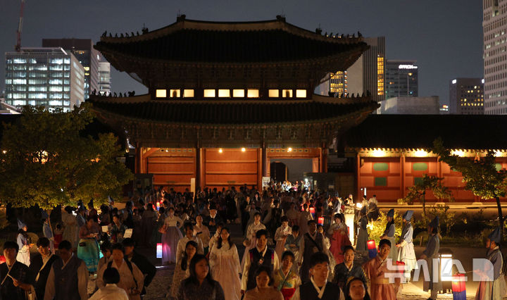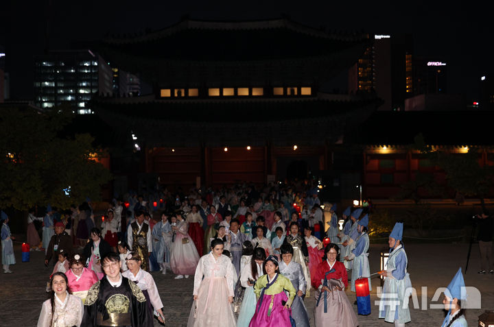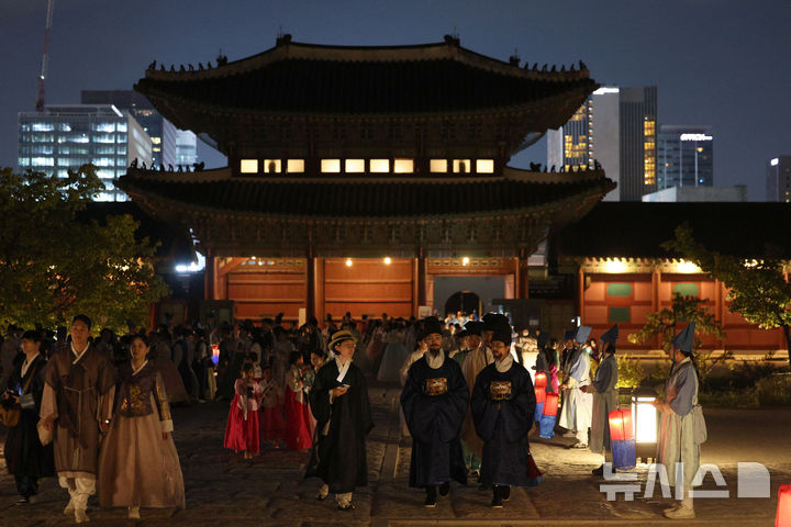 【NEWSIS】9日、ソウル市鍾路区の景福宮で「2024年秋の宮中文化祝典」が開幕した。写真は同日、祝典に参加するために韓服を着て入場する人々。韓国国家遺産庁の宮陵遺跡本部と国家遺産振興院は今月9日から13日まで、ソウル四大古宮(景福宮・昌徳宮・昌慶宮・徳寿宮)で「2024年秋の宮中文化祝典」を開催する。今年で10周年を迎えた宮中文化祝典は、古宮でさまざまな伝統文化が楽しめる韓国最大の文化遺産祭りだ。