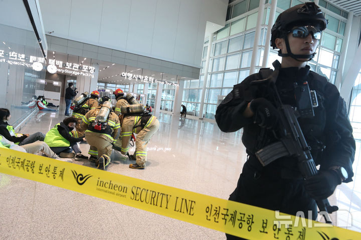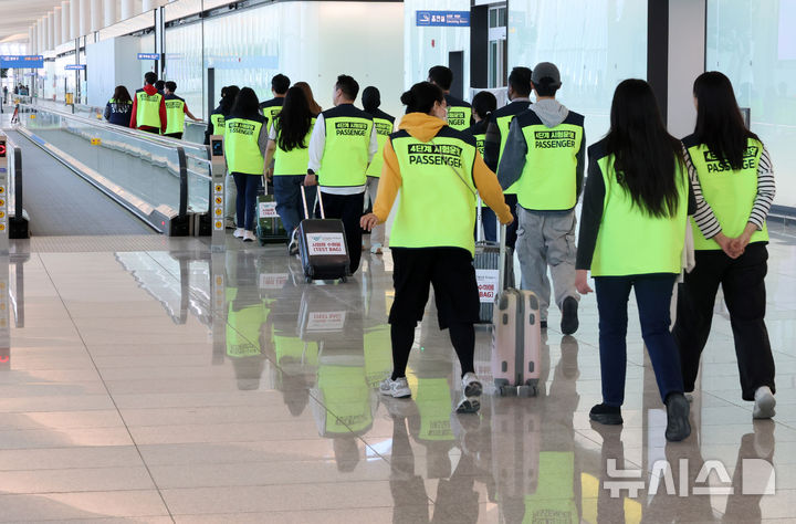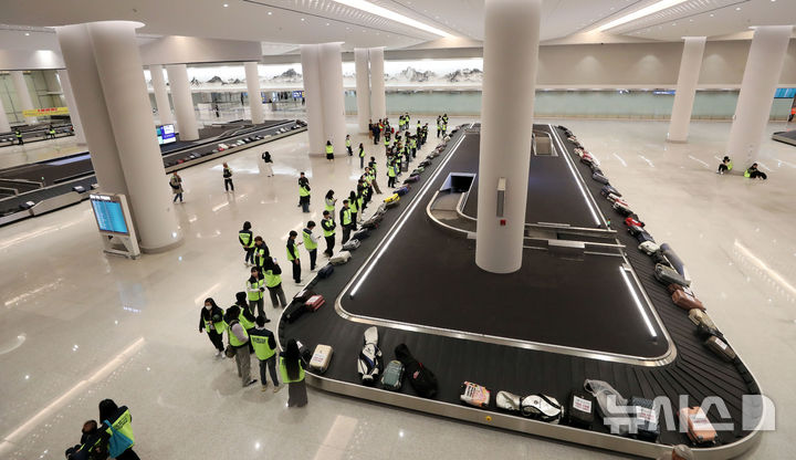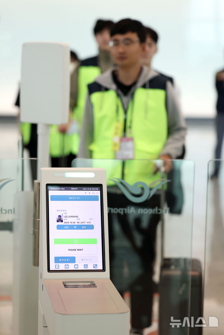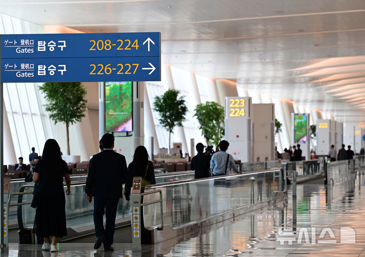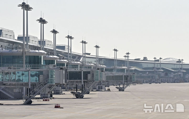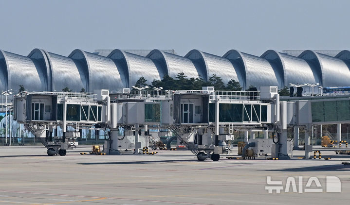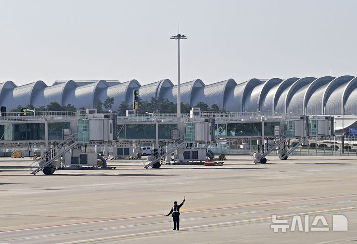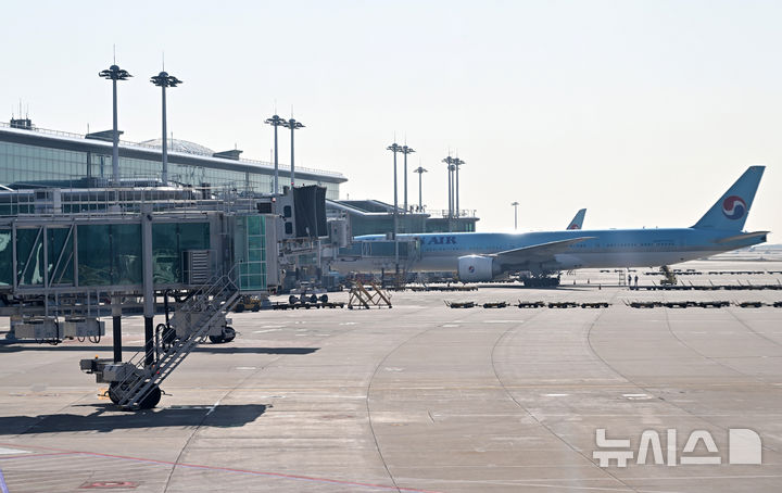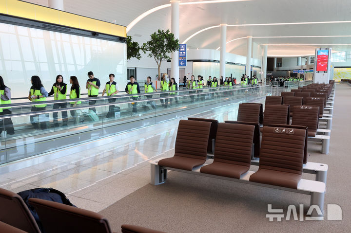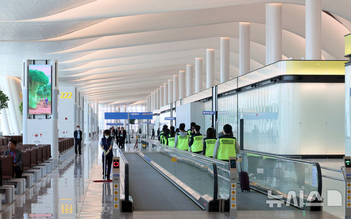 【NEWSIS】仁川国際空港第2旅客ターミナルで30日に行われた第4段階運営準備現場点検で、李鶴宰(イ・ハクジェ)仁川空港公社社長、禹基洪(ウ・ギホン)大韓航空社長などを乗せた大韓航空ボーイング777型機が地上移動を行った際、機内から見えた仁川空港第2旅客ターミナルの拡張地域の様子。