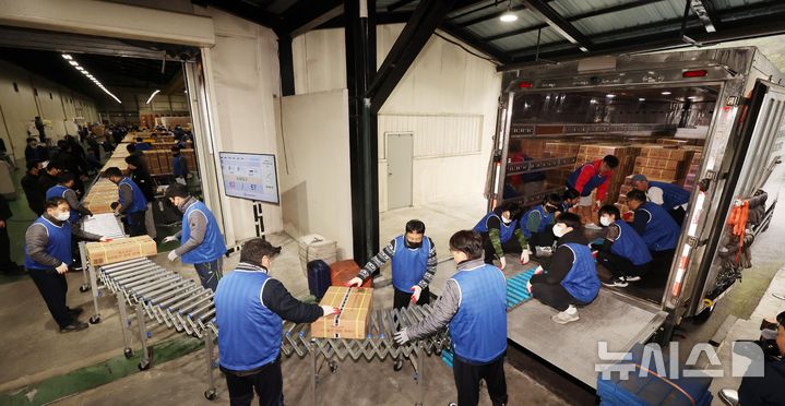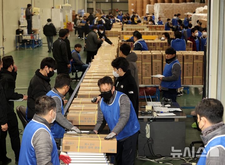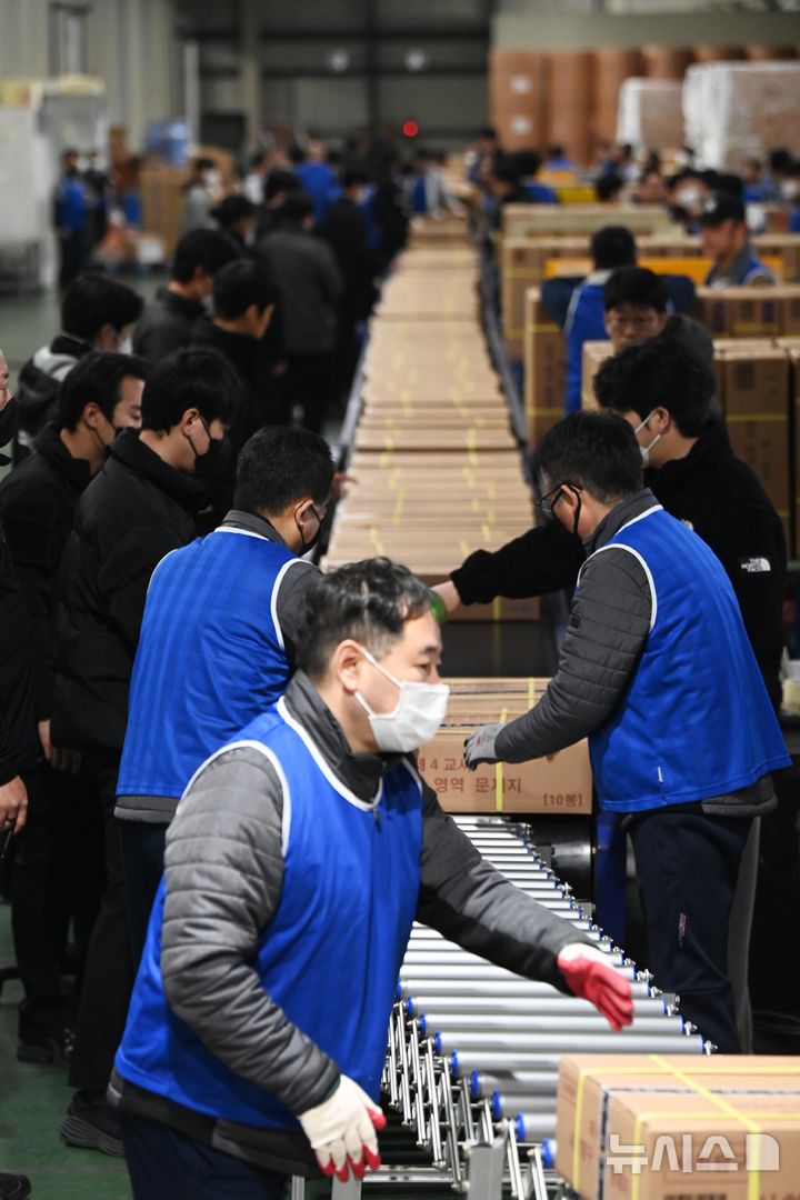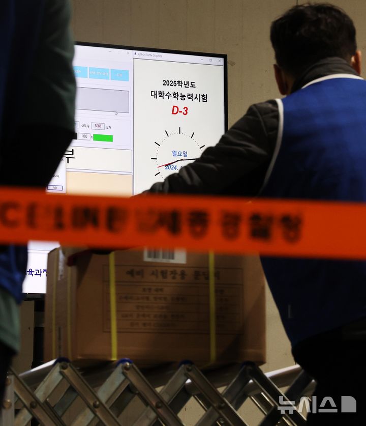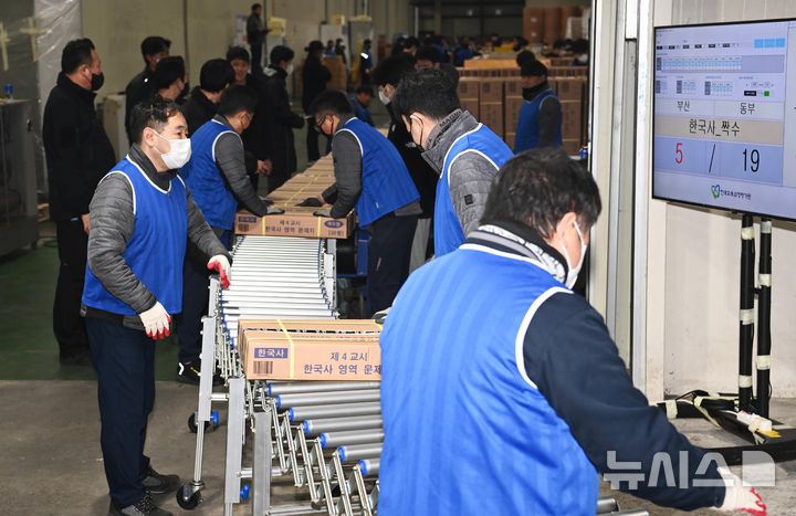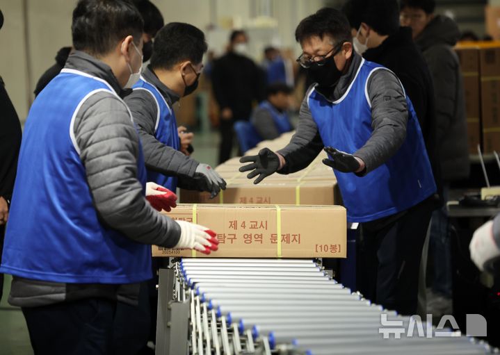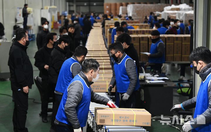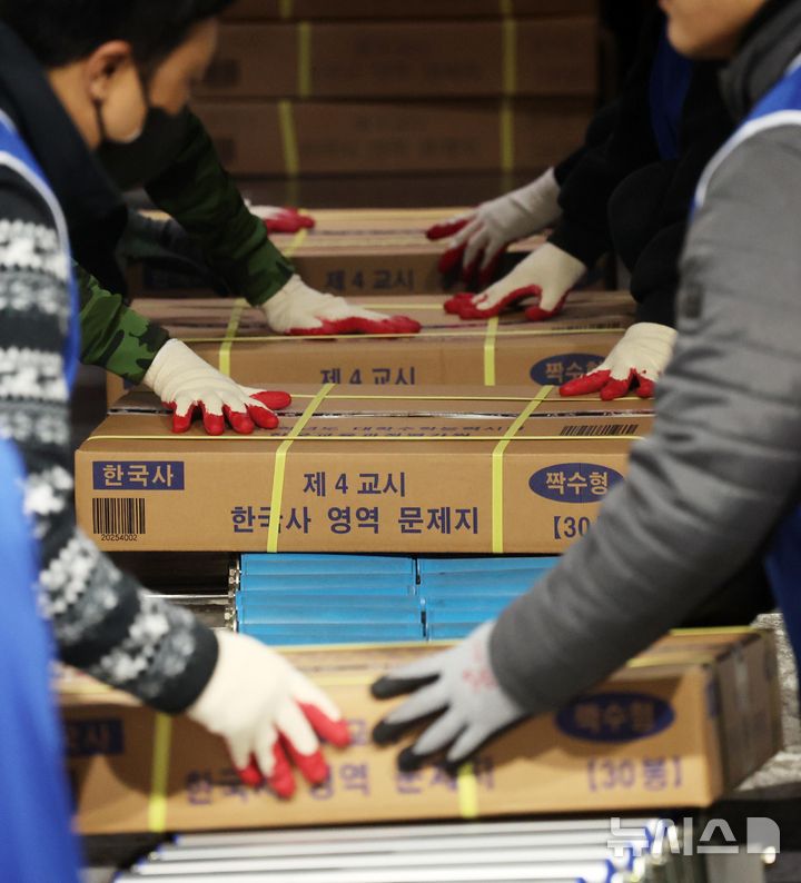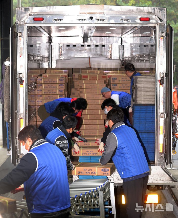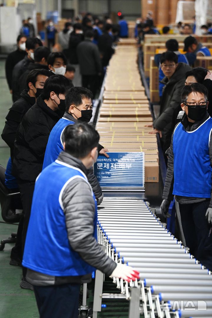 【NEWSIS】2025入学年度の大学修学能力試験(日本の大学入学共通テストに相当)日まであと三日となった11日、世宗市のある印刷工場から韓国全国の試験地区に配送される修学能力試験の問題用紙と解答用紙。写真=共同取材団