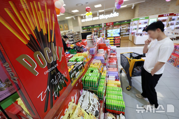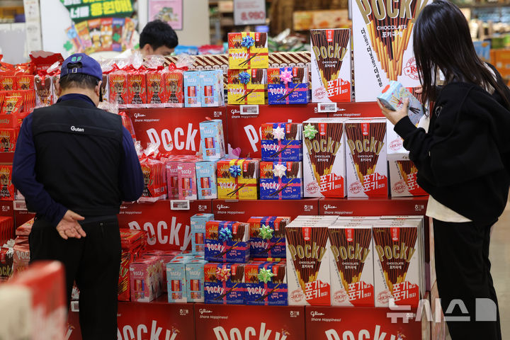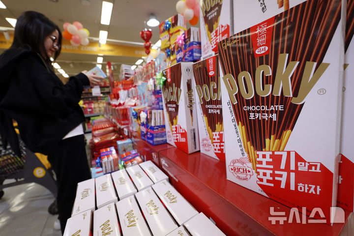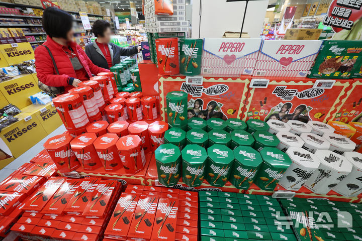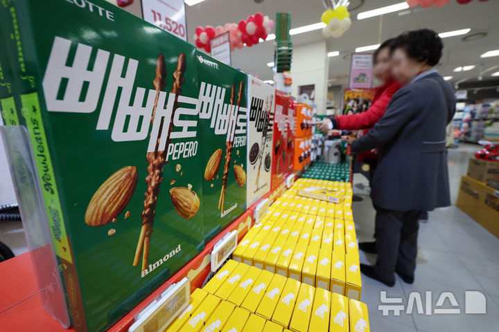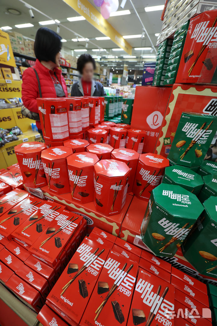【NEWSIS】ペペロ(韓国版ポッキー)を親しい人に贈る「ペペロデー」の11日午後、ソウル市内のある大手スーパーでは、来店した人々がロッテのペペロ製品を選んでいた。