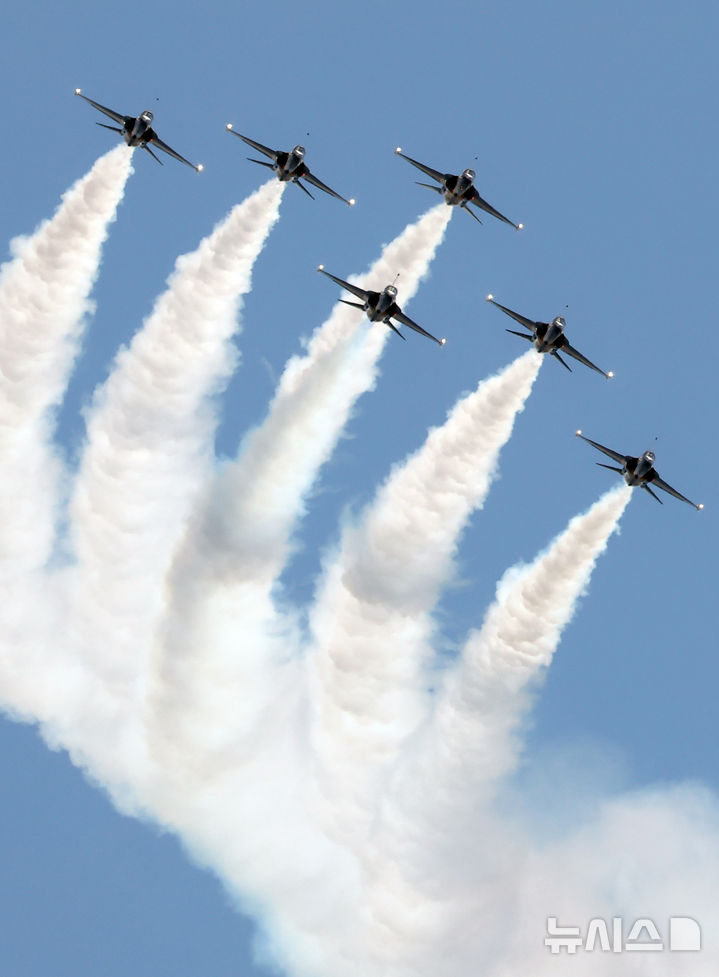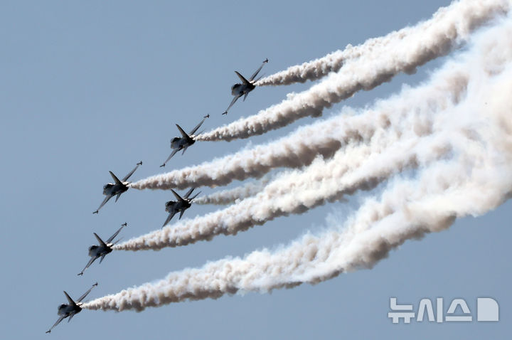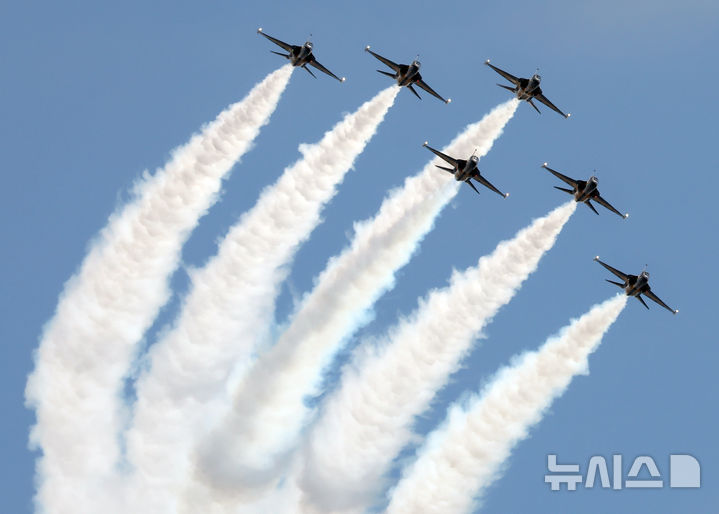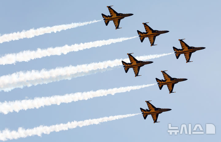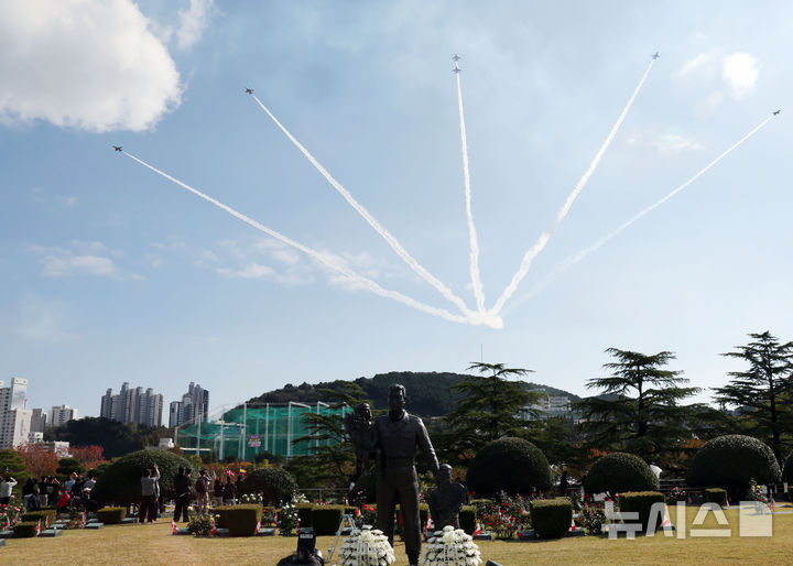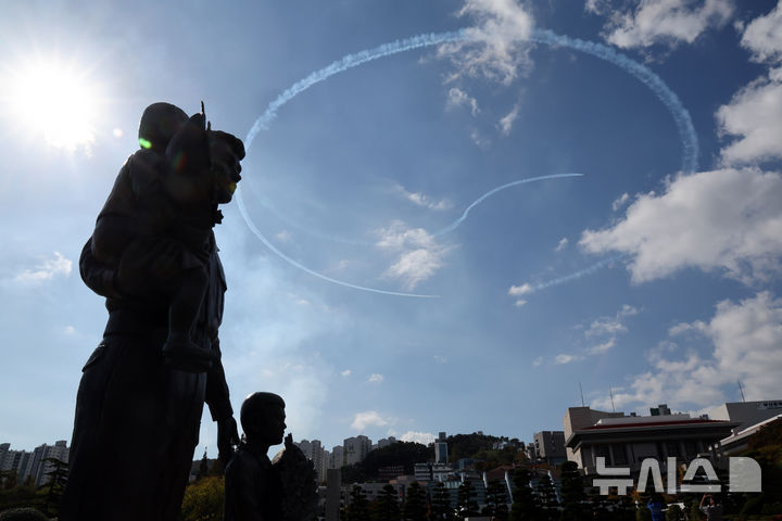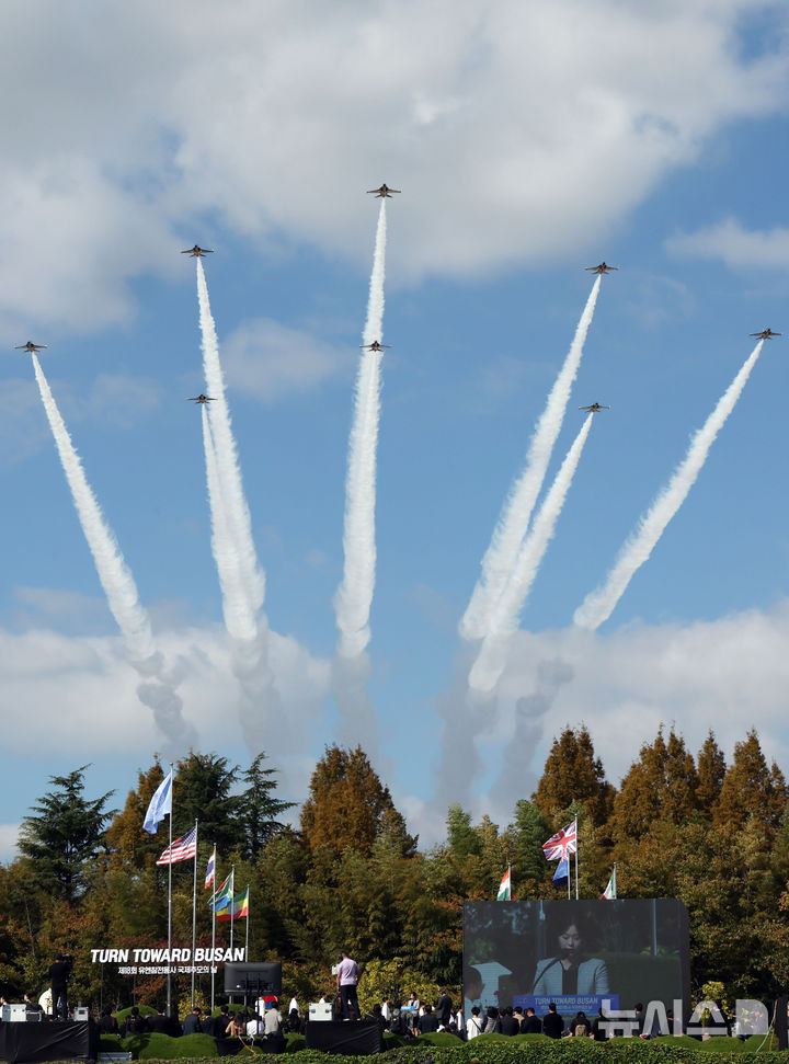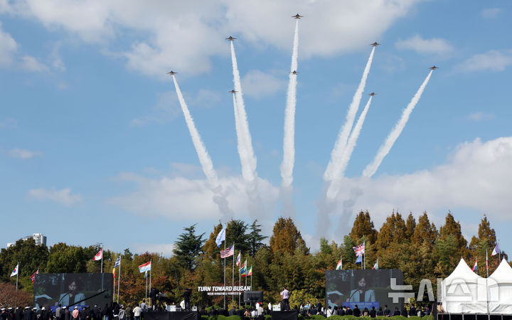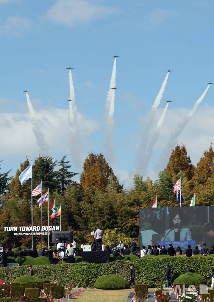 【NEWSIS】第18回国連参戦勇士国際追悼の日記念式典「TURN TOWARD BUSAN」が行われた11日、釜山市南区の国連記念公園上空で、韓国空軍の特殊飛行チーム「ブラックイーグルス」が追悼飛行を行っている様子。