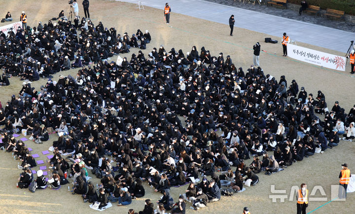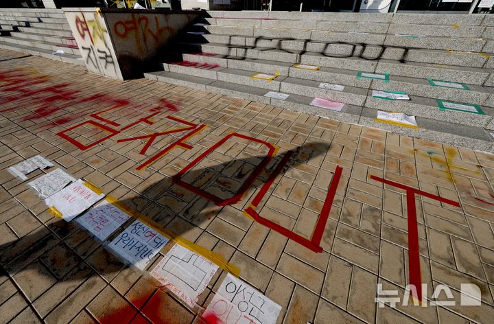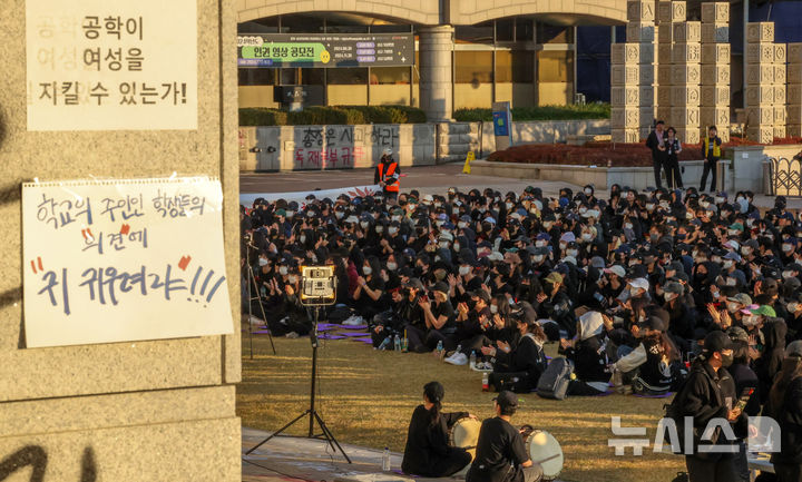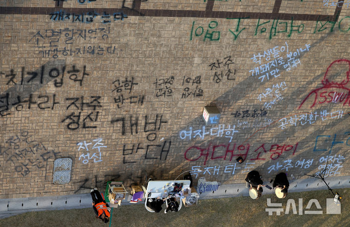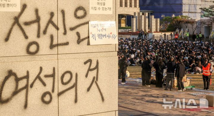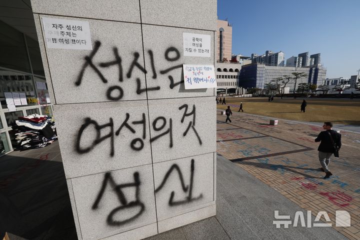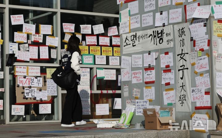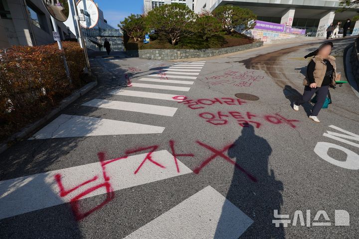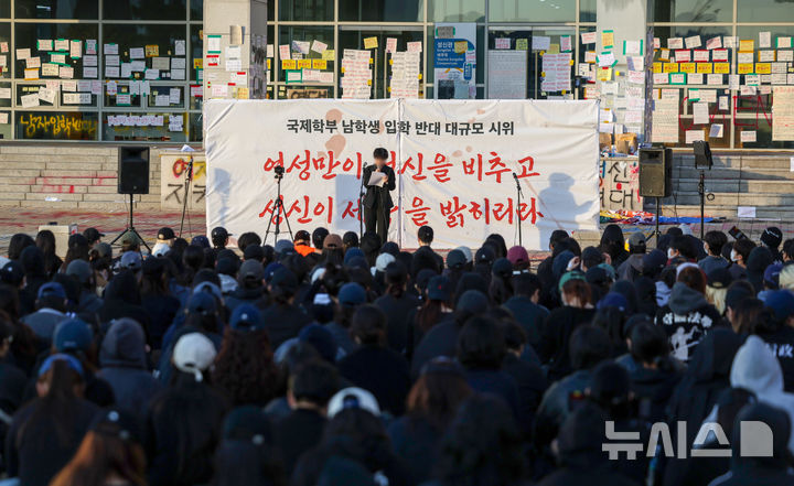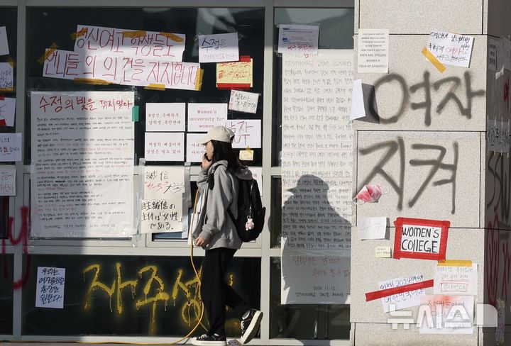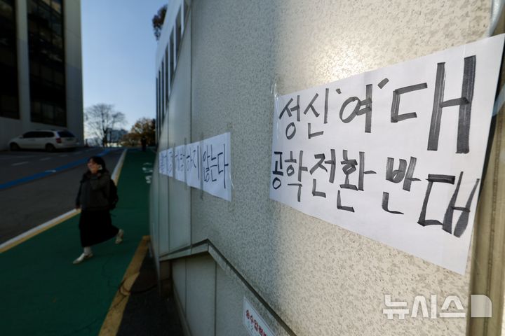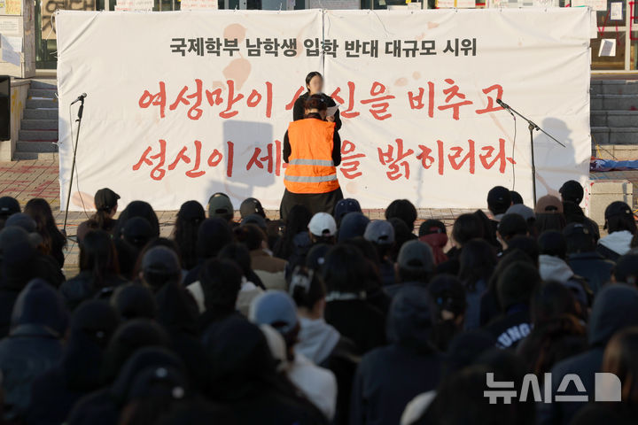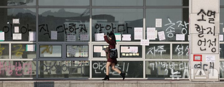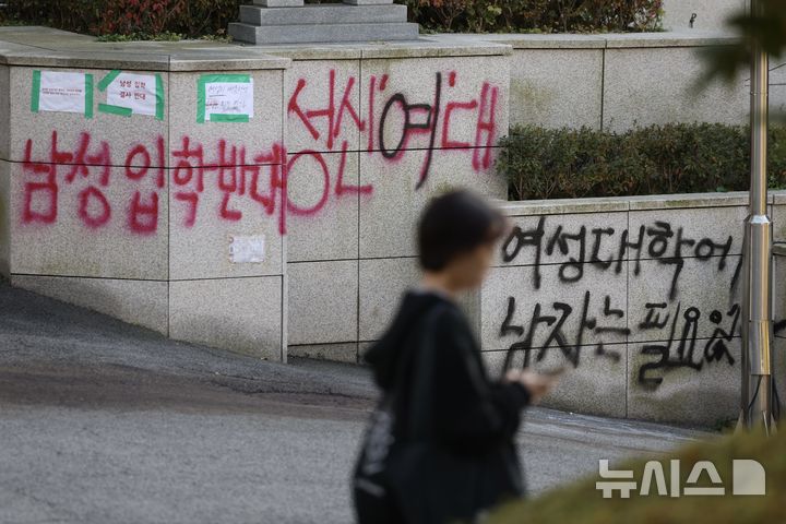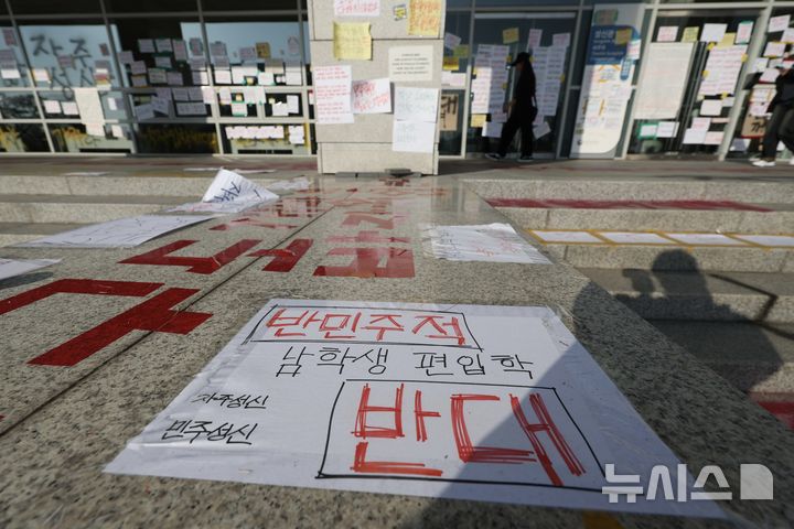 ソウル市城北区の誠信女子大学誠信館には15日、国際学部への男子学生の入学を反対する内容が書かれていた。