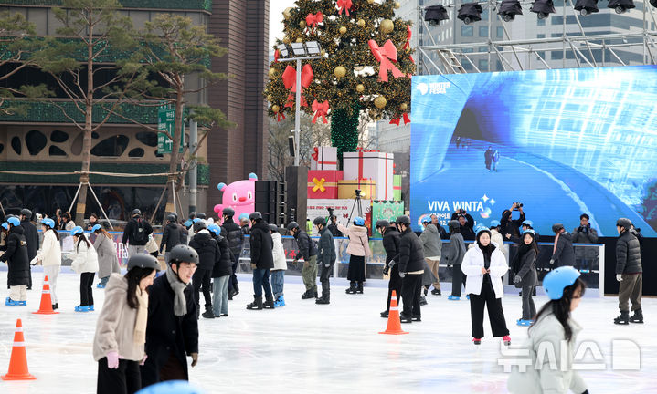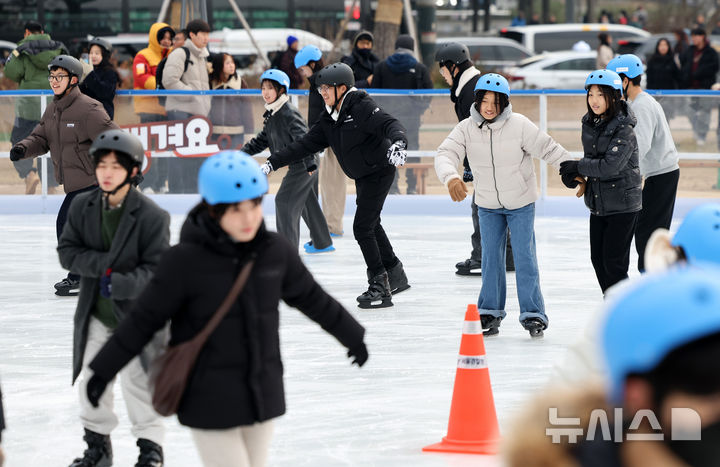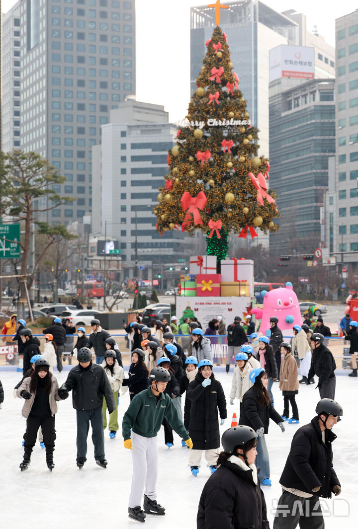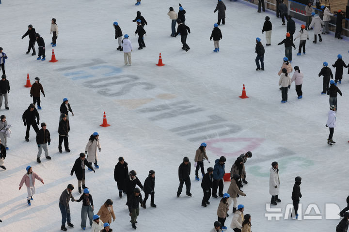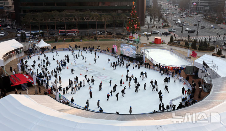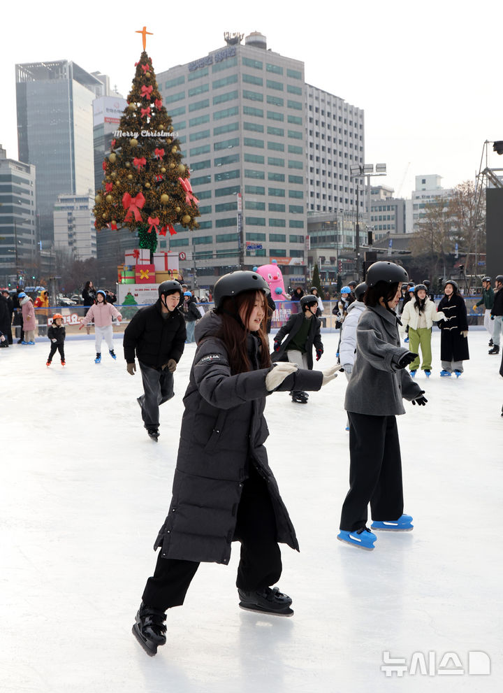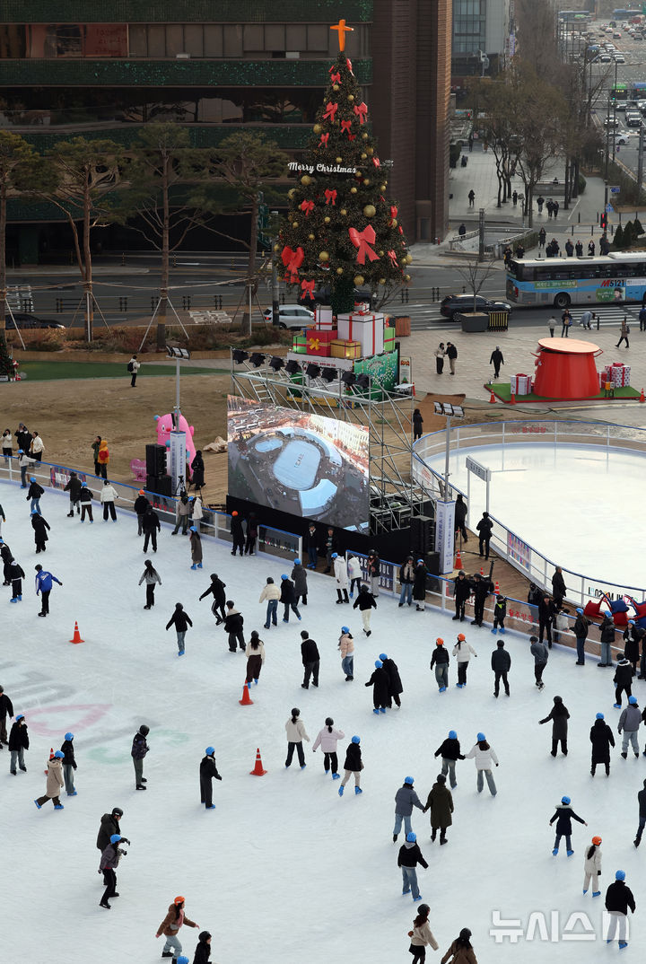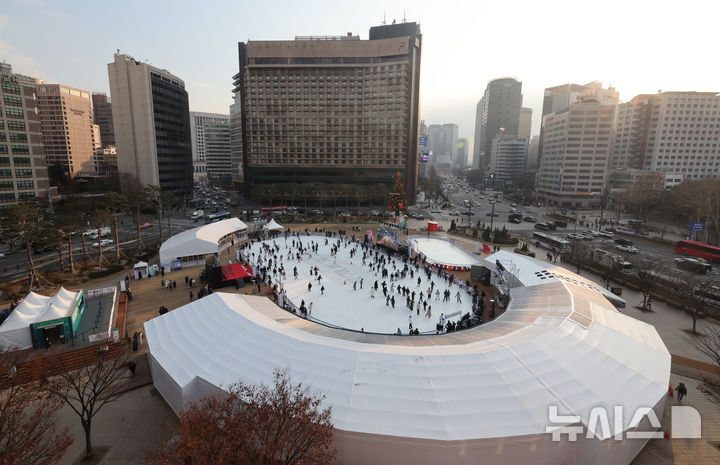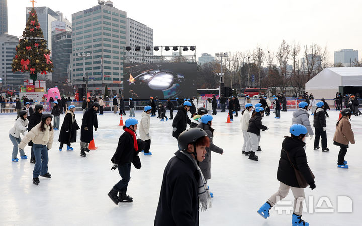 【NEWSIS】20日午後、ソウル市中区のソウル広場に臨時開業した「ソウル広場スケート場」で、市民がスケートを楽しんでいる様子。ソウル市は20日夕刻のオープン式典を皮切りに、来年2月9日まで52日間、スケート場を運営する。