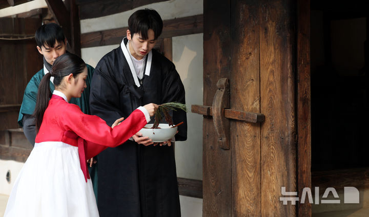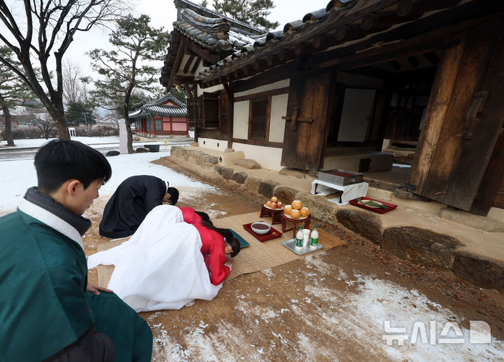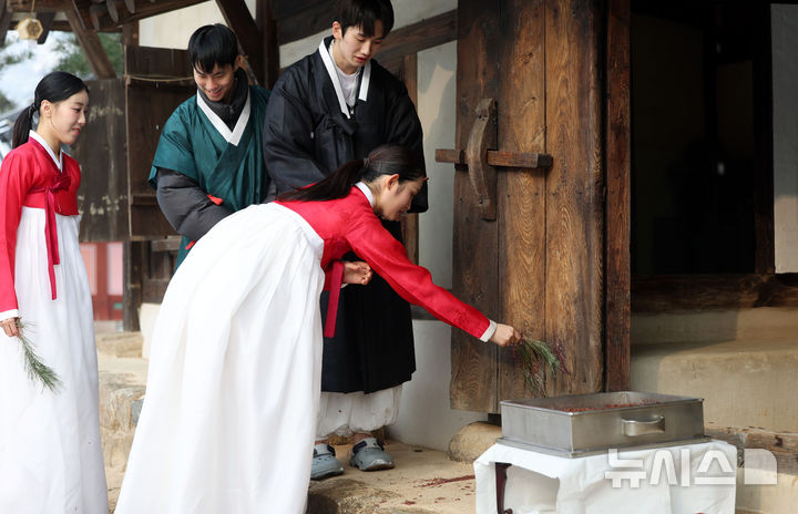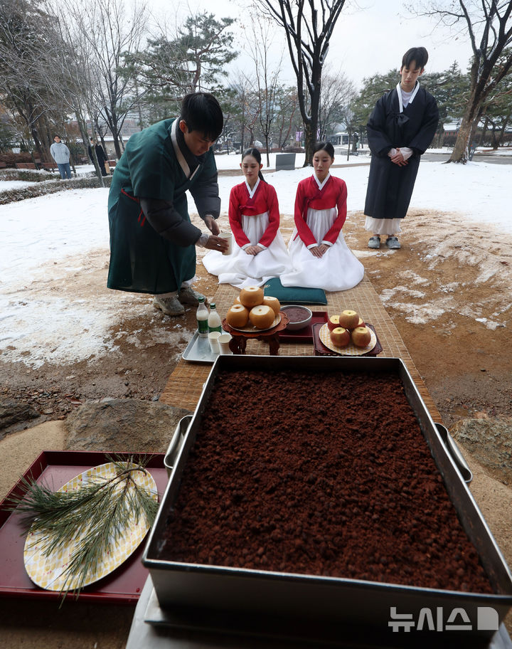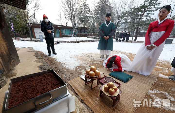 一年のうち最も夜が長く最も昼が短いとされる冬至に当たる21日午前、ソウル市鍾路区の国立民俗博物館で冬至のイベントが開催され、関係者たちが梧村宅の前で、伝統的な年中行事を継承する意味で小豆粥を用いた祭祀を行う様子。
