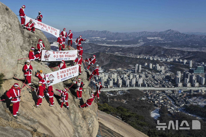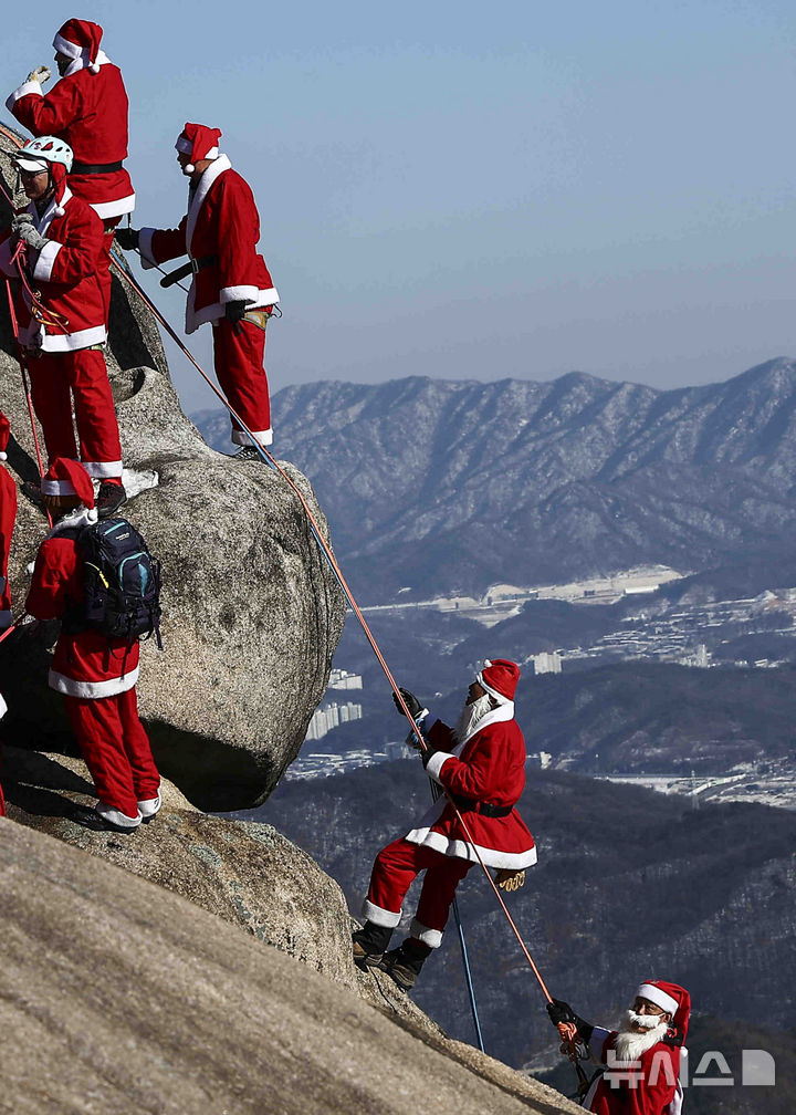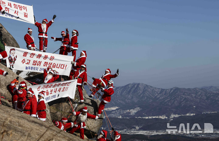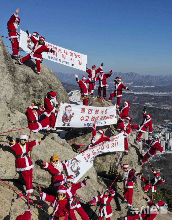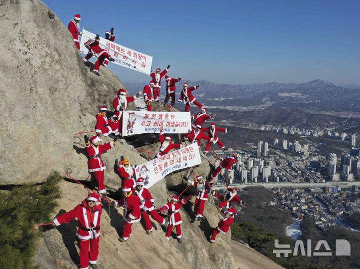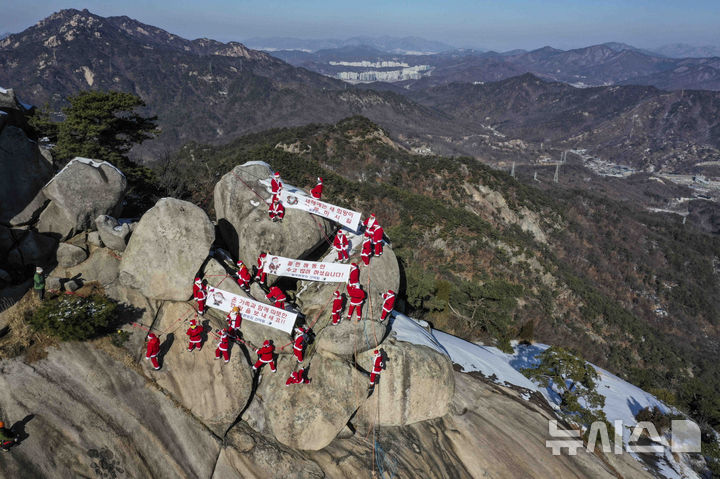 【NEWSIS】22日午後、京畿道南楊州市の仏巌山の頂上で、サンタクロースの服を着て安全な登山を祈願し、新年を迎えるパフォーマンスをする韓国国立公園山岳安全支援団所属のメンバーたち。