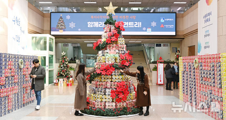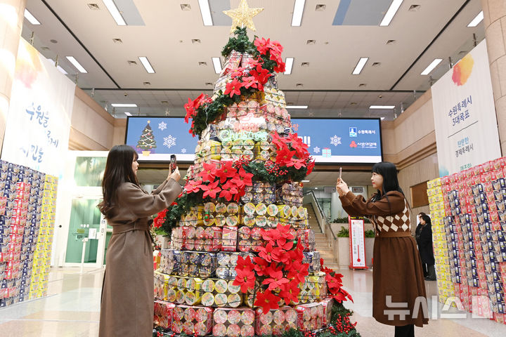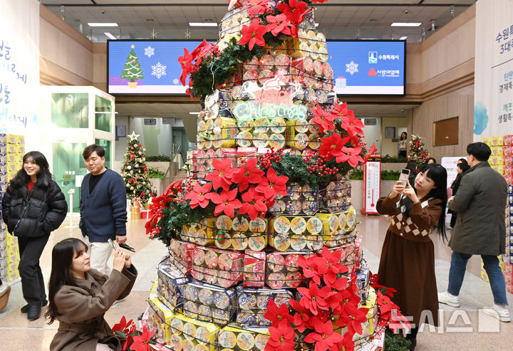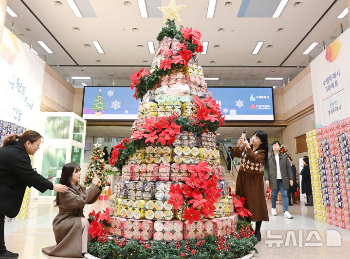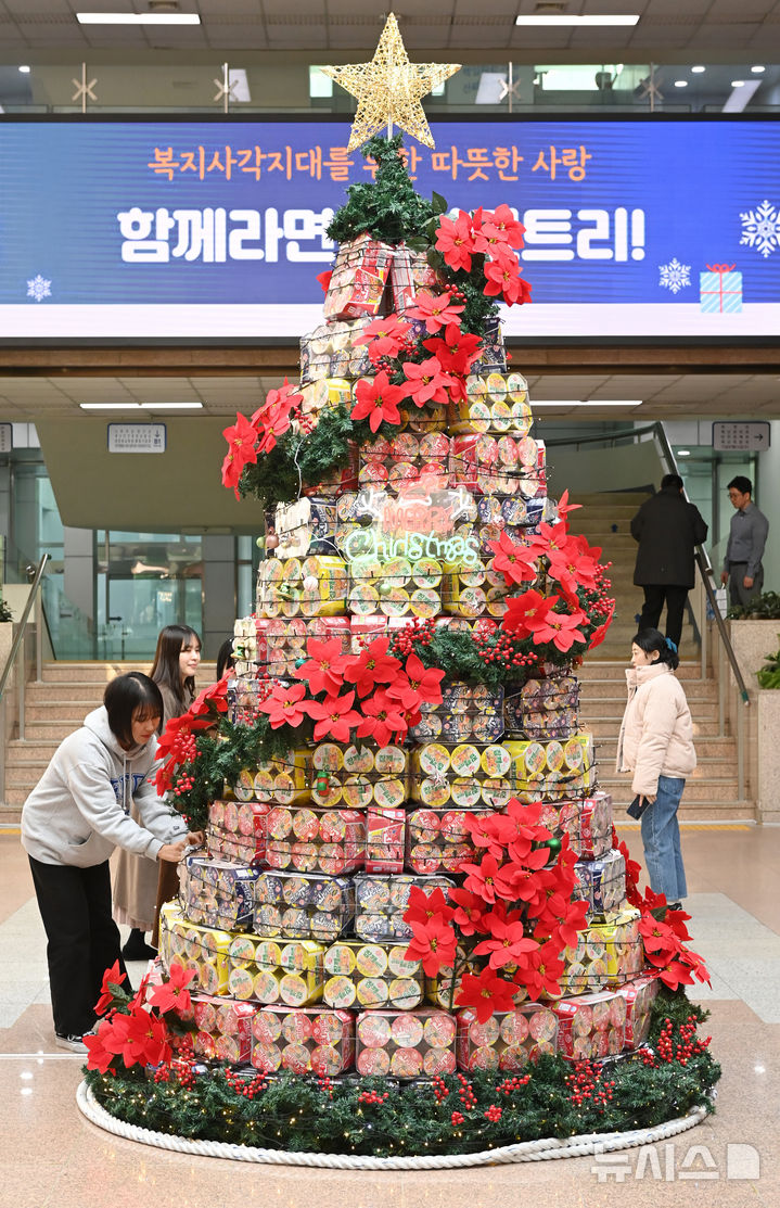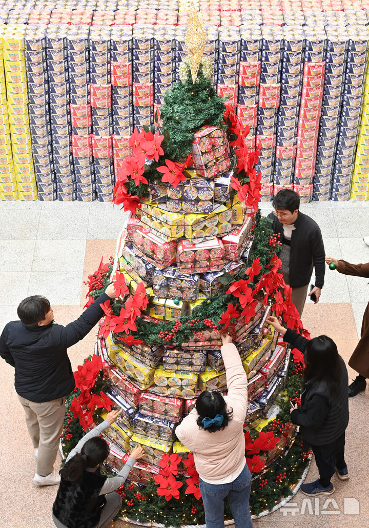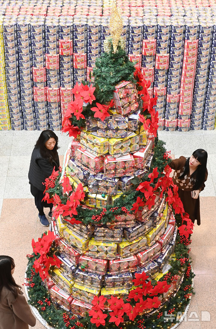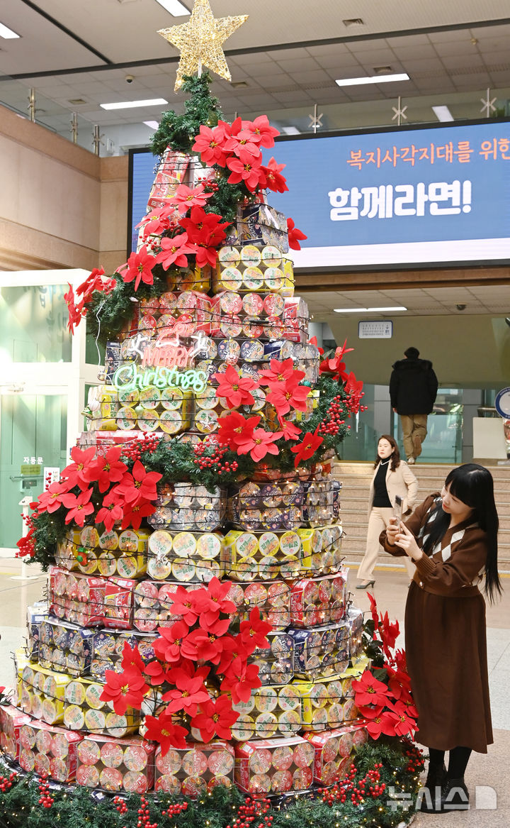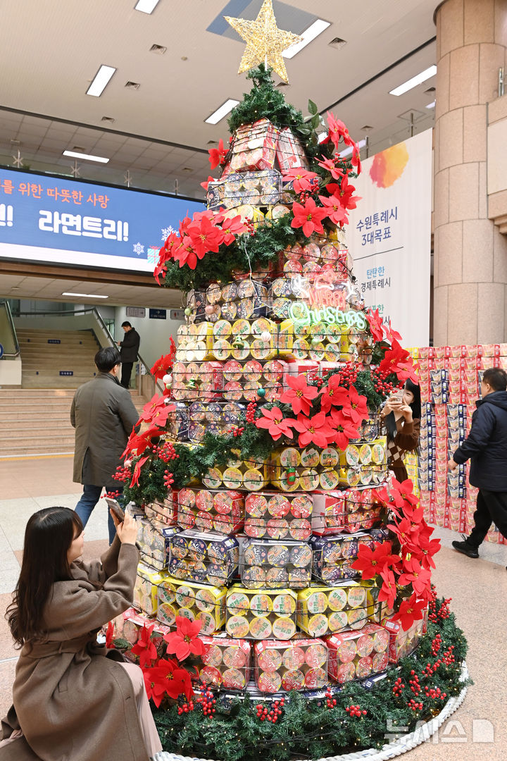 【NEWSIS】クリスマスをあすに控えた24日、京畿道水原市庁本館ロビーに、カップラーメン2400個で作った「ラーメンツリー」が登場し、注目を集めている。水原市は、カップラーメンを各行政福祉センターに配分し、福祉の手が届きにくい状態に置かれている人々へ届ける予定だ。
