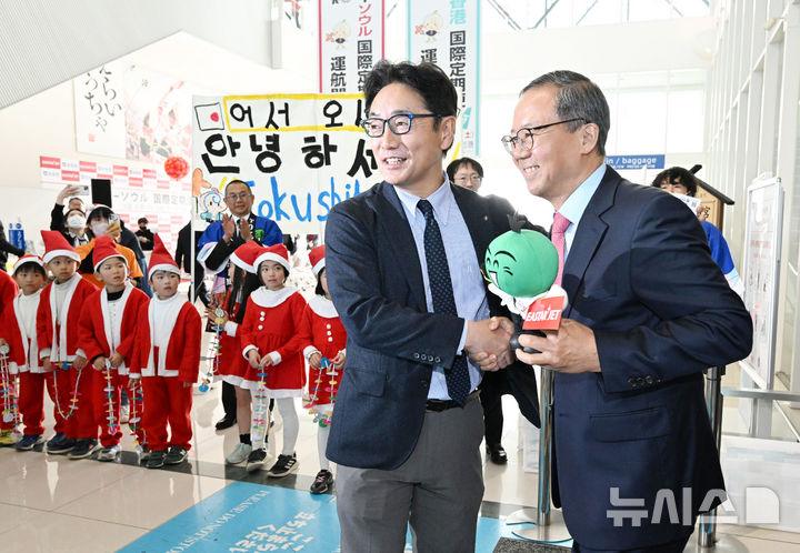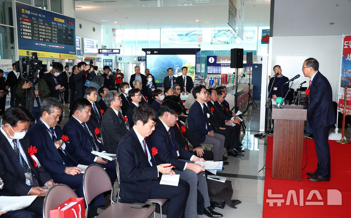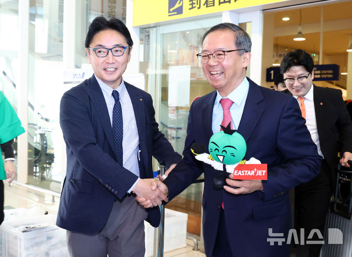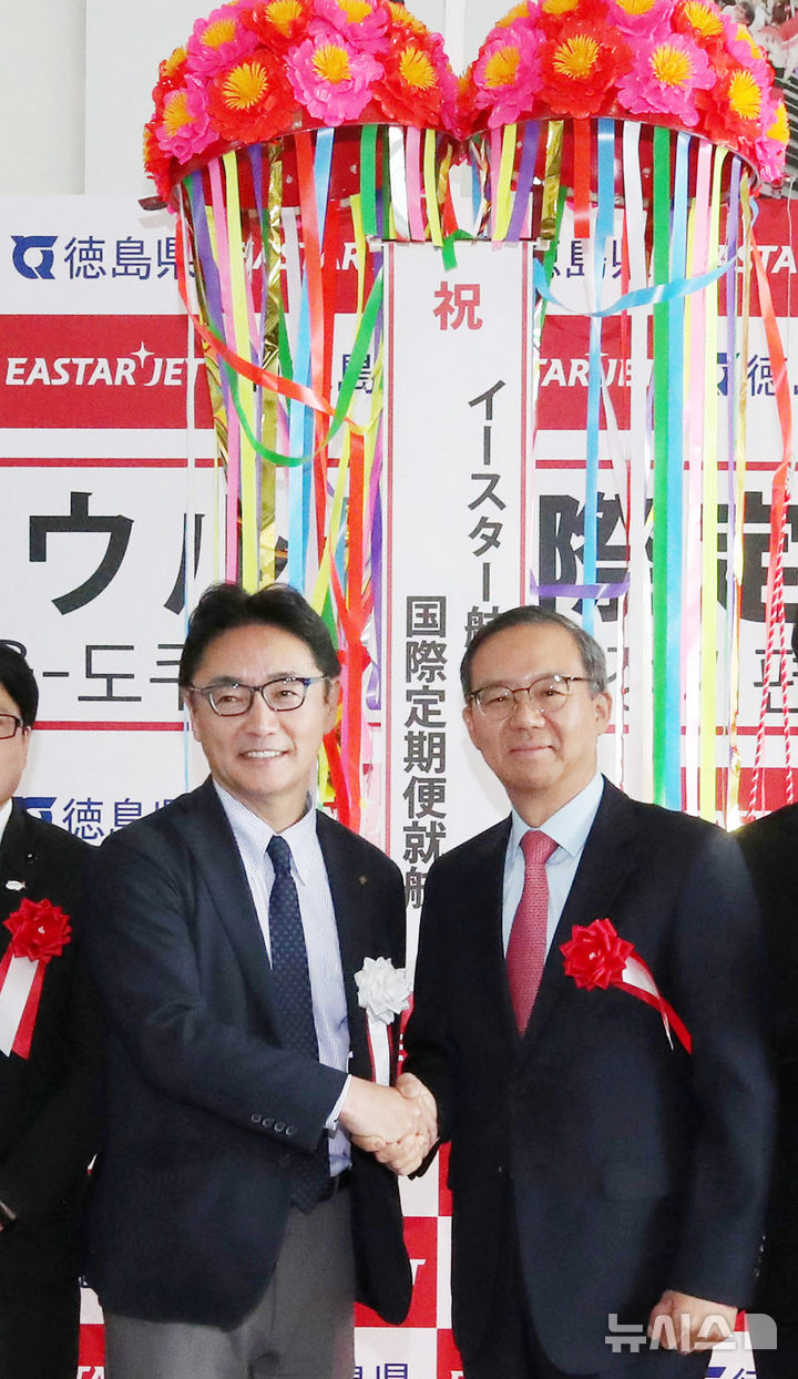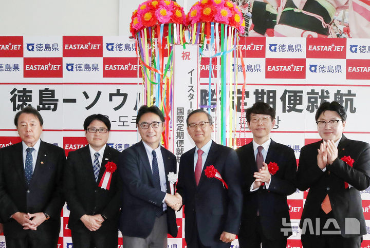【NEWSIS】イースター航空の趙重奭(チョ・ジュンソク)代表取締役が26日、徳島空港で開かれた「イースター航空徳島初就航」記念式典で、後藤田正純徳島県知事など出席者らと共に就航を祝う「くす玉割り」のセレモニーを行っているところ。