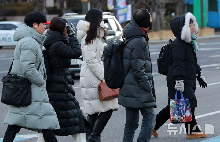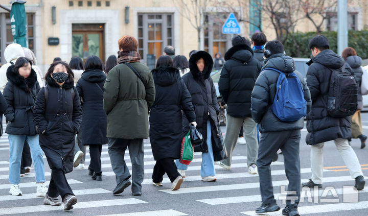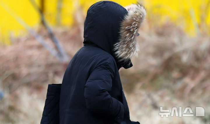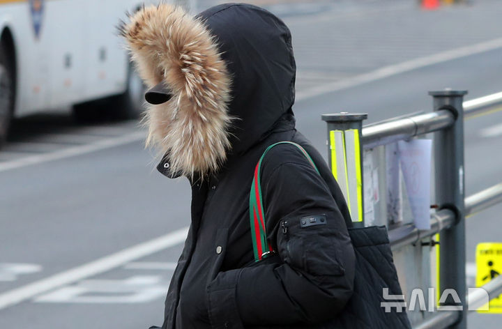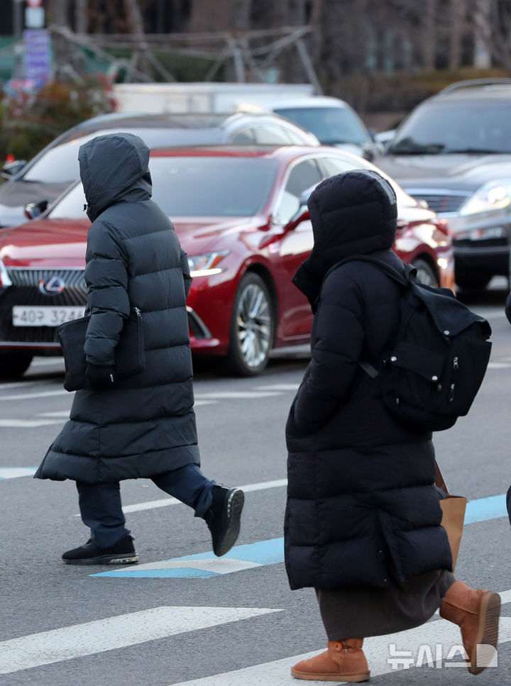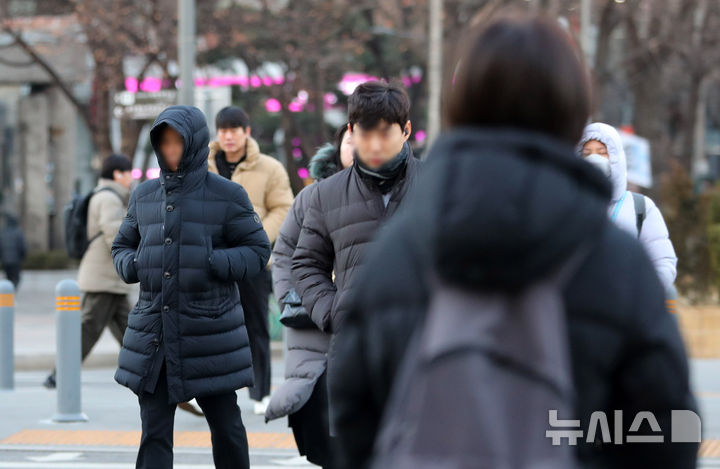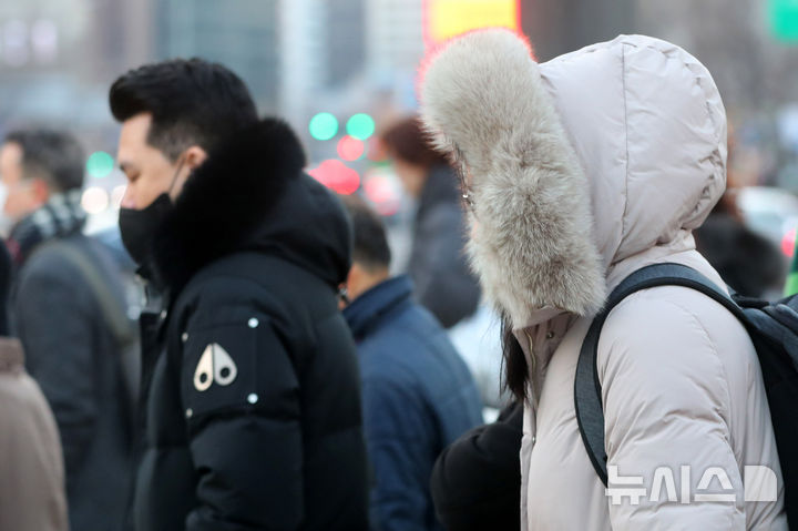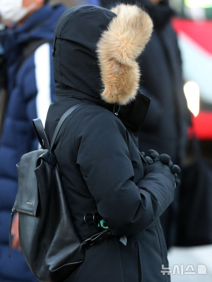 【NEWSIS】朝の最低気温が氷点下まで下がった27日午前、ソウル市鍾路区の光化門交差点で、フードをかぶり、手をポケットに入れて歩く人。