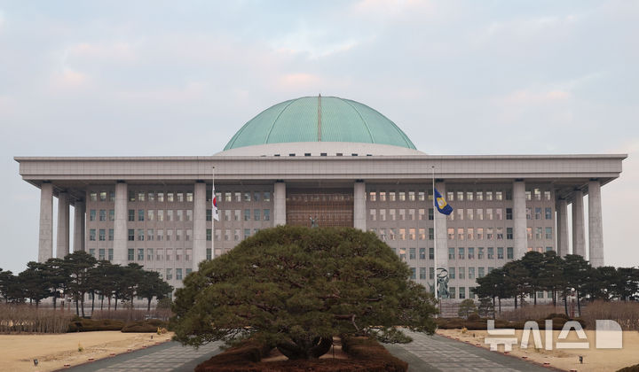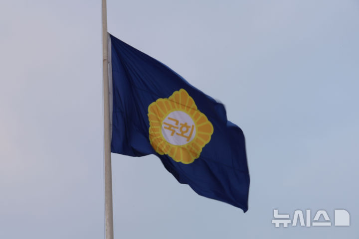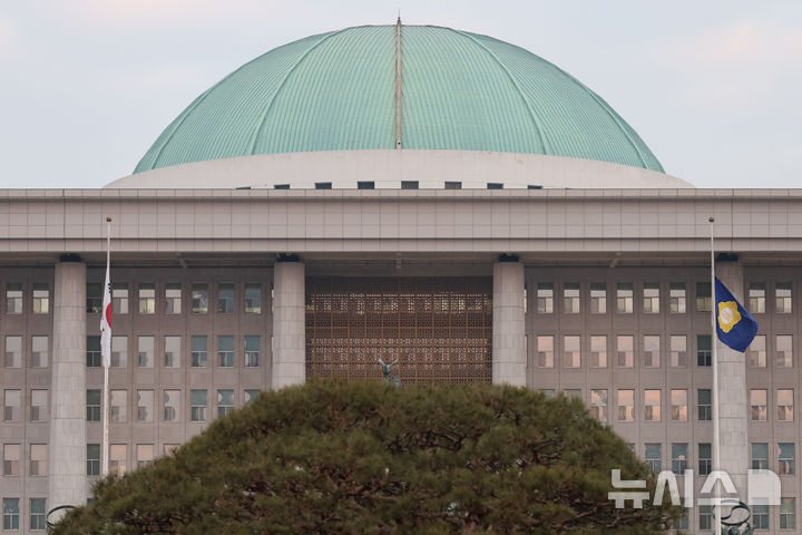 【NEWSIS】務安国際空港でチェジュ(済州)航空機の事故が発生したのを受け、韓国政府は2025年1月4日までを「国家哀悼期間」に指定した。写真は30日午前、ソウル・汝矣島の国会議事堂に掲げられた半旗。