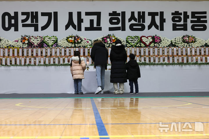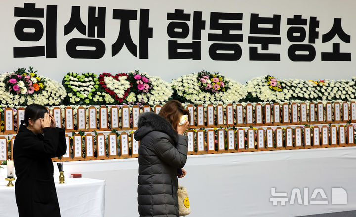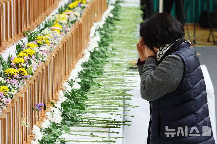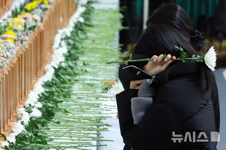 【NEWSIS】30日、全羅南道務安郡の務安総合スポーツパークに用意された済州航空旅客機事故犠牲者合同焼香所で、弔問に訪れた人々が献花をしている様子。