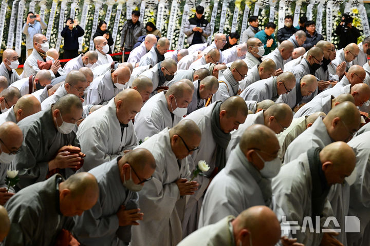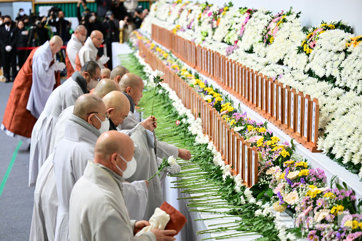 【NEWSIS】済州航空旅客機事故の発生してから一日が経過した30日午後、全羅南道・務安総合スポーツパークに整えられた合同焼香所で、大韓仏教曹渓宗の僧侶が献花をしている様子。