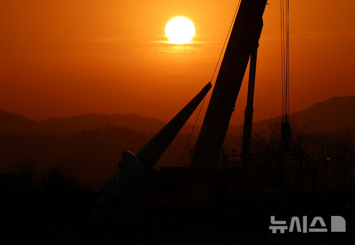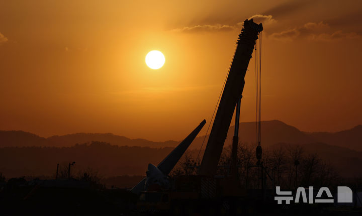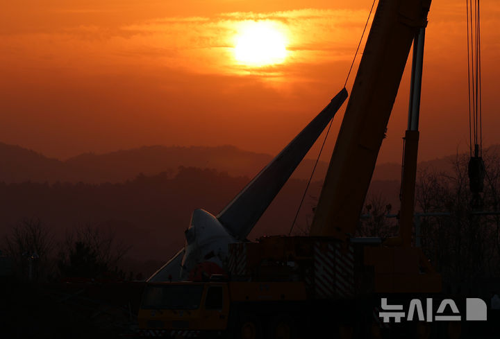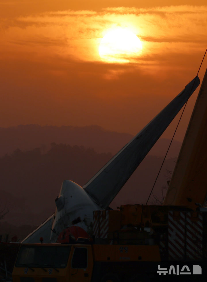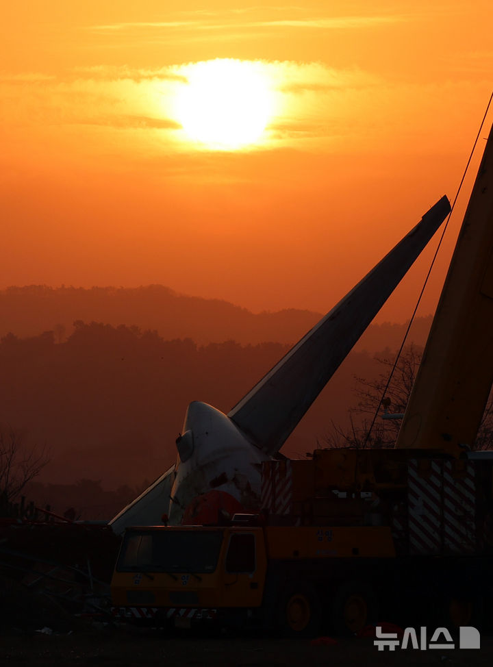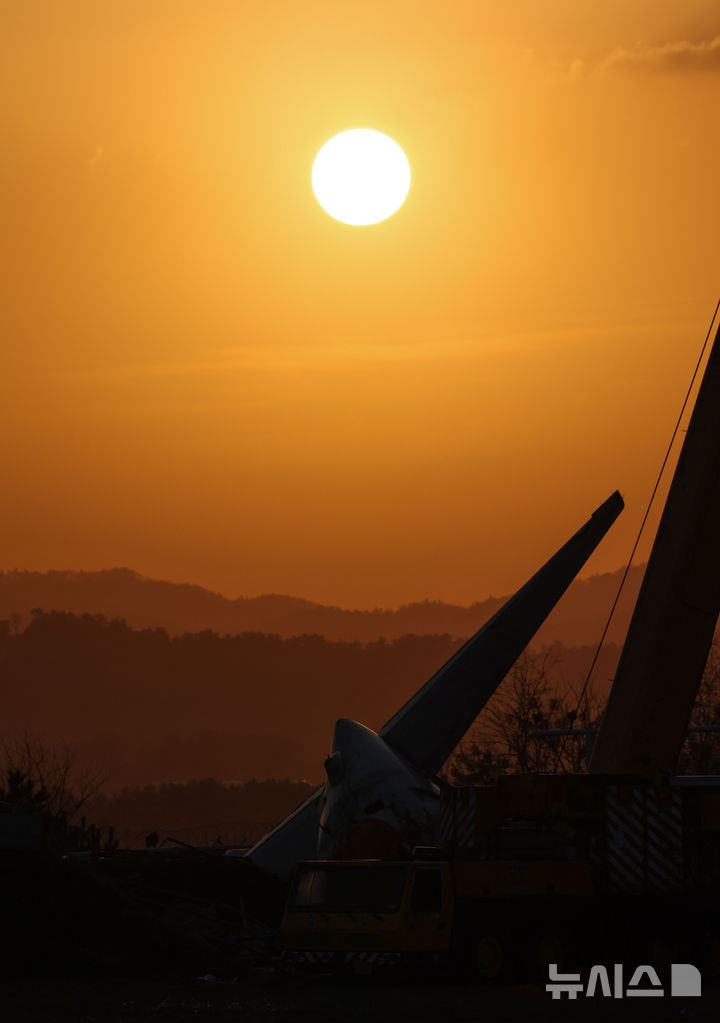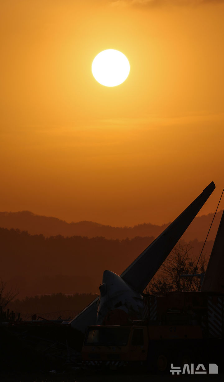全羅南道の務安国際空港で12月31日午前、チェジュ航空の旅客機の事故現場越しに朝日が昇っている。