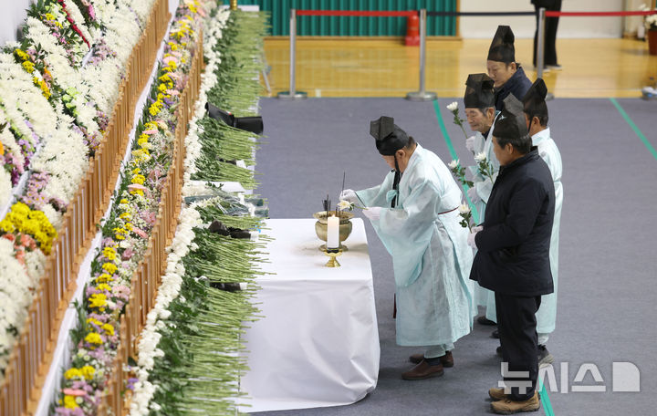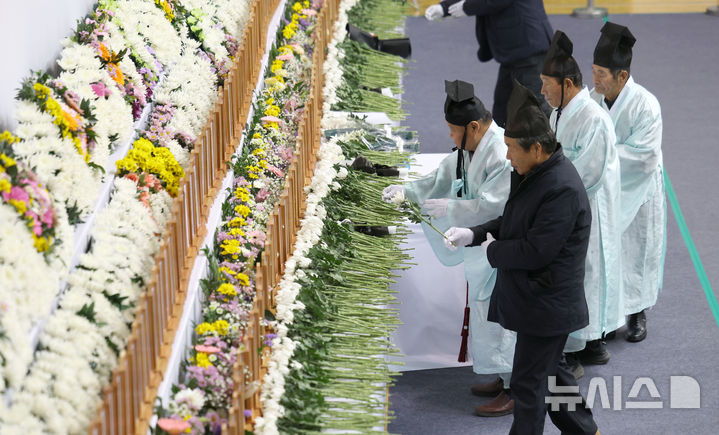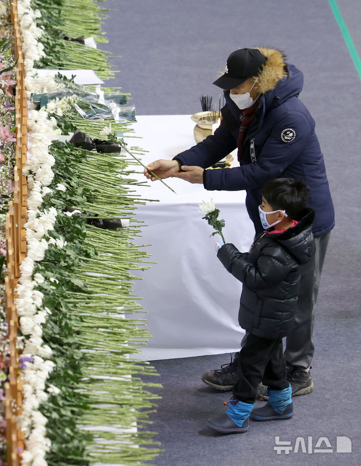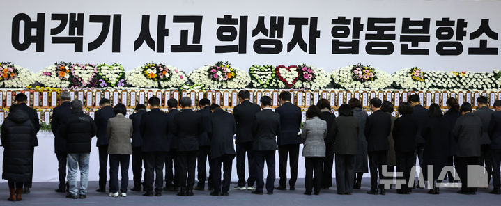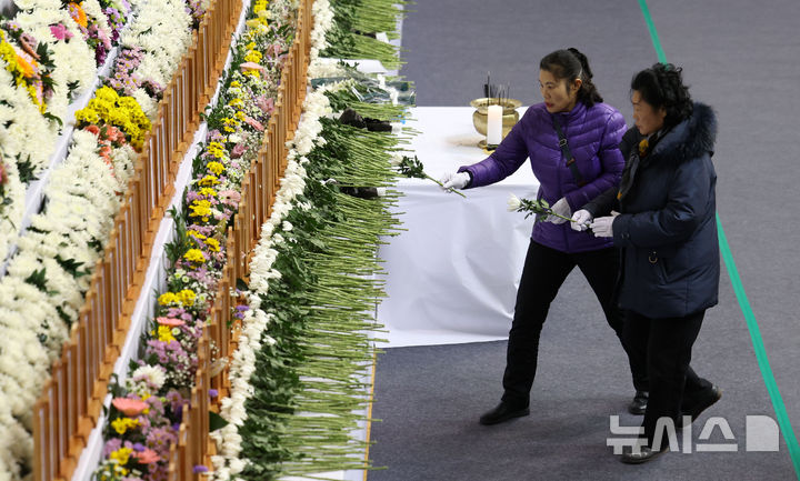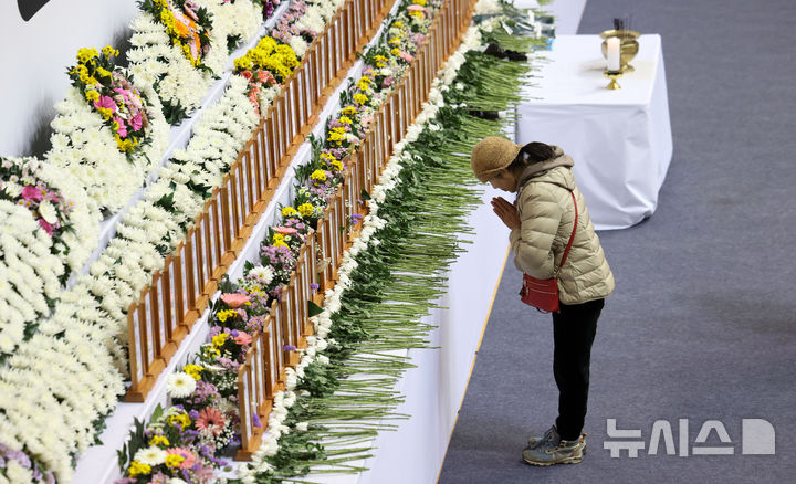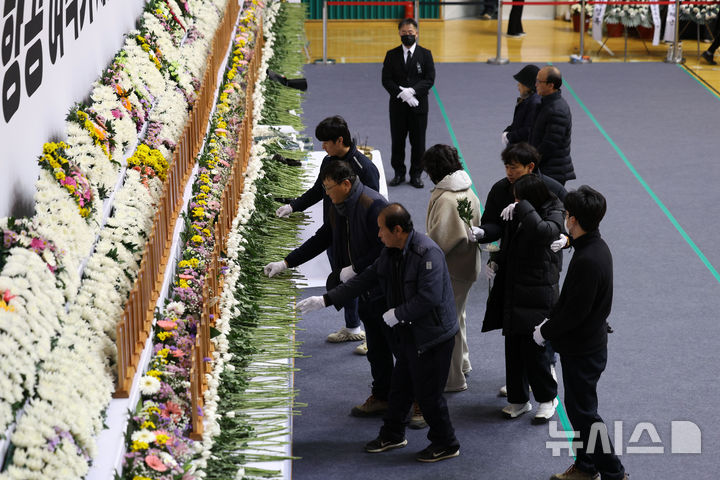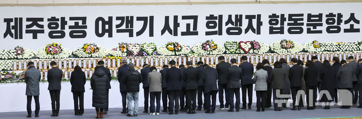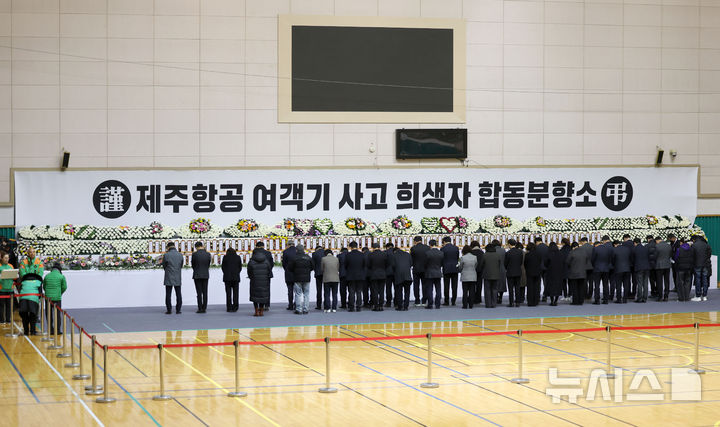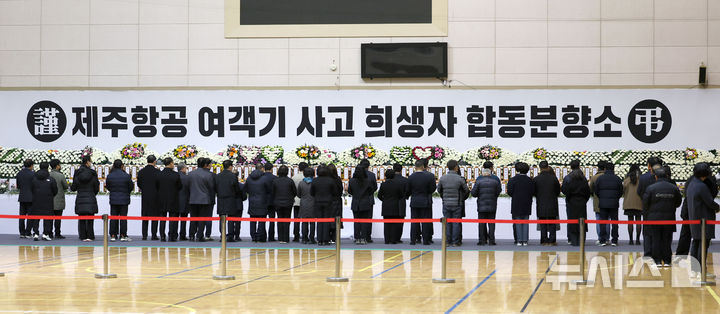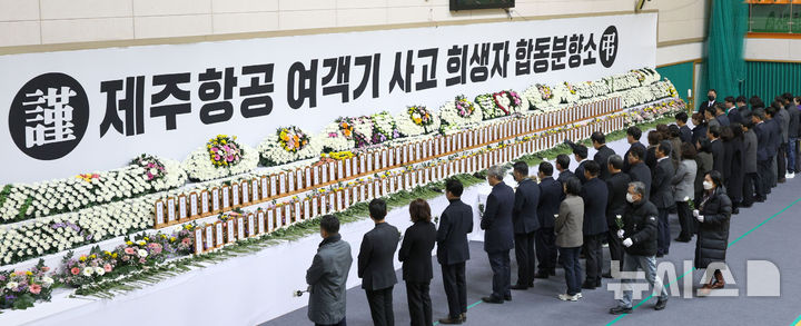 全羅南道務安郡玄鏡面の務安スポーツパークに設けられたチェジュ航空旅客機事故の犠牲者の合同焼香所で31日、追悼に訪れた人たちが事故の犠牲者たちに弔意を表した。