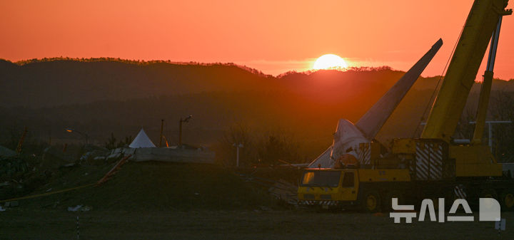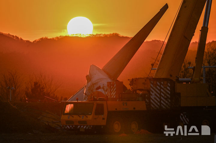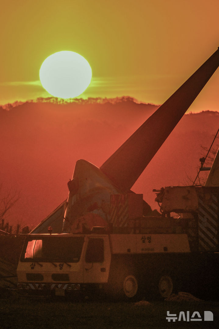 【NEWSIS】チェジュ(済州)航空機事故から六日たった3日午前、全羅南道の務安国際空港事故現場で、事故機の尾翼の向こう側から昇る太陽。