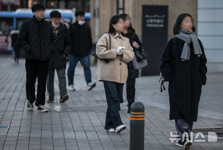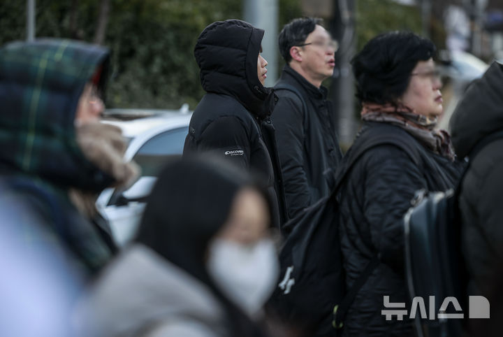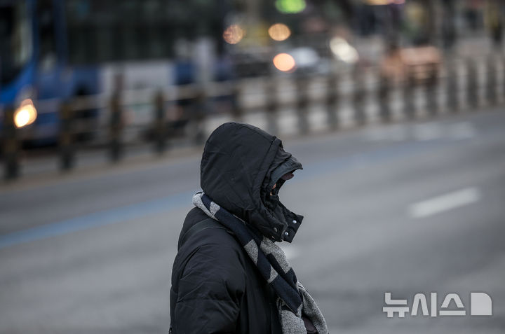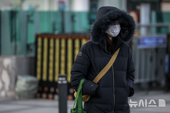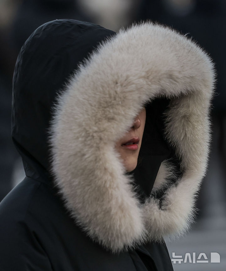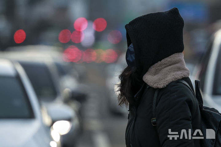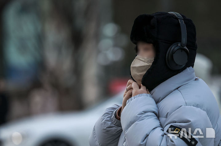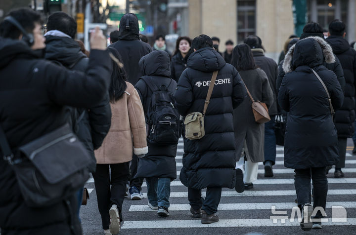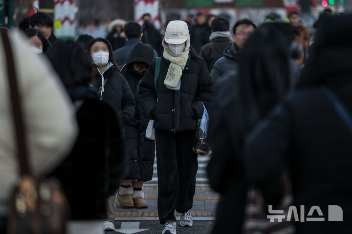 【NEWSIS】韓国全国のほとんどの地域で気温が氷点下まで落ち込んだ7日、ソウル市鍾路区の光化門交差点で、耳当て付きの帽子をかぶるなど、防寒対策をしっかりした服装で歩く人々。