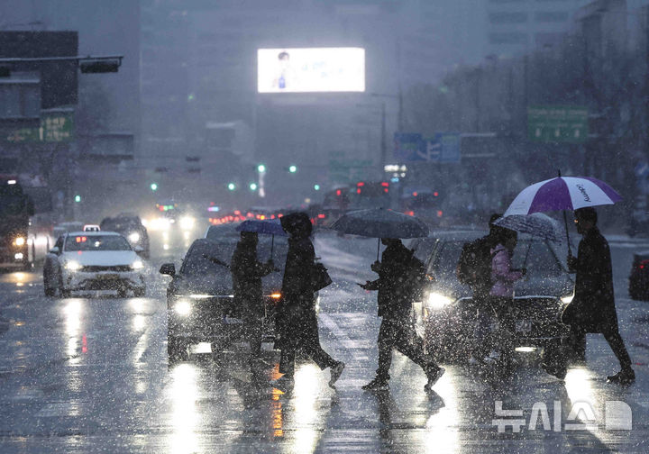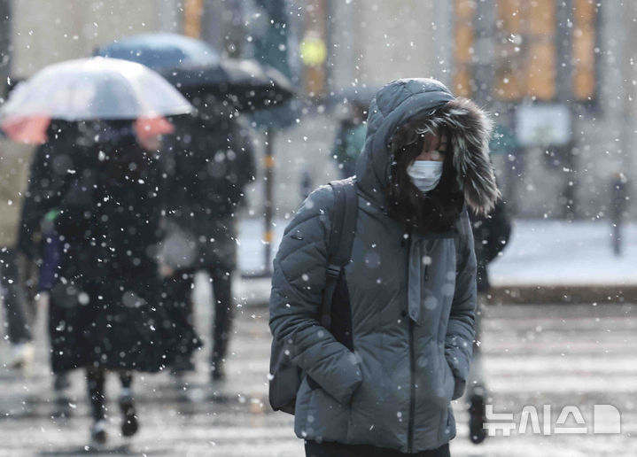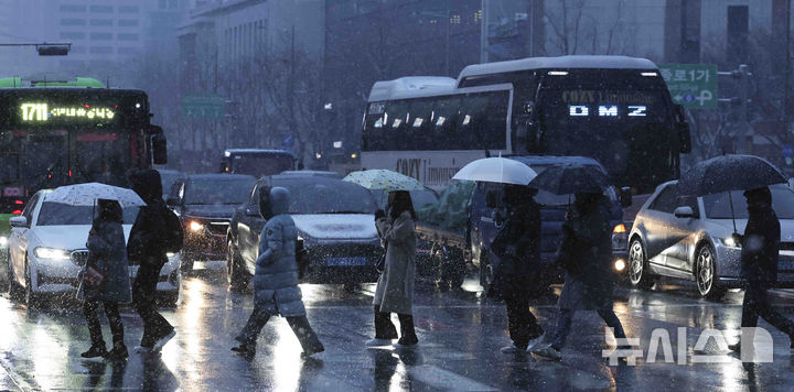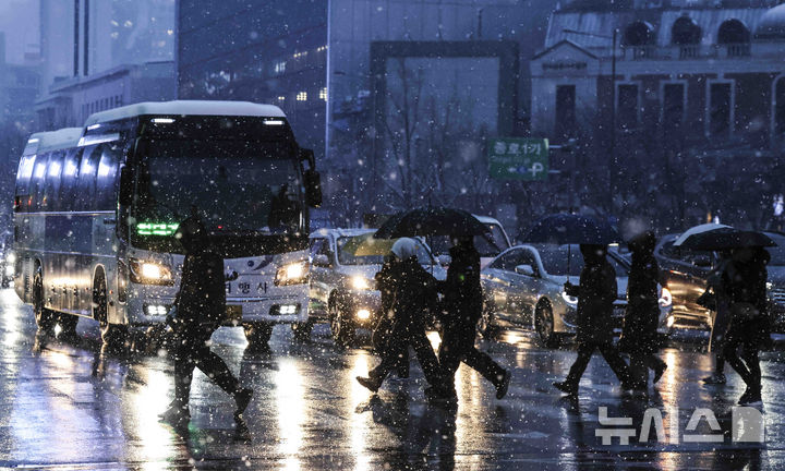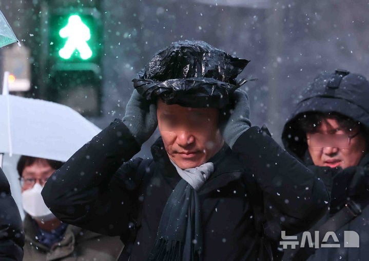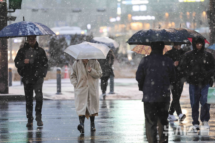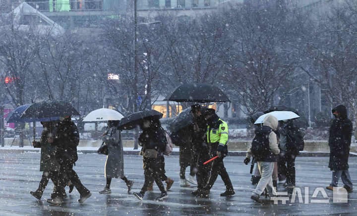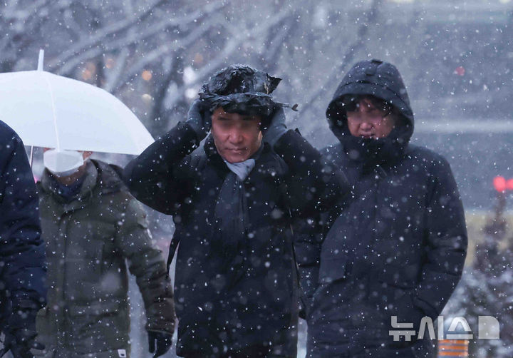 【NEWSIS】ソウル地域に雪が降った12日午前、ソウル市鍾路区の世宗大路近くで、傘をさして出勤する人々。