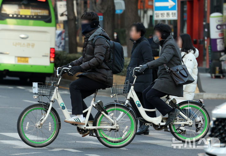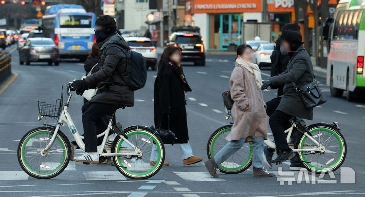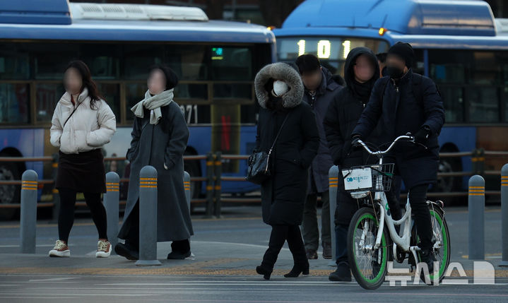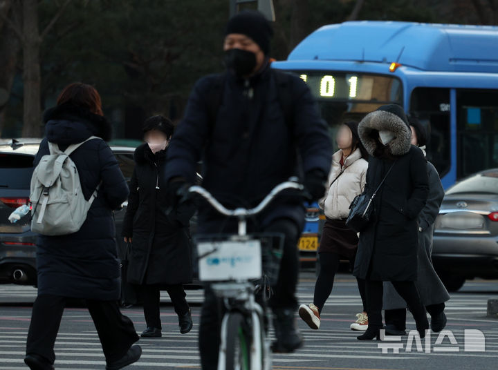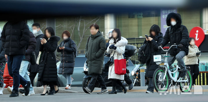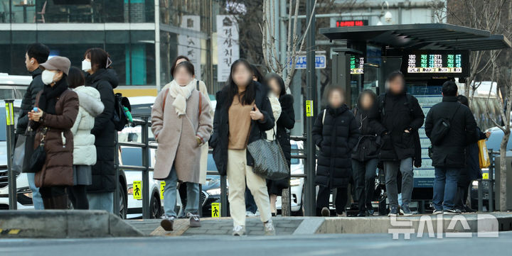 【NEWSIS】厳しい寒さが連日続いている20日午前、ソウル市鍾路区の世宗大路交差点を足早に歩く人々。