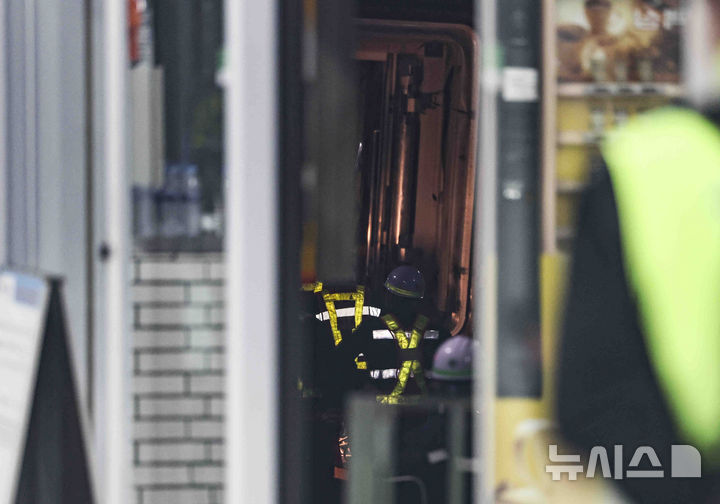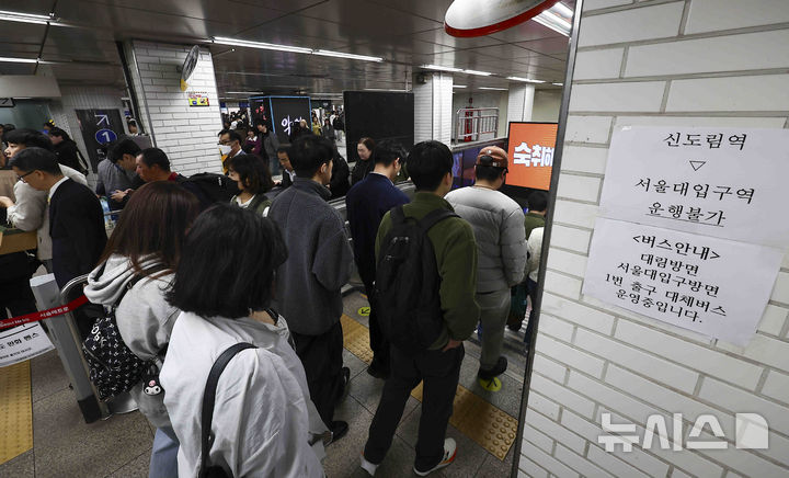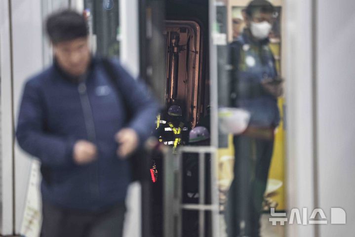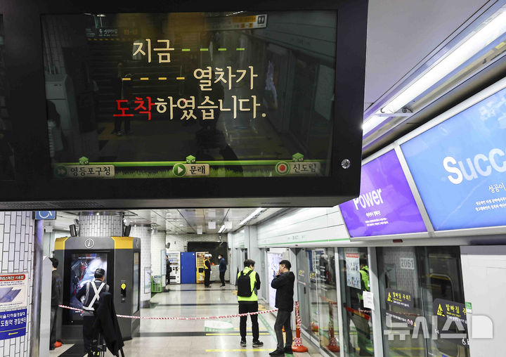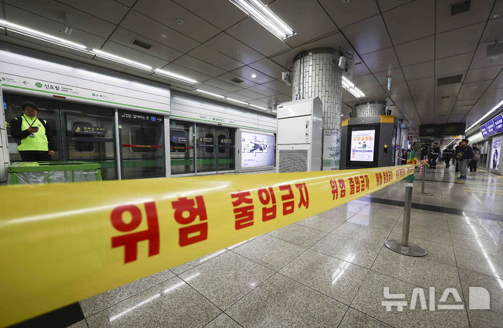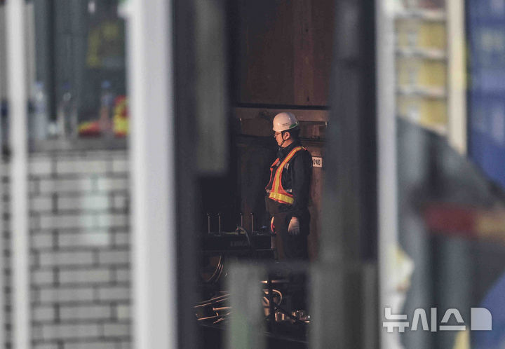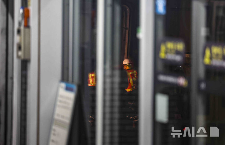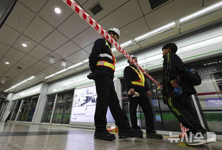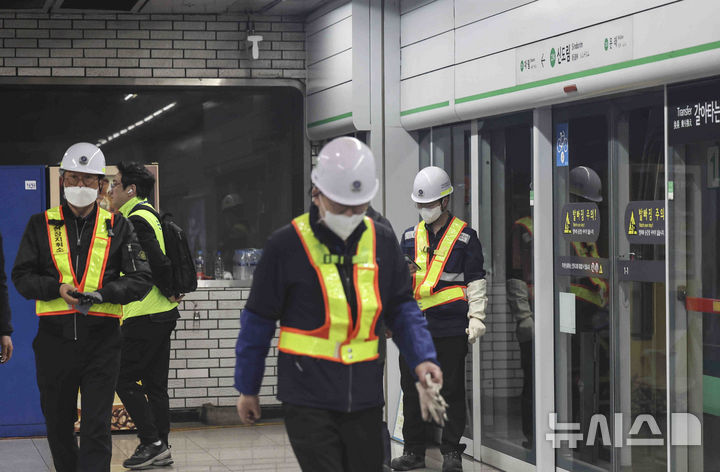 【NEWSIS】23日午前7時50分ごろ、韓国・ソウル地下鉄2号線の新道林駅(ソウル市九老区)で、出庫した列車が線路上の車止め施設と衝突し、脱線する事故が発生した。写真は同日、新道林駅で復旧作業に当たるソウル交通公社の関係者たち。