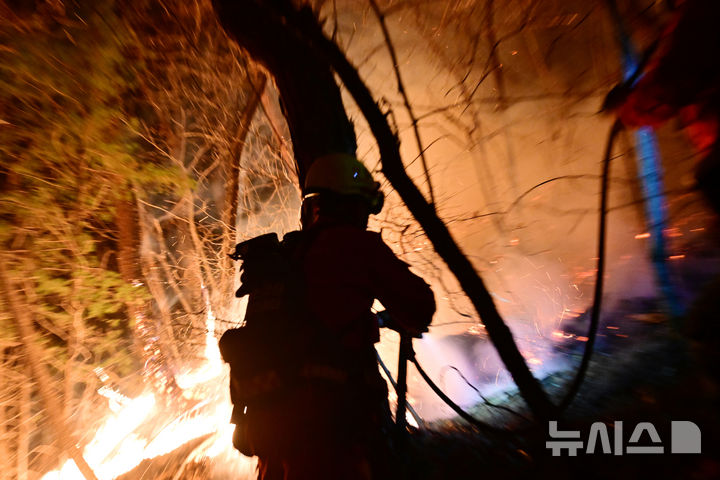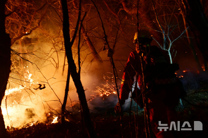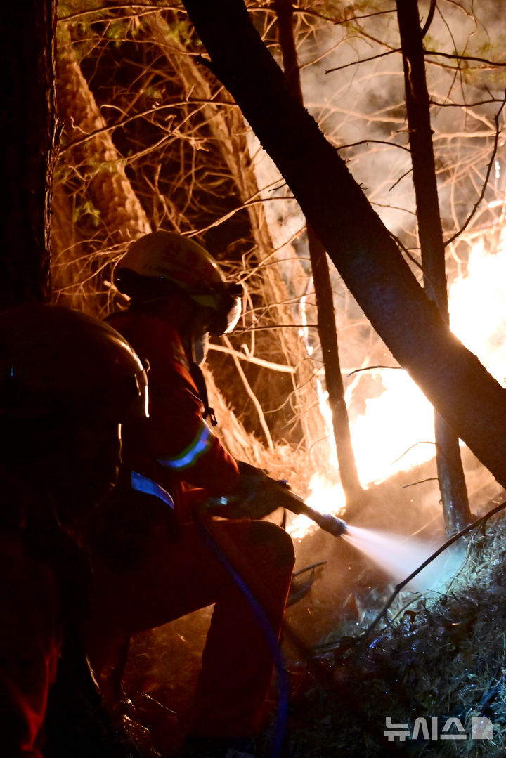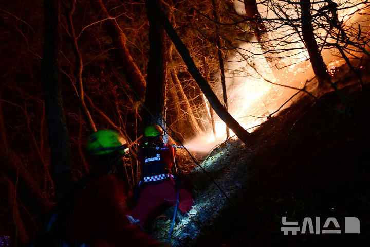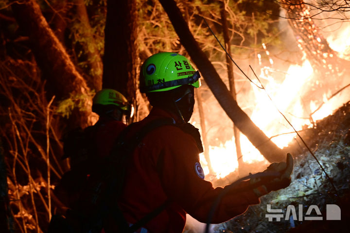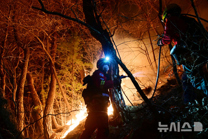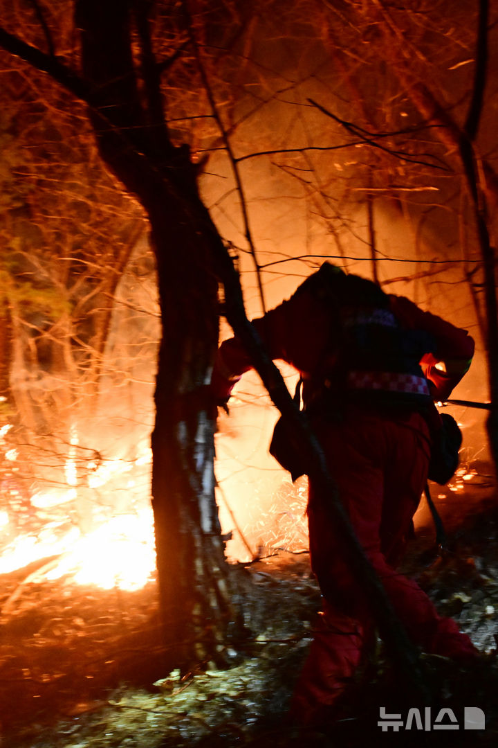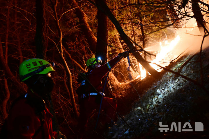 【NEWSIS】大規模な山火事が21日に慶尚南道山清郡で発生し、尾根を伝って延焼している。写真は22日午後、消火活動に当たる韓国山林庁所属の空中消火隊。