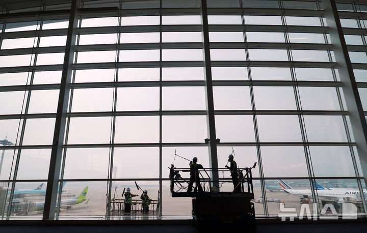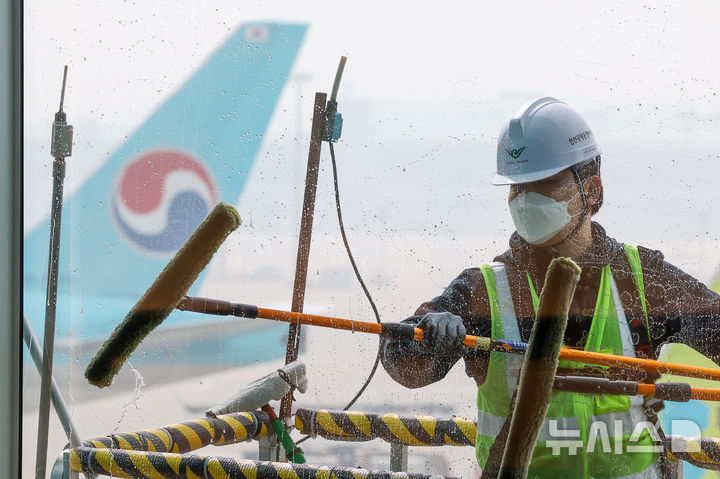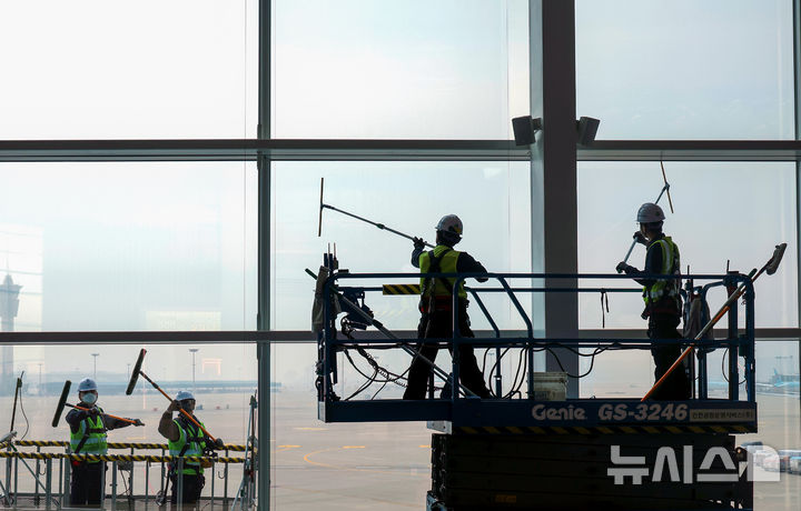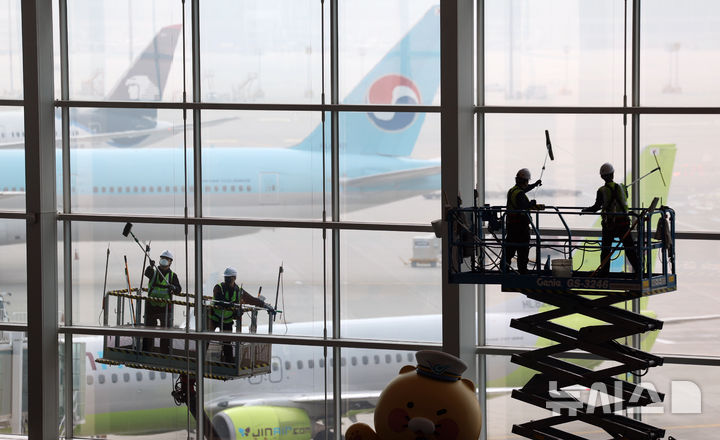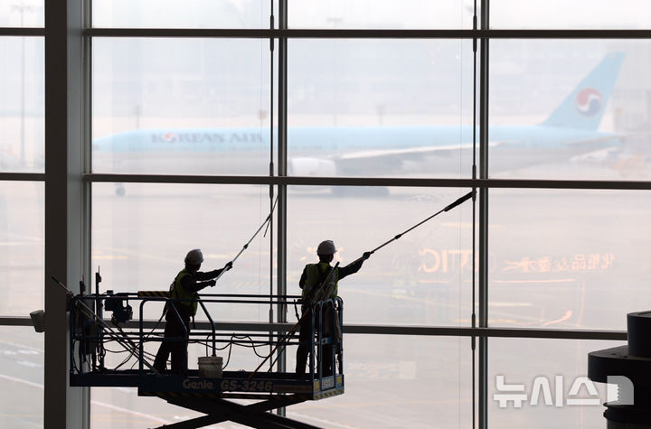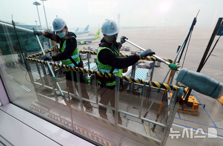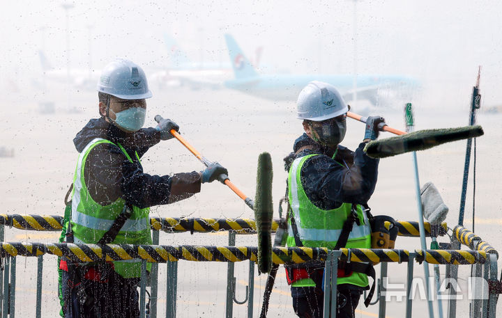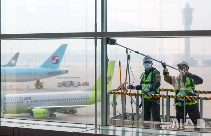 【NEWSIS】25日午前、仁川国際空港第2旅客ターミナルで、環境美化員がターミナルのガラス壁を水で清掃している様子。大掃除の作業は仁川空港の施設全般を対象に今月29日まで行われ、毎日およそ800人の人員とおよそ200台の装備が投入される。