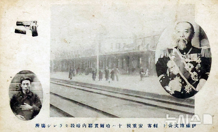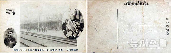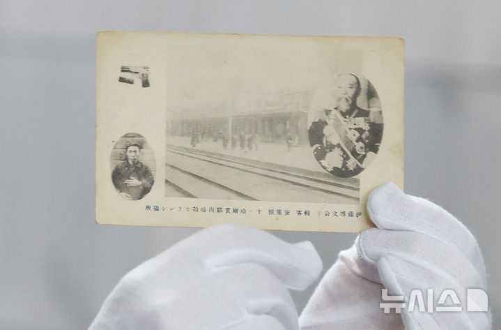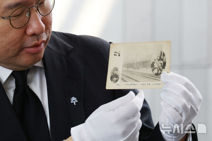 【NEWSIS】ソウル市中区の安重根義士記念館で26日午前、安重根(アン・ジュングン)殉国115周忌に合わせて、安重根義士崇募会のイ・サンヒョン理事が所蔵はがきを公開している様子。