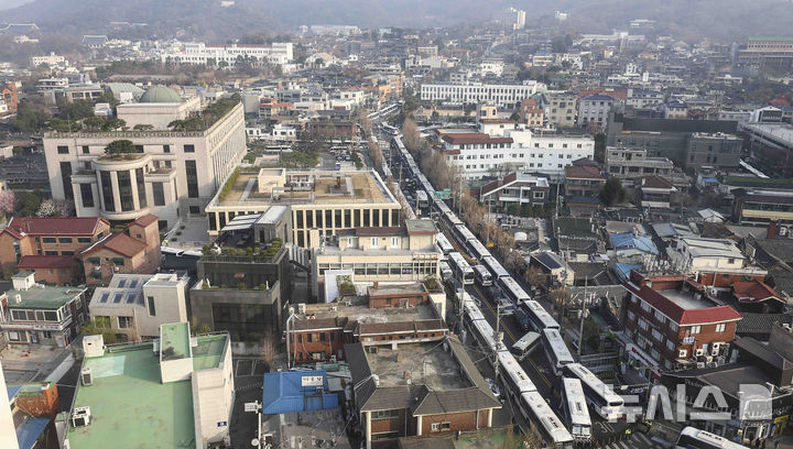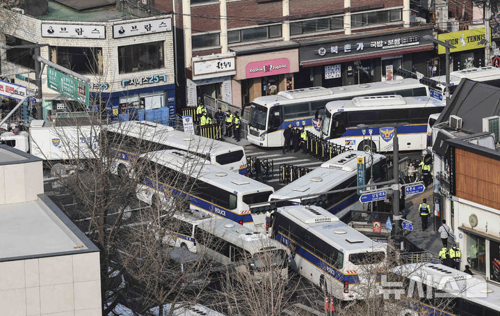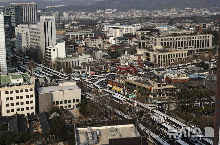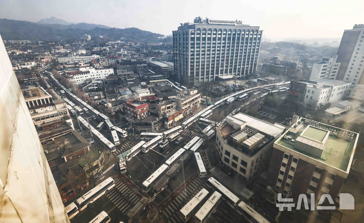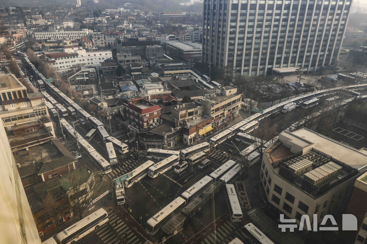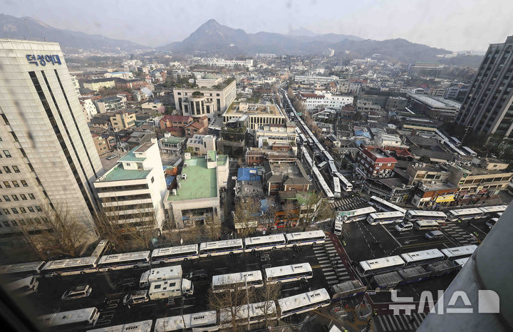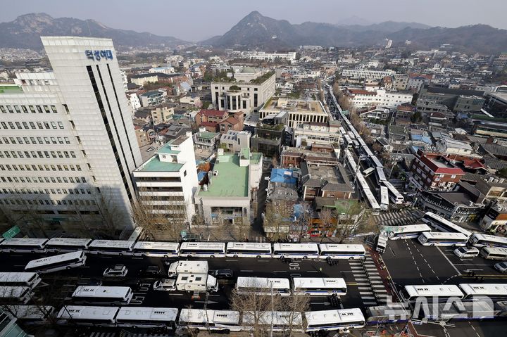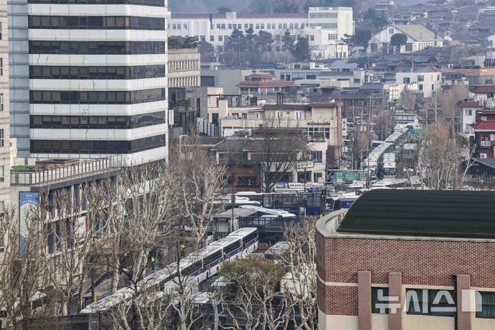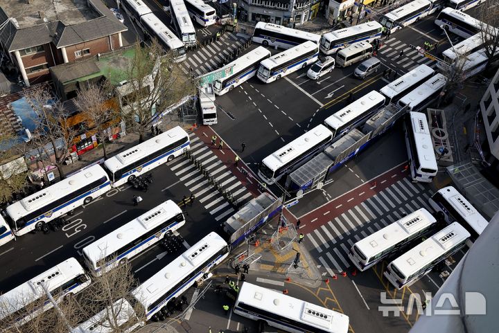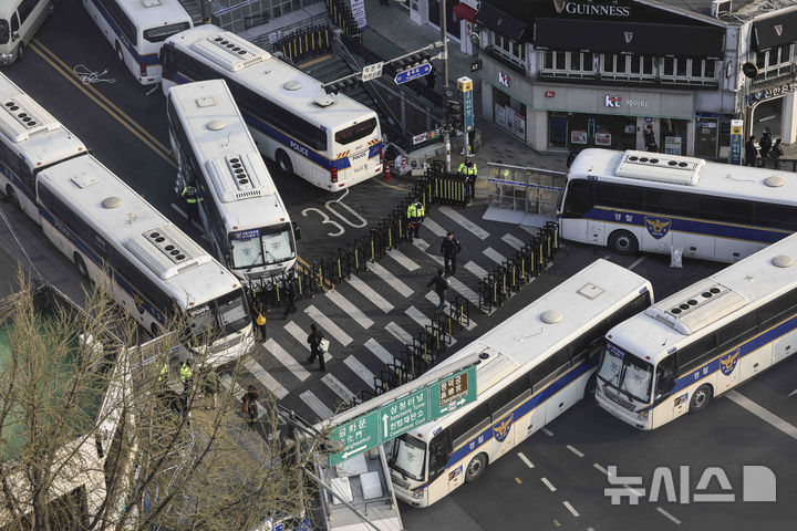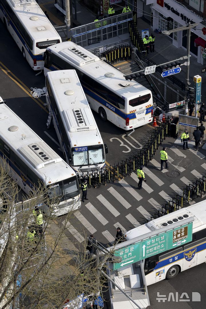 【NEWSIS】尹錫悦(ユン・ソンニョル)大統領に対する弾劾審判の宣告日である4日午前、ソウル市鍾路区にある憲法裁判所近くの通りは、警察車両やバスなどにより「壁」が築かれ、通行が規制された。