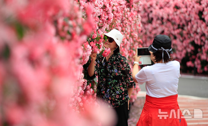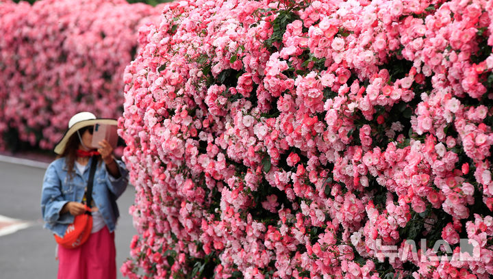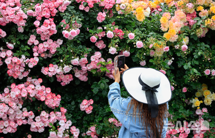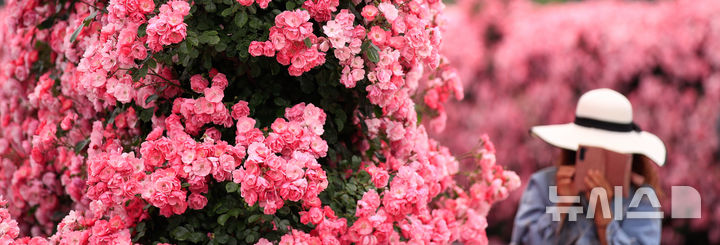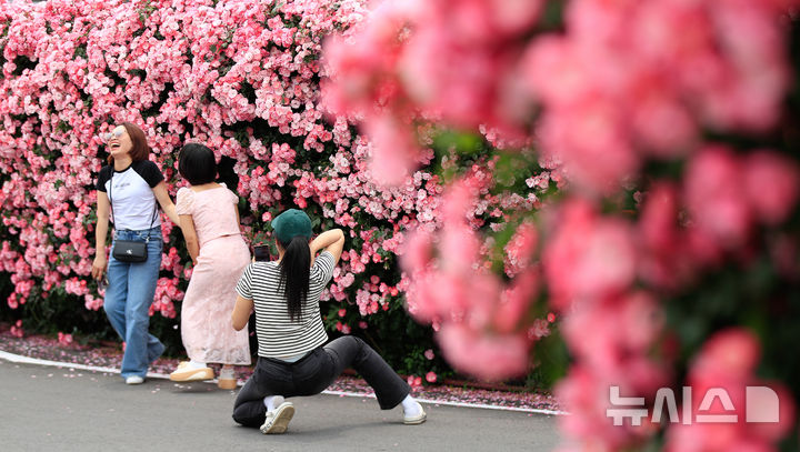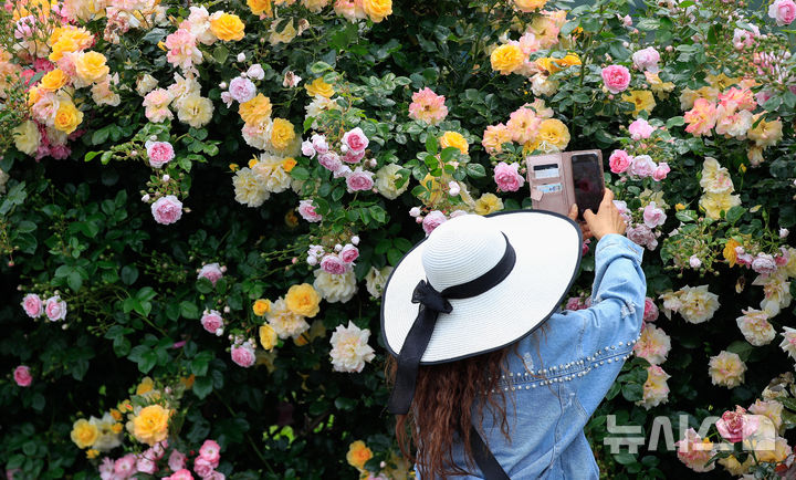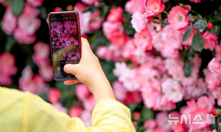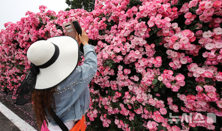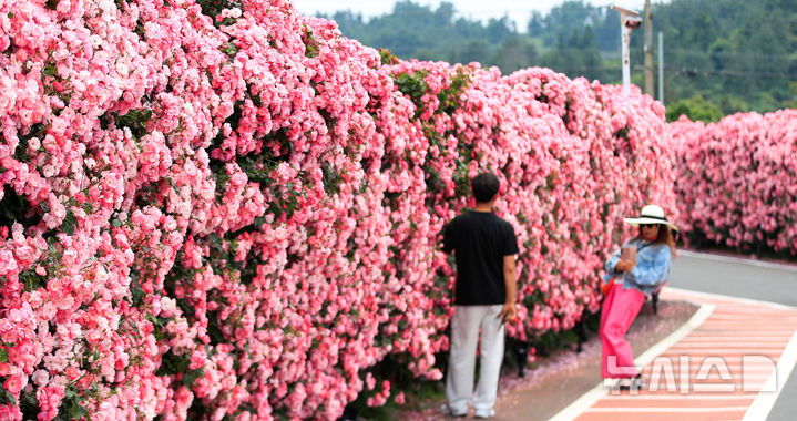【NEWSIS】曇天となった28日午後、済州・西帰浦市猊来洞のある飲食店への進入路では、バラが大きく咲いて住民や観光客の視線を引き付けていた。