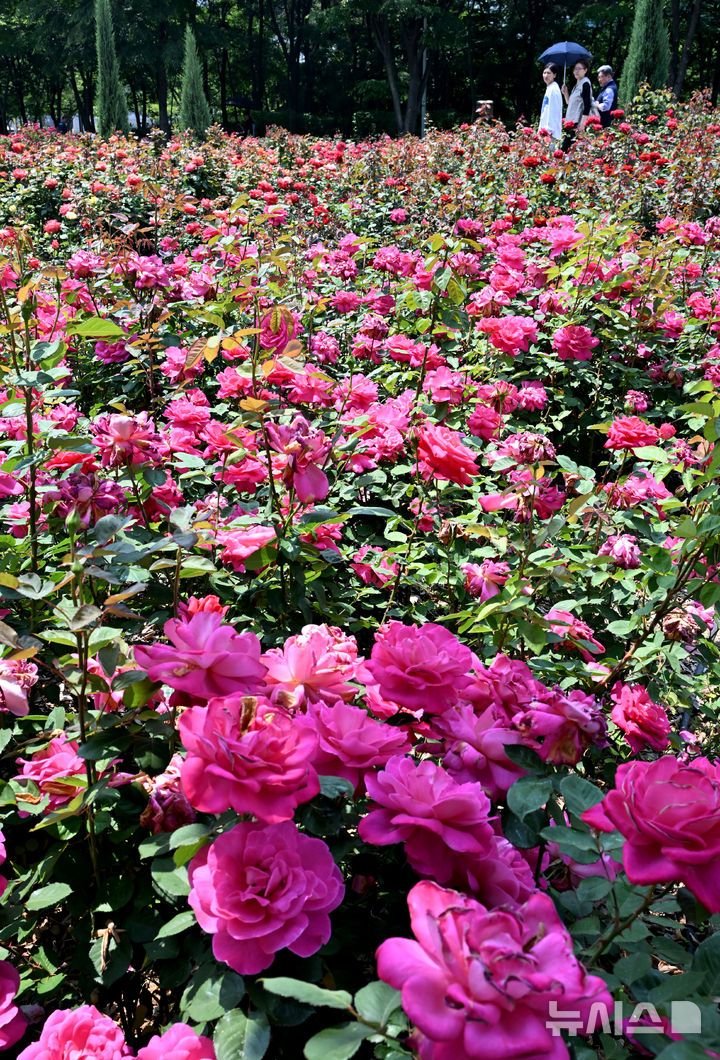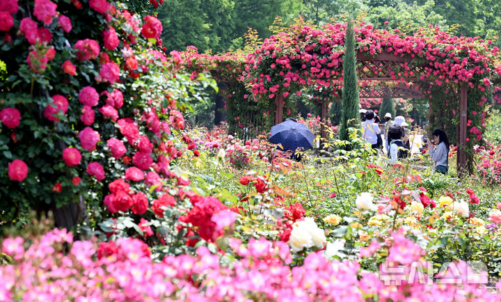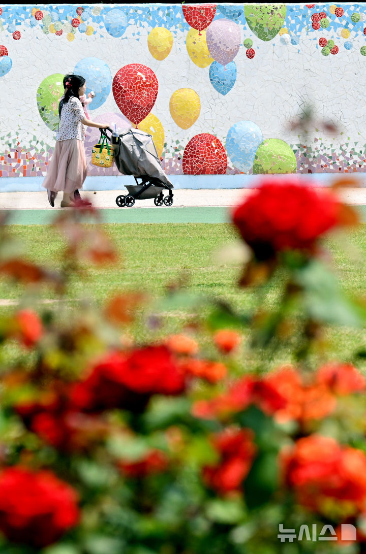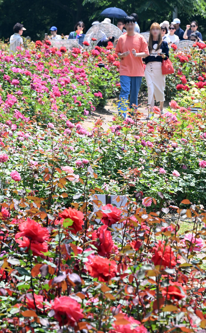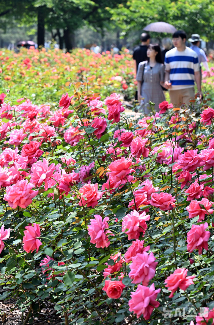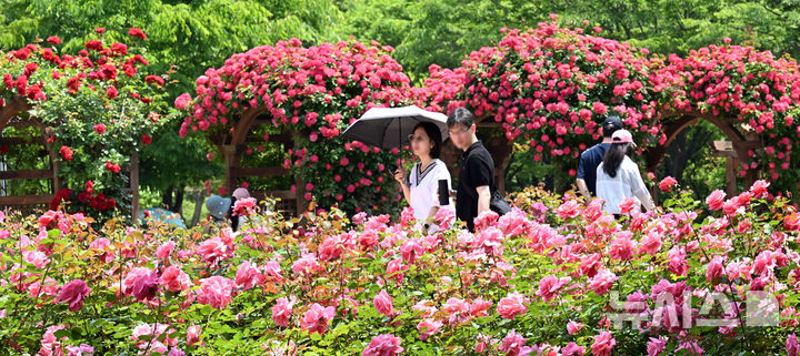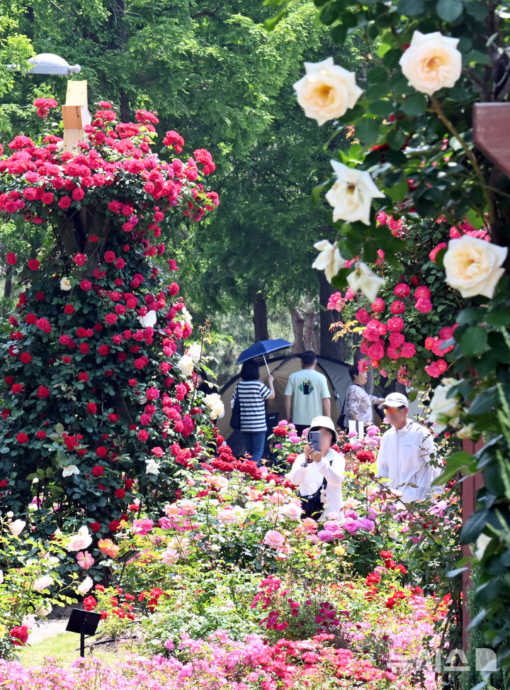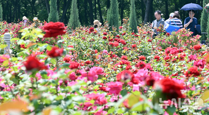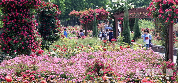 【NEWSIS】日中の最高気温が30℃に達した1日、仁川市延寿区の松島国際都市にあるヘドジ(日の出)公園のバラ園を訪れた人々が満開のバラを楽しんだ。