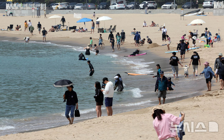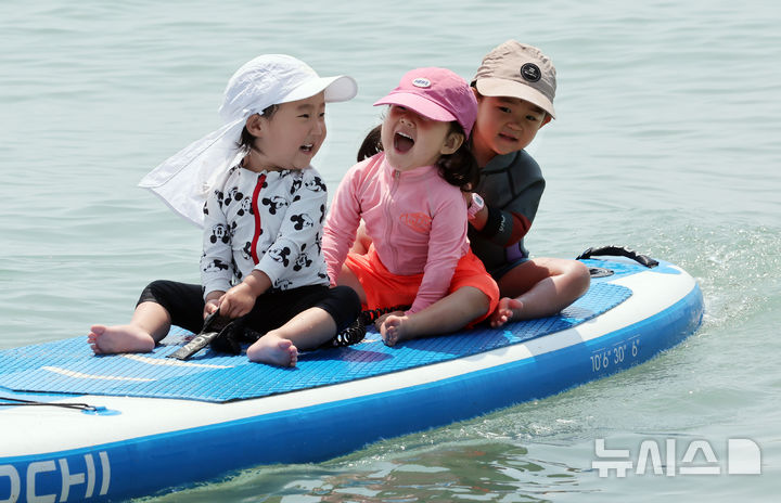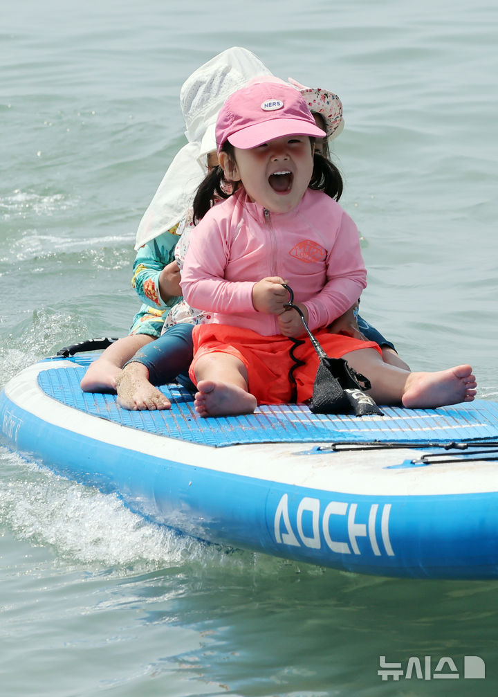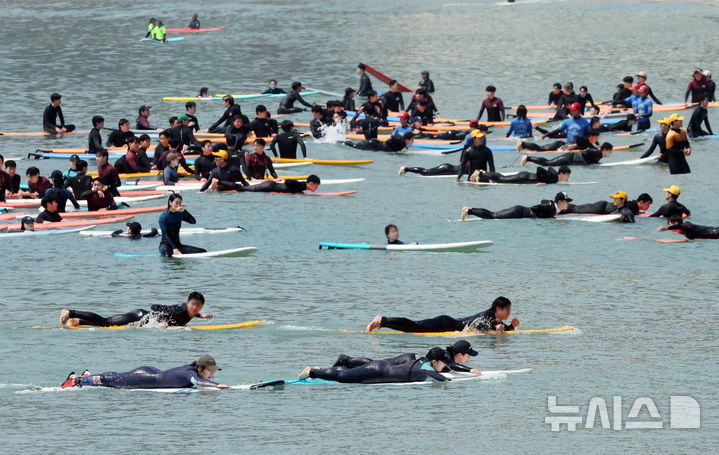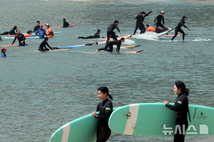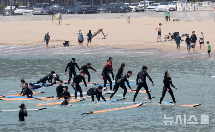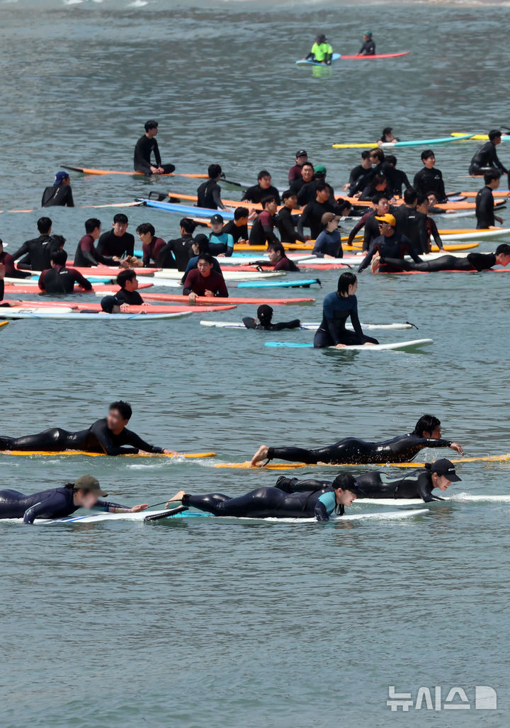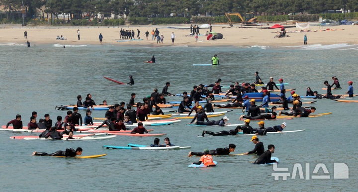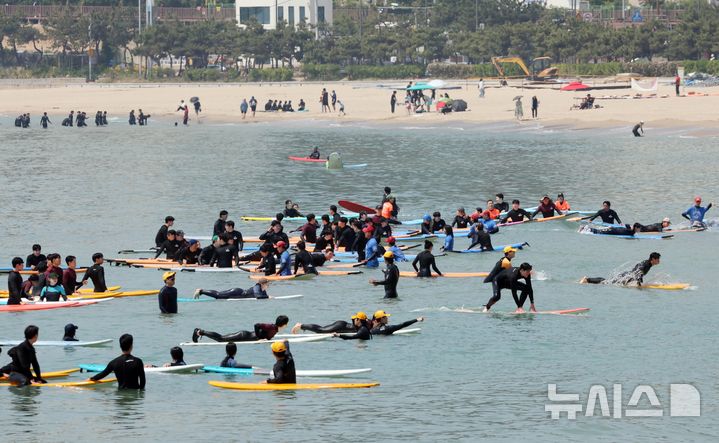 【NEWSIS】初夏の陽気となった1日、釜山市海雲台区の松亭海水浴場で、サーフィンを楽しむ人々。