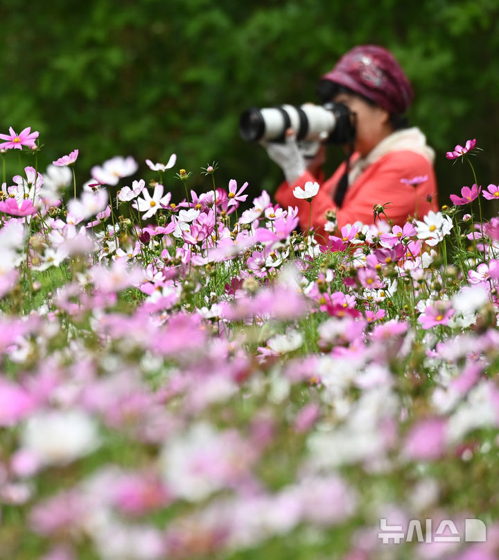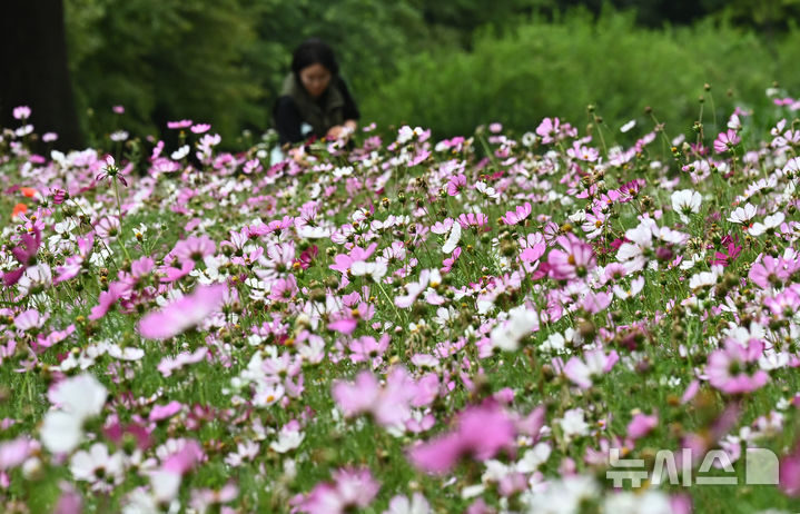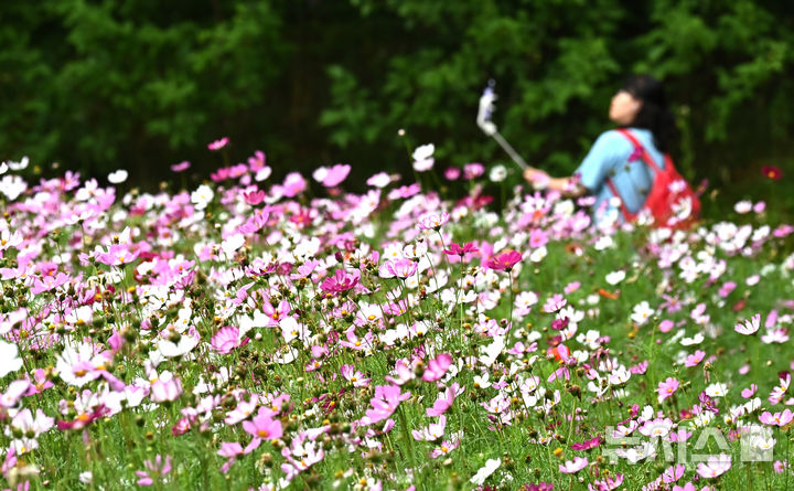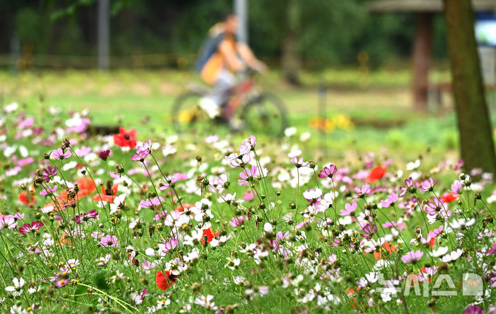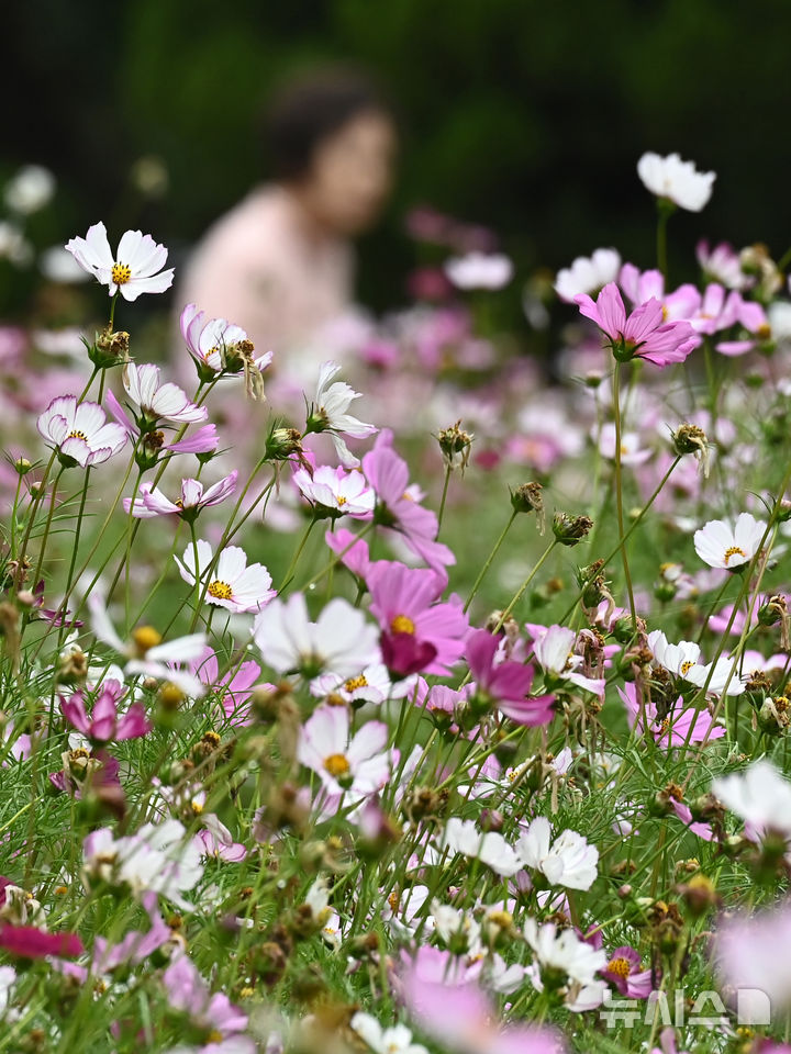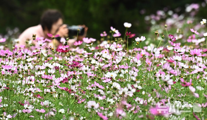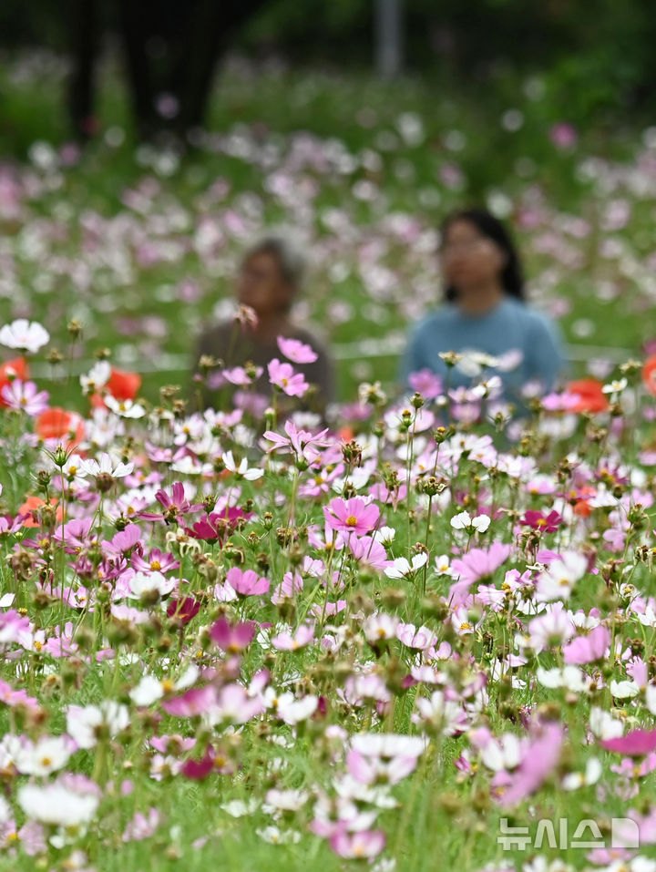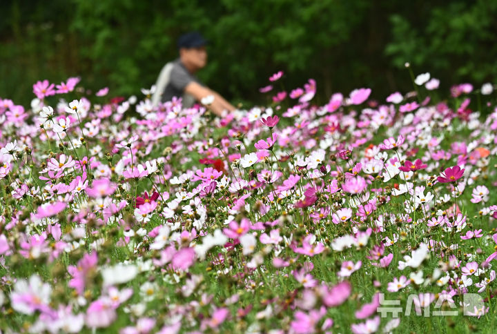 【NEWSIS】梅雨が一時的に小康状態となった16日、京畿道水原市勧善区塔洞の市民農場では、訪れた人々がコスモスを眺めつつ散策していた。