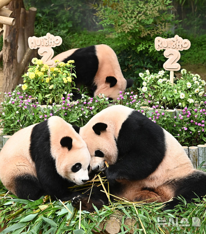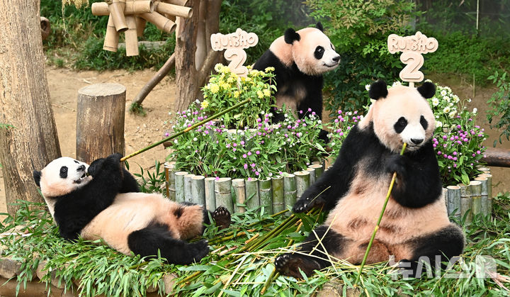 【NEWSIS】京畿道竜仁市にあるエバーランドのパンダワールドで7日、2歳の誕生日を迎えた双子パンダの叡宝(ルイバオ)と輝宝(フイバオ)が、母親の愛宝(アイバオ)と一緒に竹で作った大型のケーキを食べているところ。