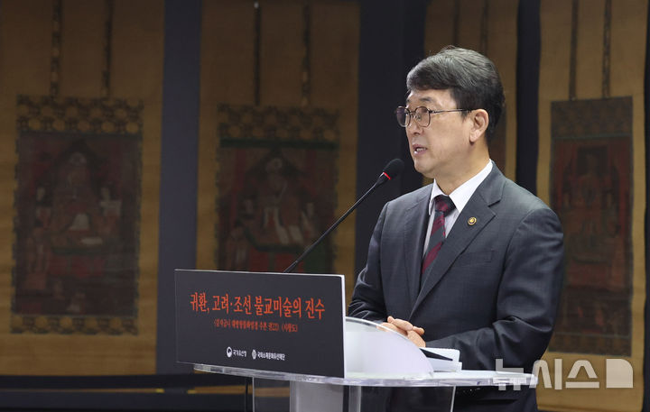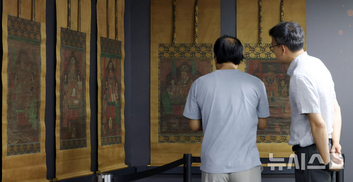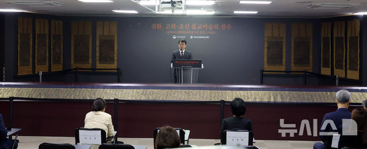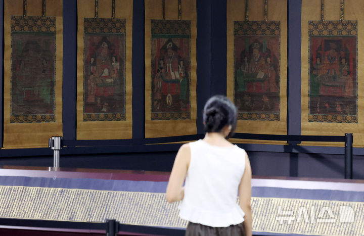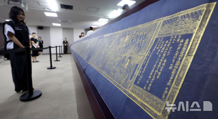 【NEWSIS】8日午前、ソウル市鍾路区の国立古宮博物館で開かれた「還収文化遺産メディア公開会」で、日本から戻ってきた紺紙金泥大方広仏華厳経周本巻二十二および十王図が公開されているところ。