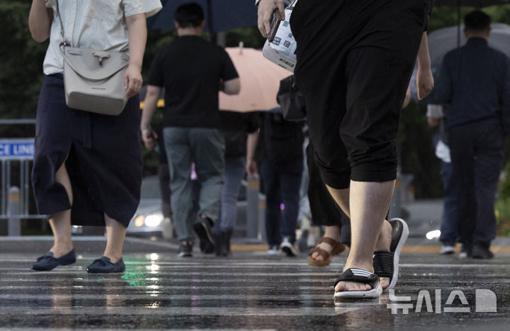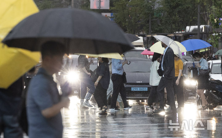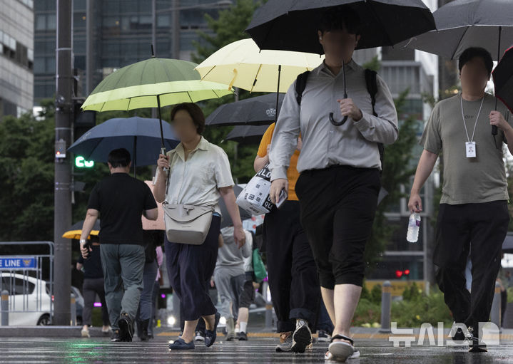 【NEWSIS】ソウル地域で強い雨が降った17日、ソウル市鍾路区の世宗大路で、傘をさして出勤する人々。