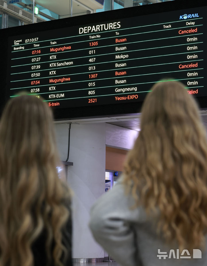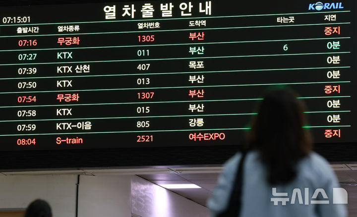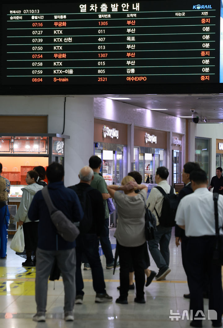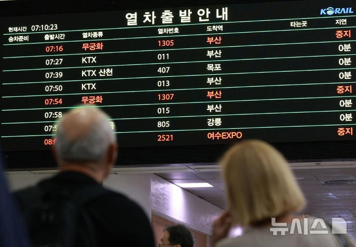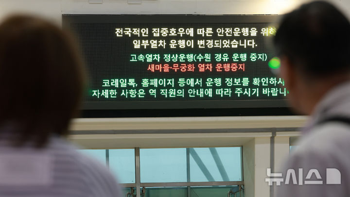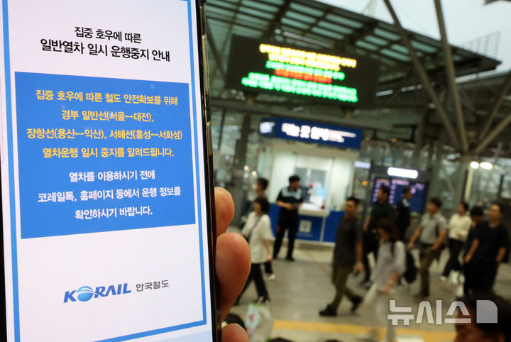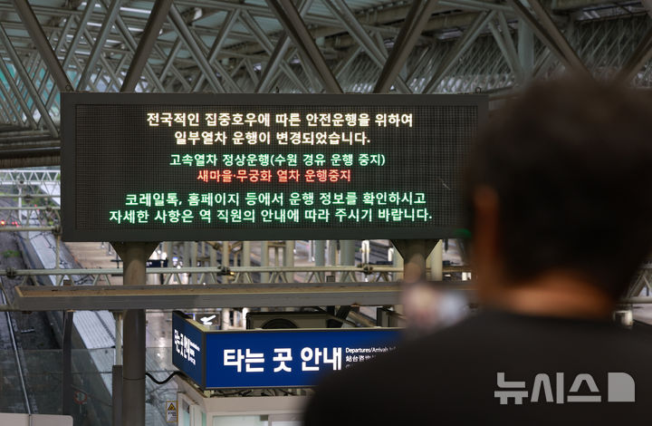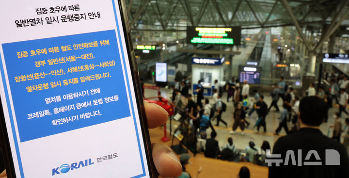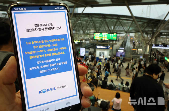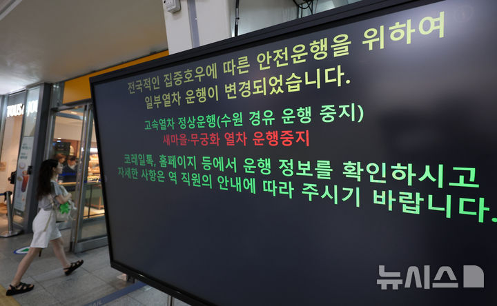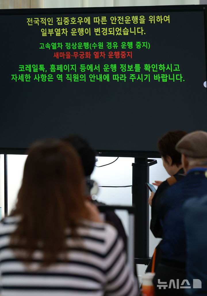 【NEWSIS】集中豪雨により韓国鉄道公社の京釜線一般線、長項線、西海線の列車運行が一時中止された17日午前、ソウル市竜山区のソウル駅には、運行中止案内が表示されていた。