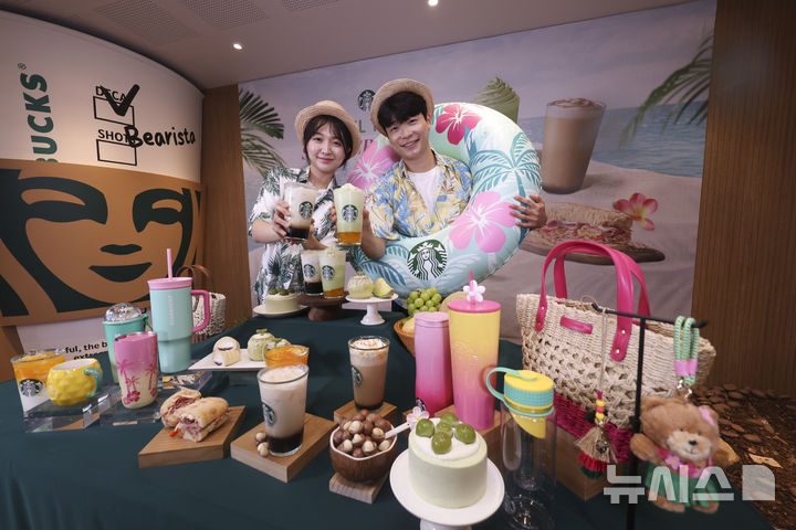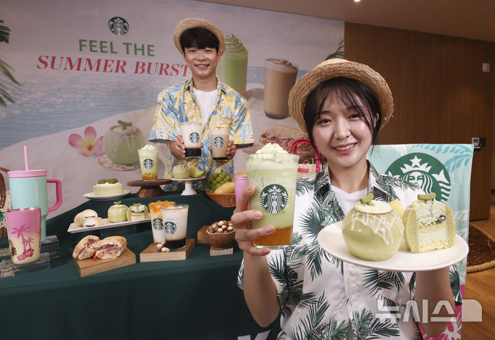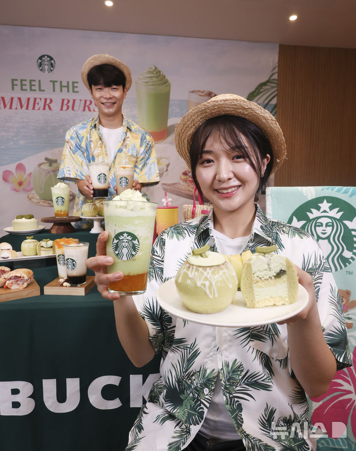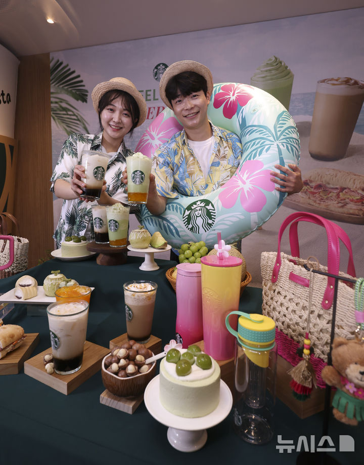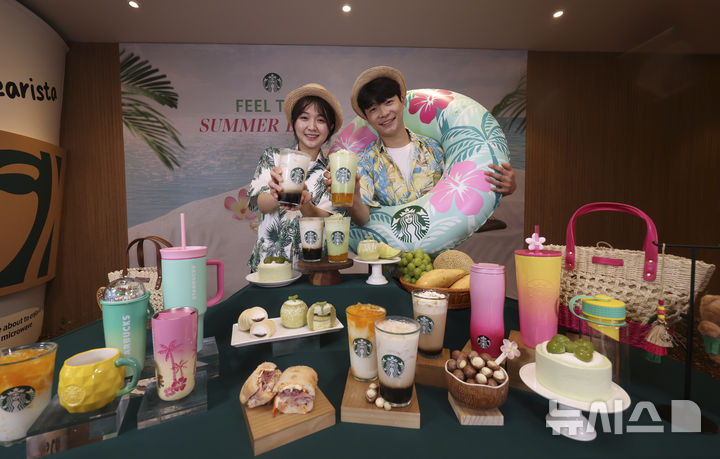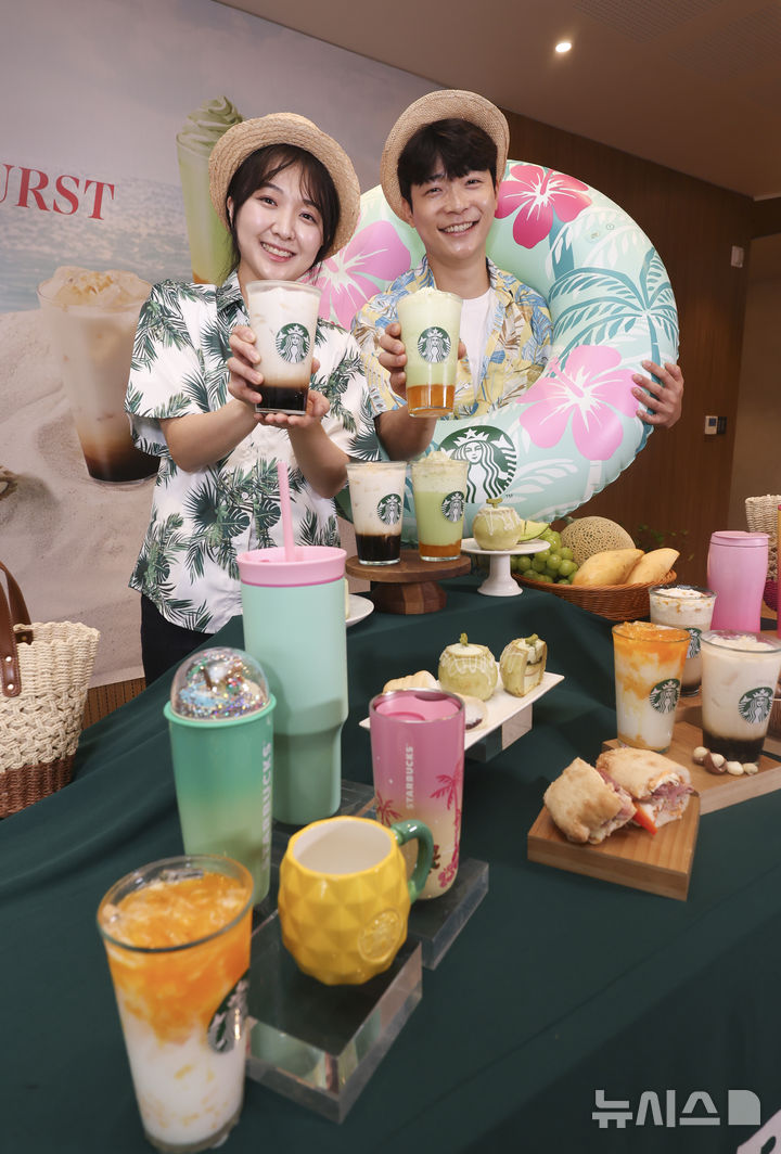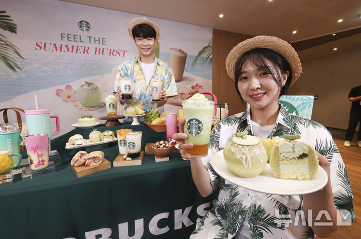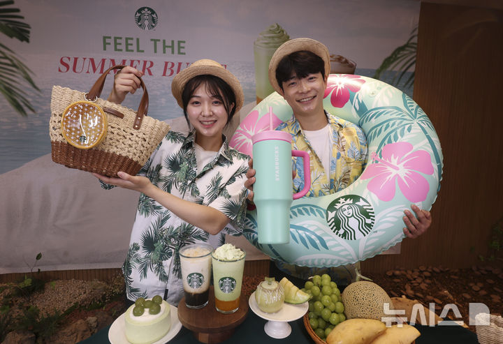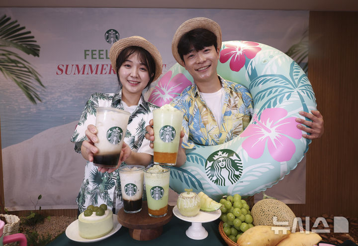 【NEWSIS】17日、ソウル市竜山区のスターバックス・ソウル駅アカデミーで開かれた「メロン・マンゴー・シャインマスカットなど旬のフルーツを活用した夏のプロモーション」で、ドリンクを手にしてみせるコンパニオン。