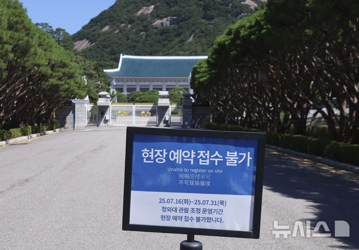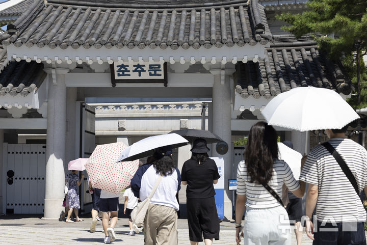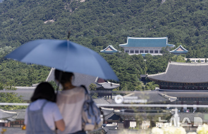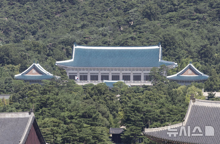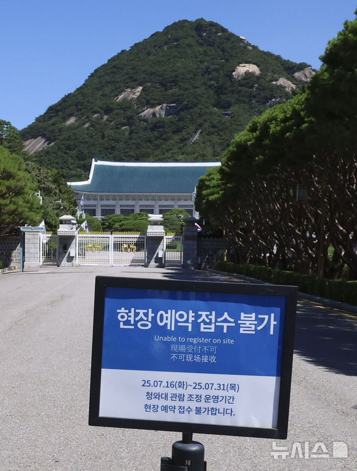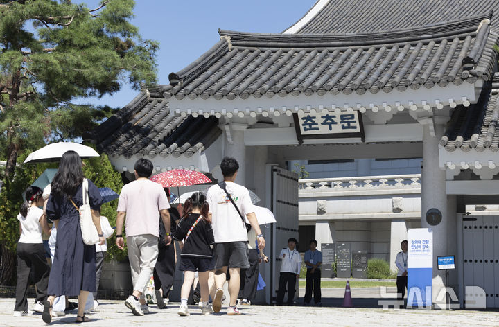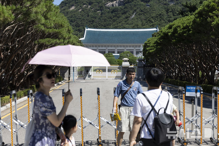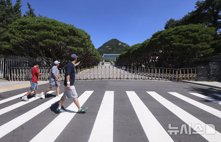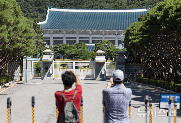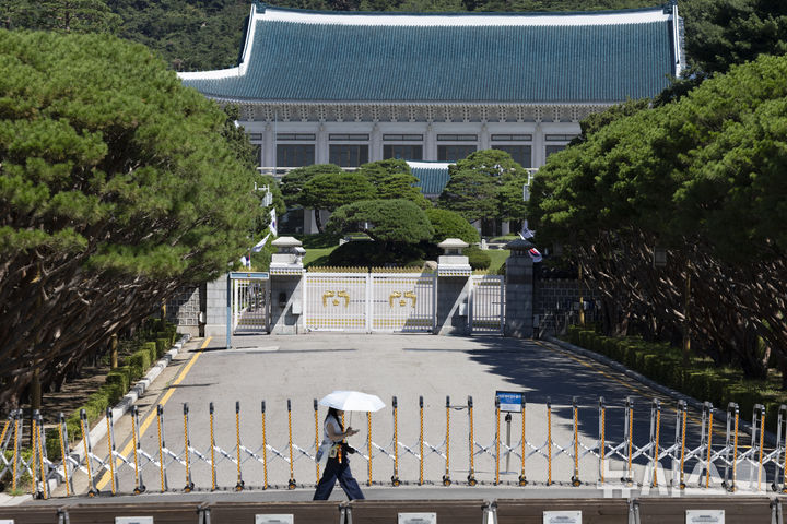 【NEWSIS】ソウル市内の青瓦台で、週末の一般公開としては最後だった27日、青瓦台本館の前を歩く人。李在明(イ・ジェミョン)政権は先月10日の閣議で、韓国大統領府を青瓦台に移転する計画を決定した。