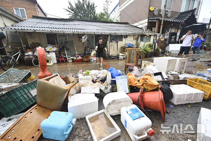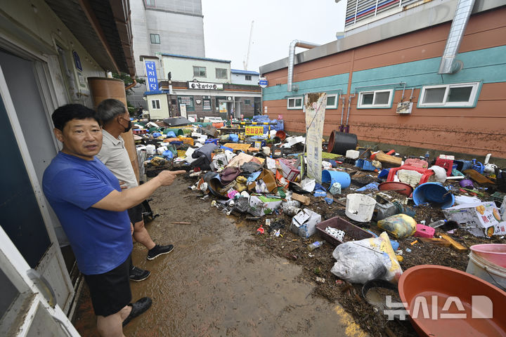 【NEWSIS】4日午前、全羅南道咸平郡咸平邑の咸平天地伝統市場近くの路地が、豪雨で流されてきたゴミで埋まってしまっている様子。咸平には前日大雨が降り、暫定的な被害集計によると住宅50棟・商店46カ所が浸水した。