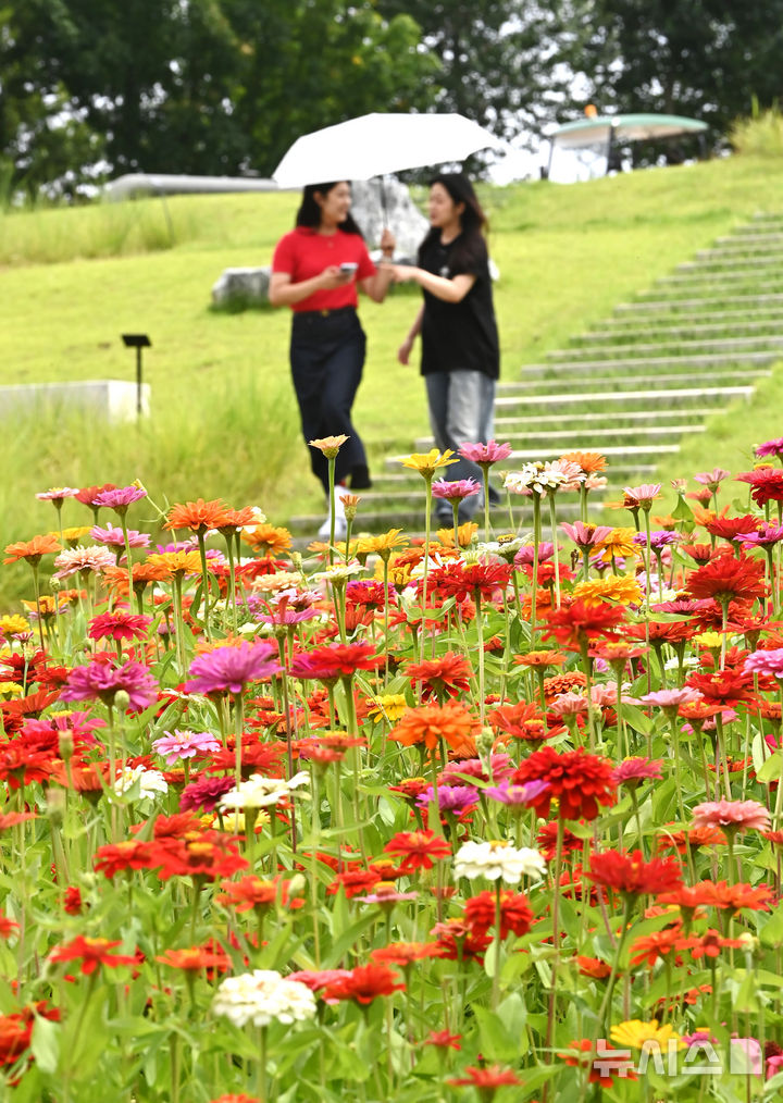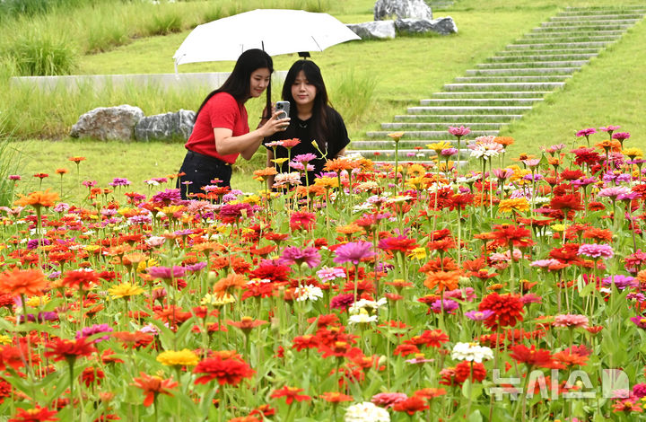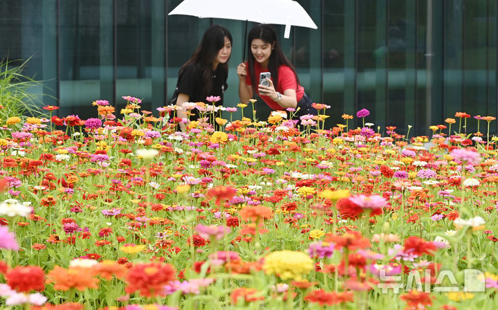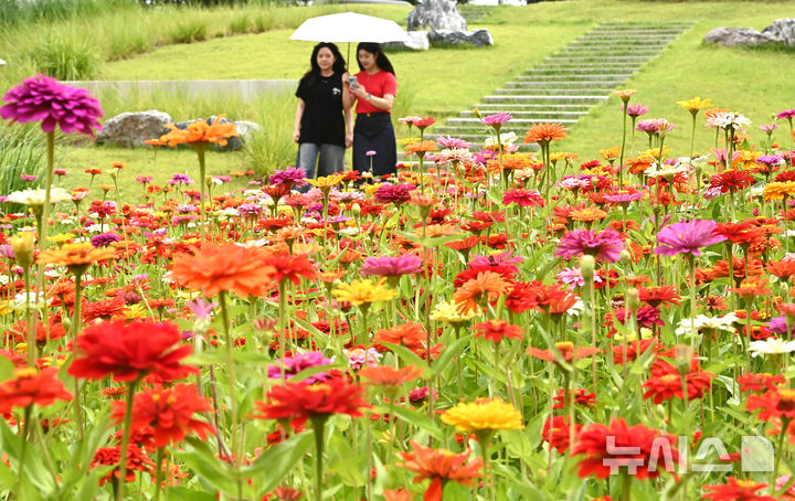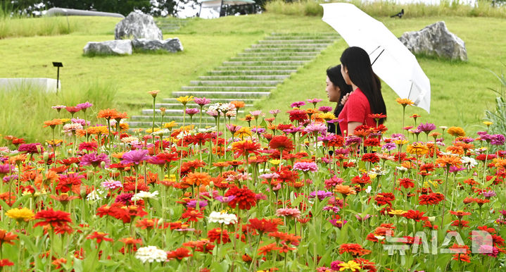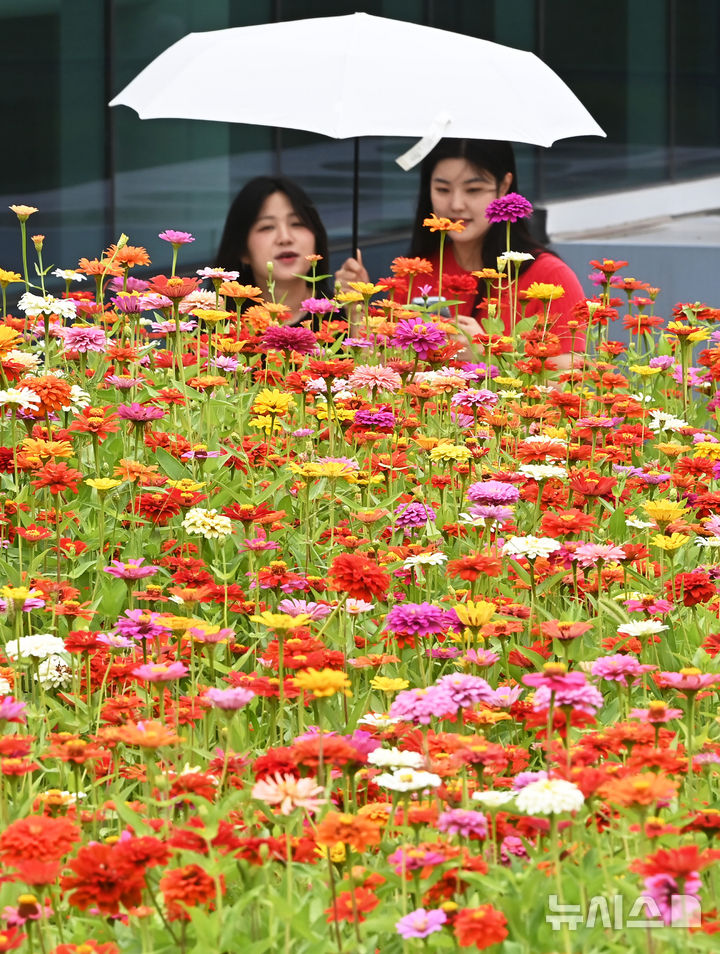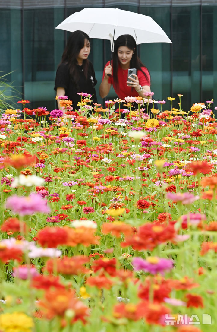【NEWSIS】二十四節気の一つである「立秋」があすに迫った6日、京畿道水原市勧善区の国立農業博物館では、色も形もさまざまなヒャクニチソウが大きく花開いていた。