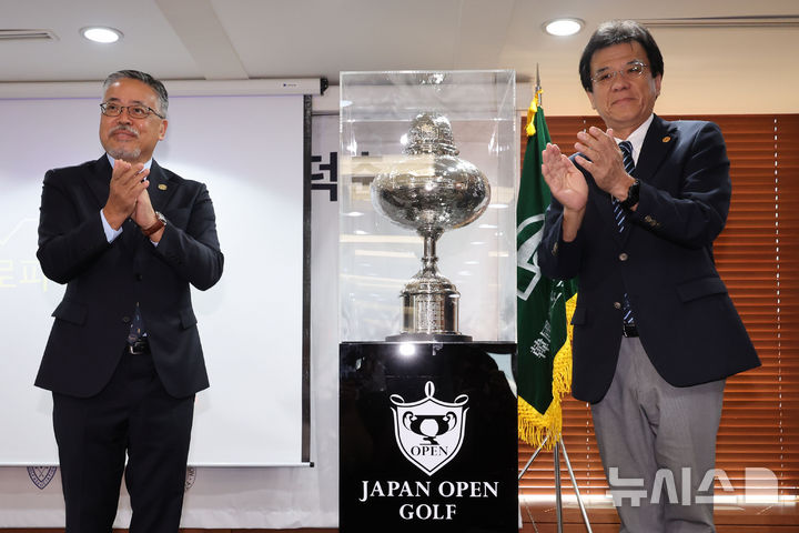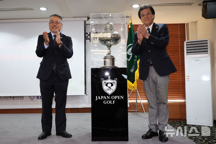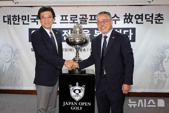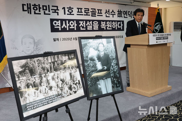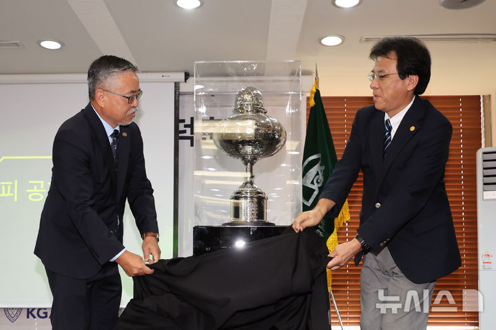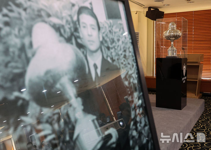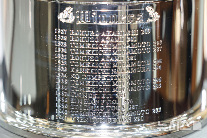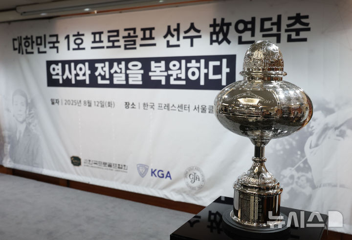 【NEWSIS】12日午前、ソウル市中区のプレスセンターで開かれた「大韓民国第1号プロゴルファー故・延徳春、歴史と伝説を復元する」イベントで、故・延徳春(ヨン・ドクチュン)さんの日本オープン優勝トロフィーの復元品が公開されている様子。