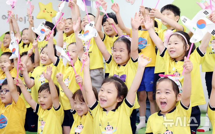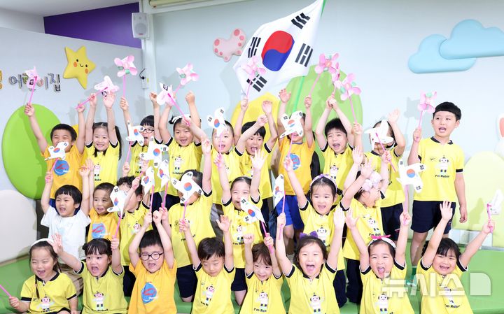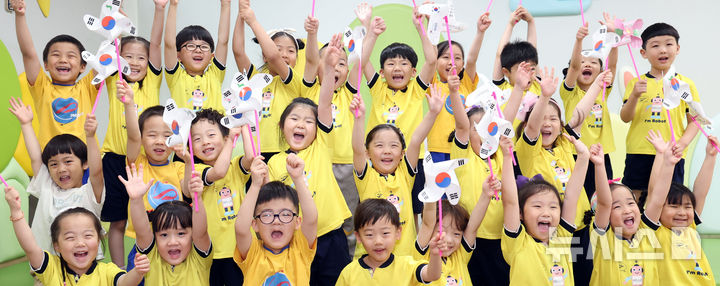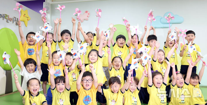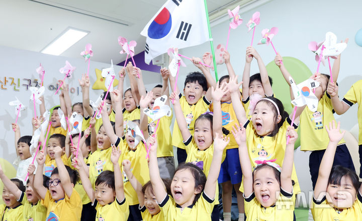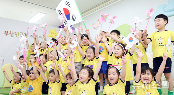 【NEWSIS】光復80周年の光復節まであと三日と迫った12日、釜山市釜山鎮区庁の職場オリニチプ(民間保育施設)で、園児たちが自ら作った「太極旗風車」を持って万歳を叫んでいる様子。