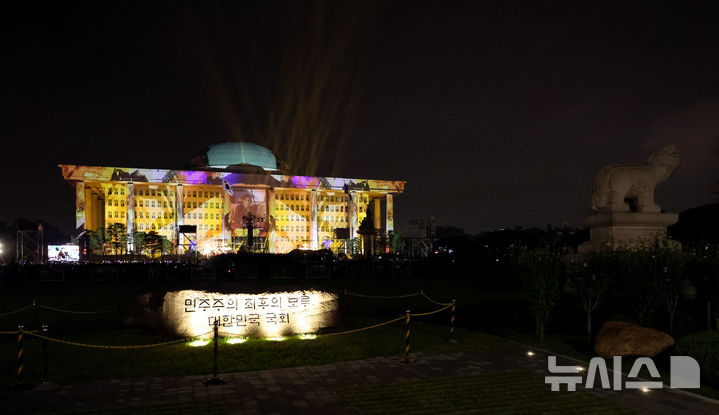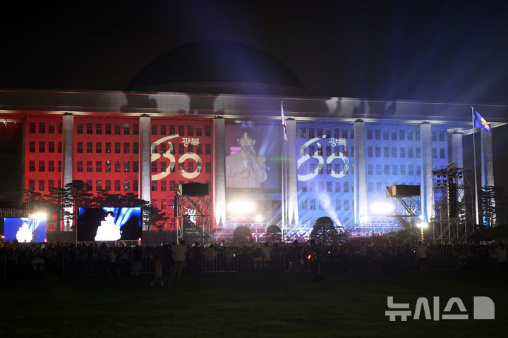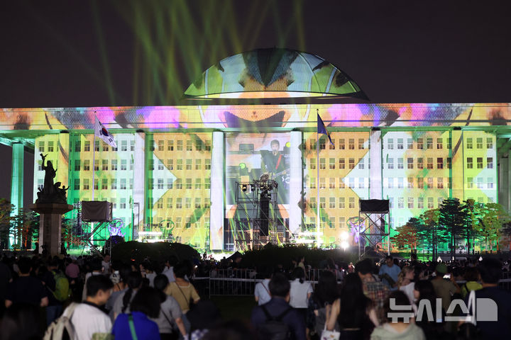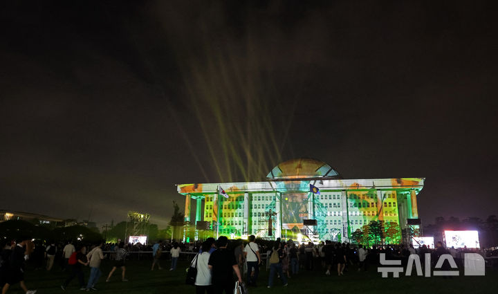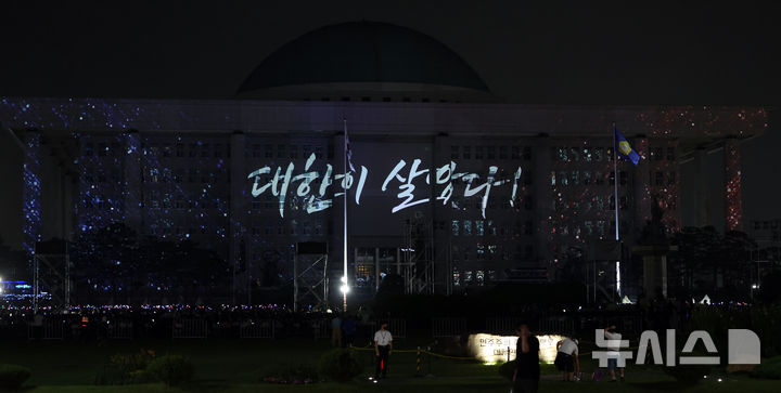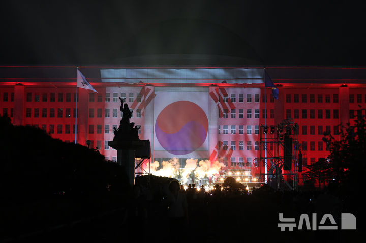 【NEWSIS】14日午後、ソウル・汝矣島の韓国国会議事堂で、光復(日本の植民地支配からの解放)80年前夜祭が行われた。写真はメディアファサード公演の様子。