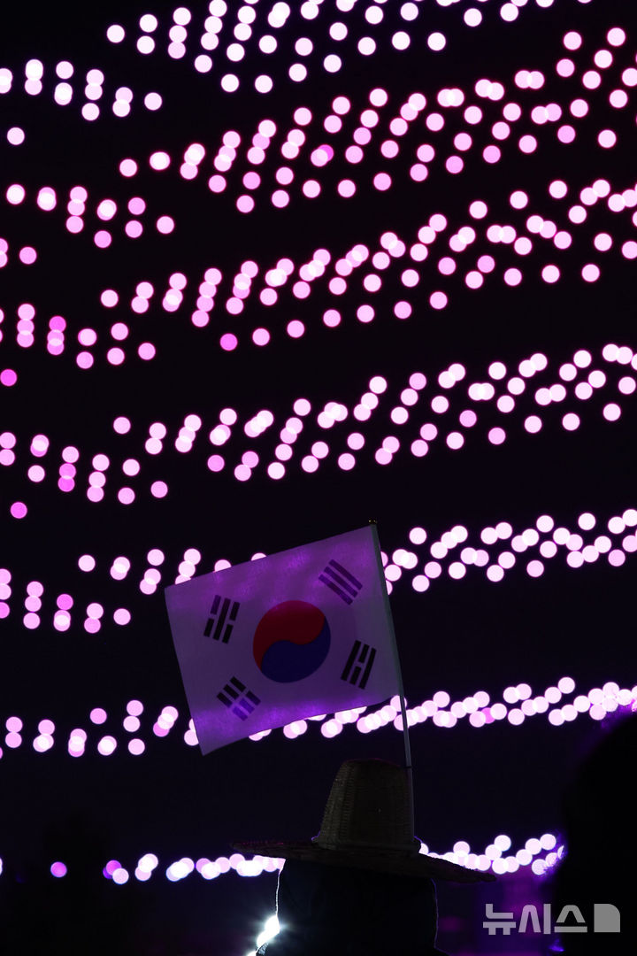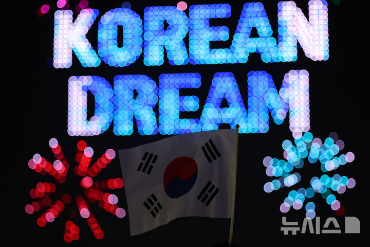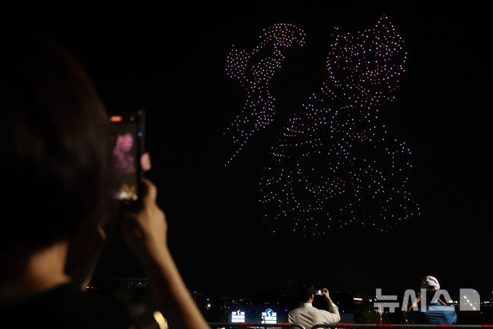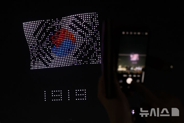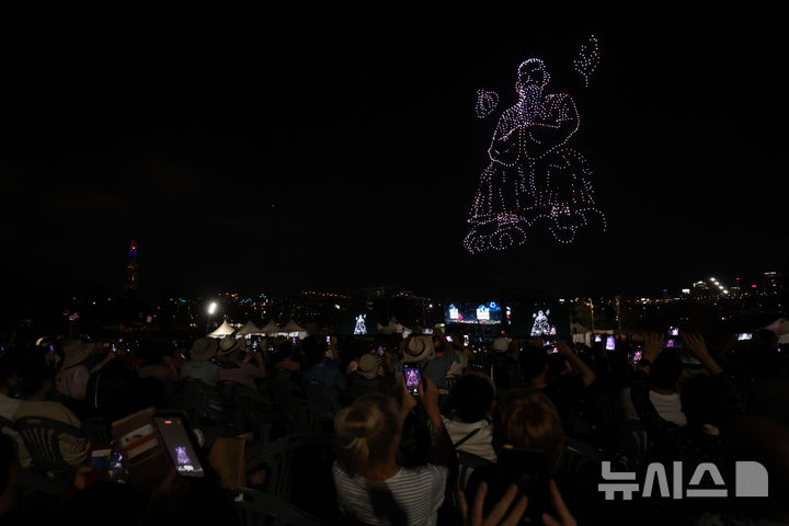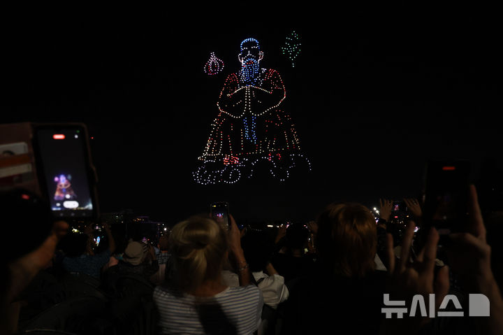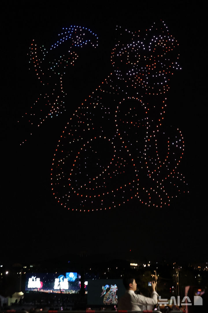 【NEWSIS】15日、ソウル市広津区のトゥクソム漢江公園で、「2025 コリアン・ドリーム漢江大祝祭」が行われた。写真はドローンショーの様子。