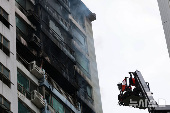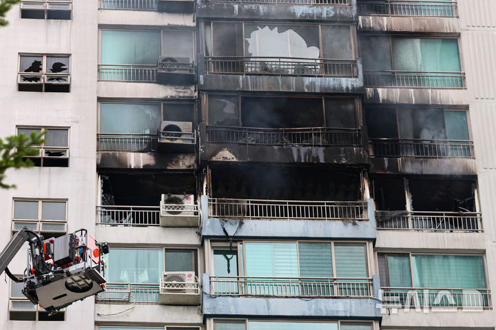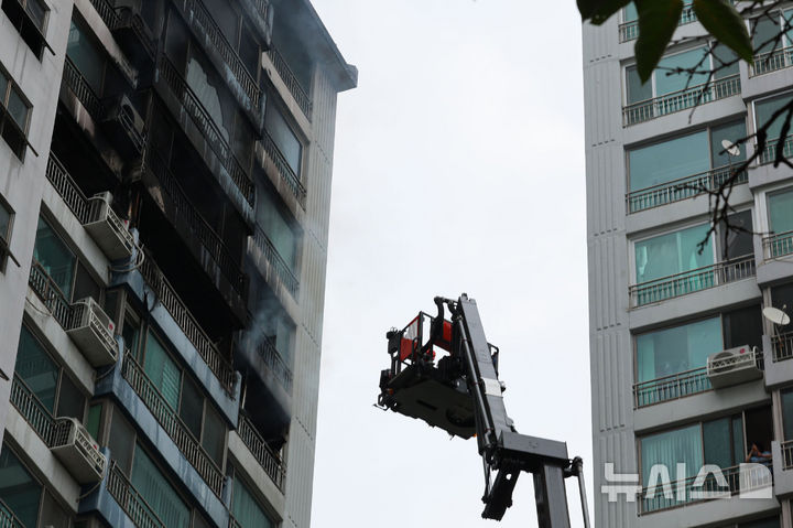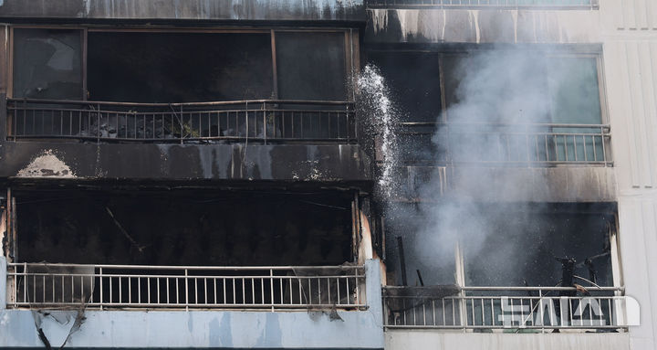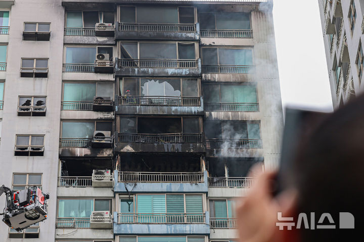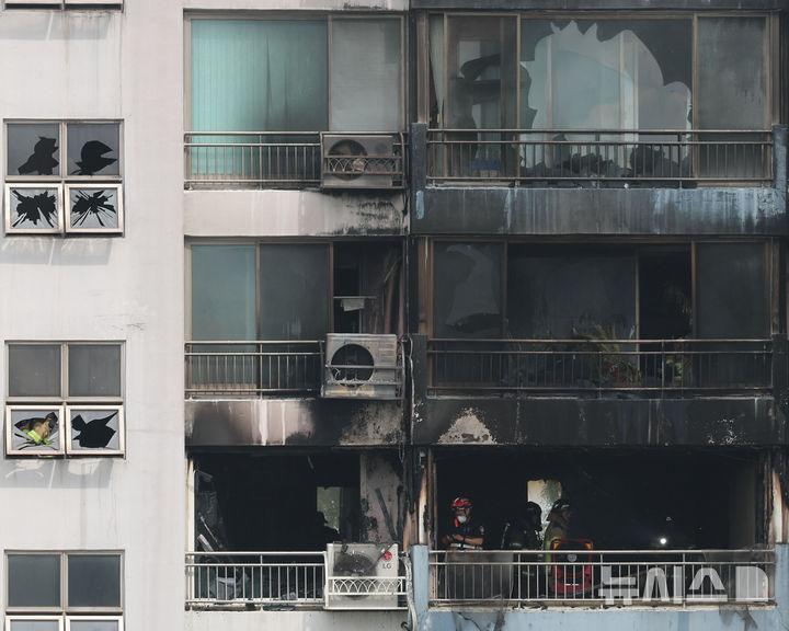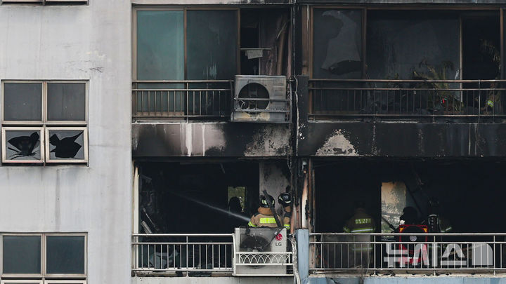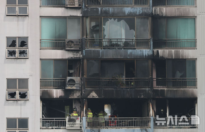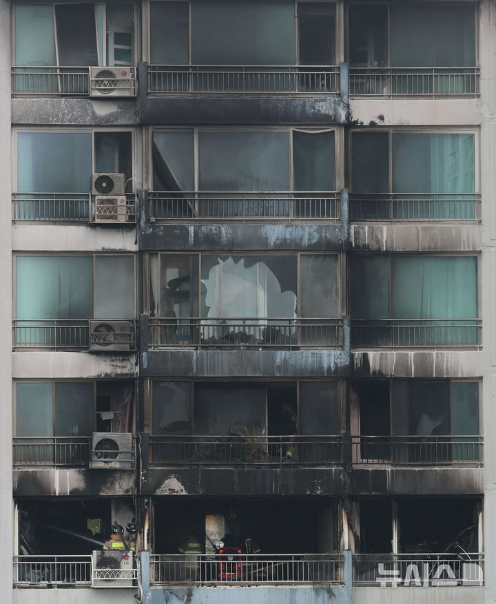 【NEWSIS】17日、ソウル市麻浦区内のあるマンションで火災が発生した。写真は残火処理に当たる消防隊員たち。
