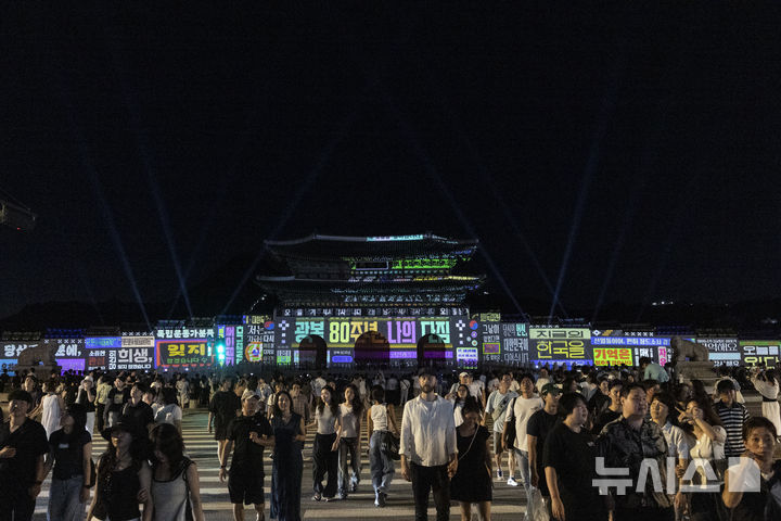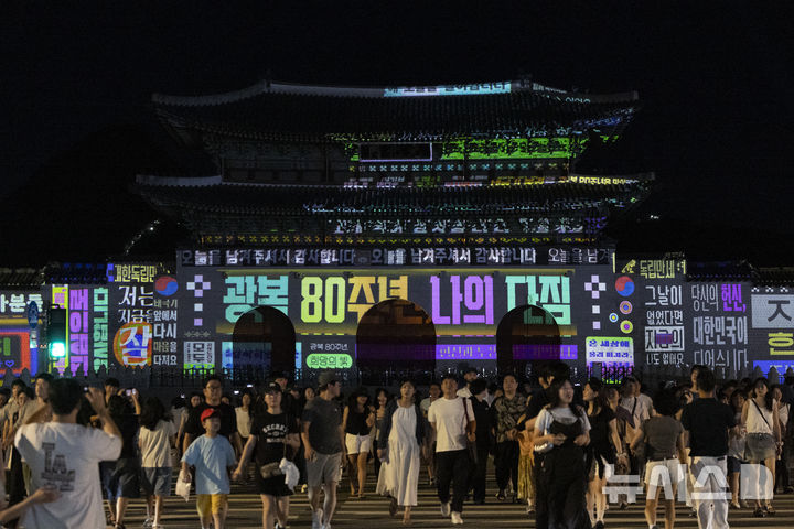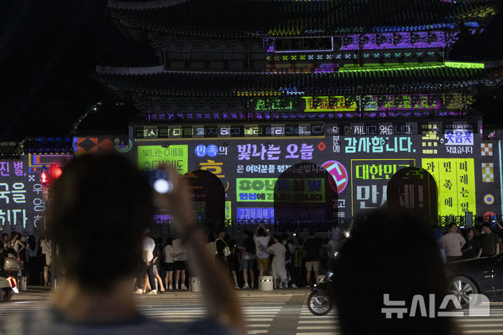 【NEWSIS】16日、ソウル市鍾路区の光化門広場で、光復(日本による植民地支配からの解放)80年光の祭典「80個の光、一つになった私たち」の一環として光化門外壁に照らし出されたメディアファサード作品。
